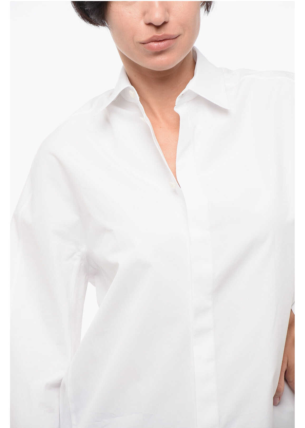French collar Sleeves with buttons Long sleeves Buttons Hidden closure Front closure White Made in Italy Spring-Summer Materials: 100%CO Product code: P628505 Model is wearing size 34 Model measurements Height: 177 cm Chest: 91 cm Waist: 62 cm Hips: 92 cm