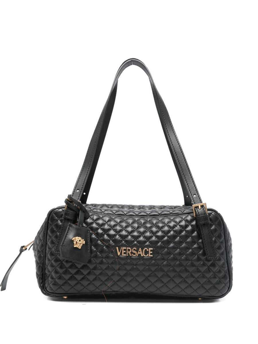 Versace black quilted leather bowling shoulder bag with zip closure, is embellished with the gold metal logo and can be worn on the shoulder or by hand thanks to the adjustable leather handles with removable leather key ring with hardware