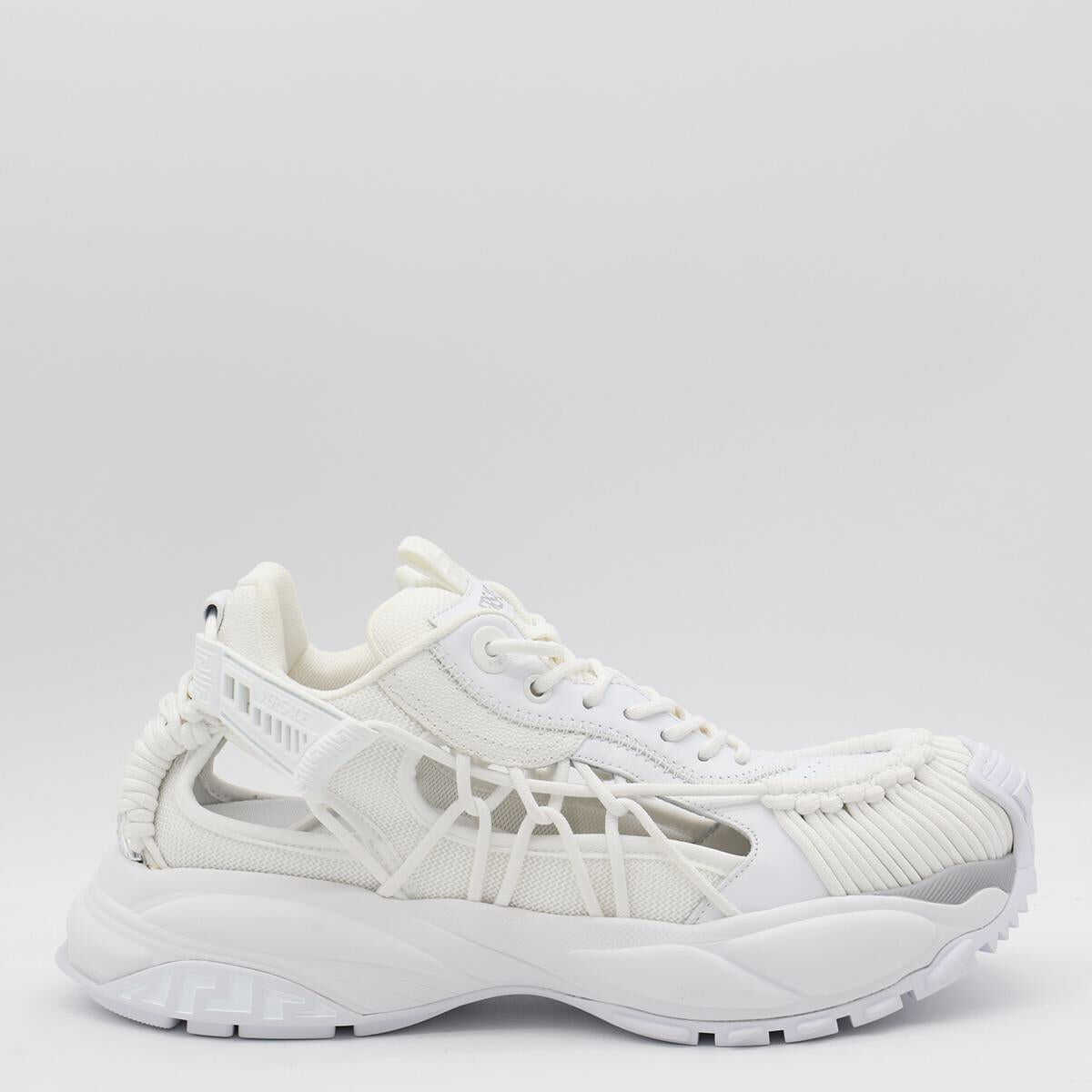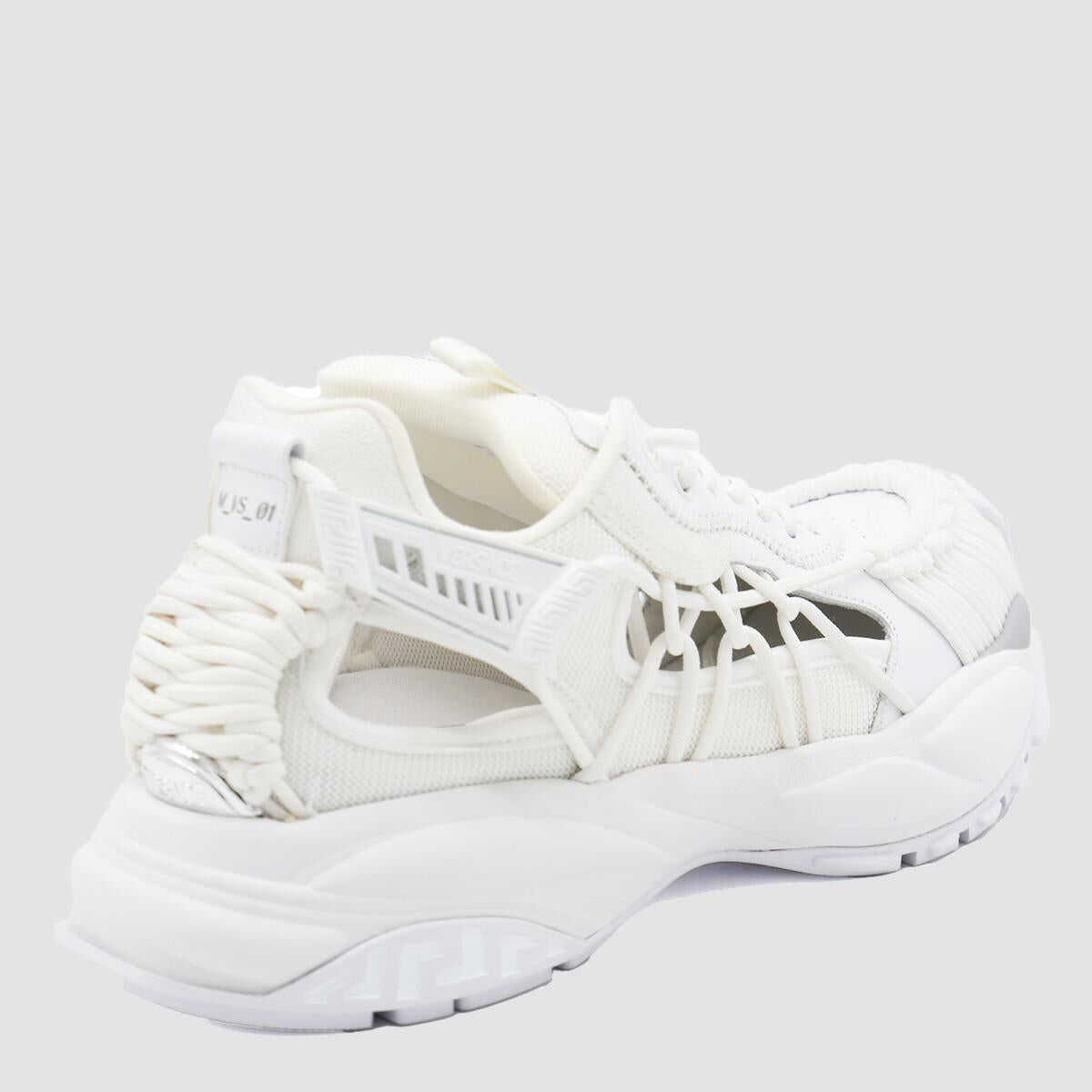 White sneakers from Versace featuring round toe, cotton laces, oversize sole and lateral details.