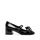 Black calf leather patent finish bow detailing side button fastening 60mm block heel square toe branded leather insole leather sole
