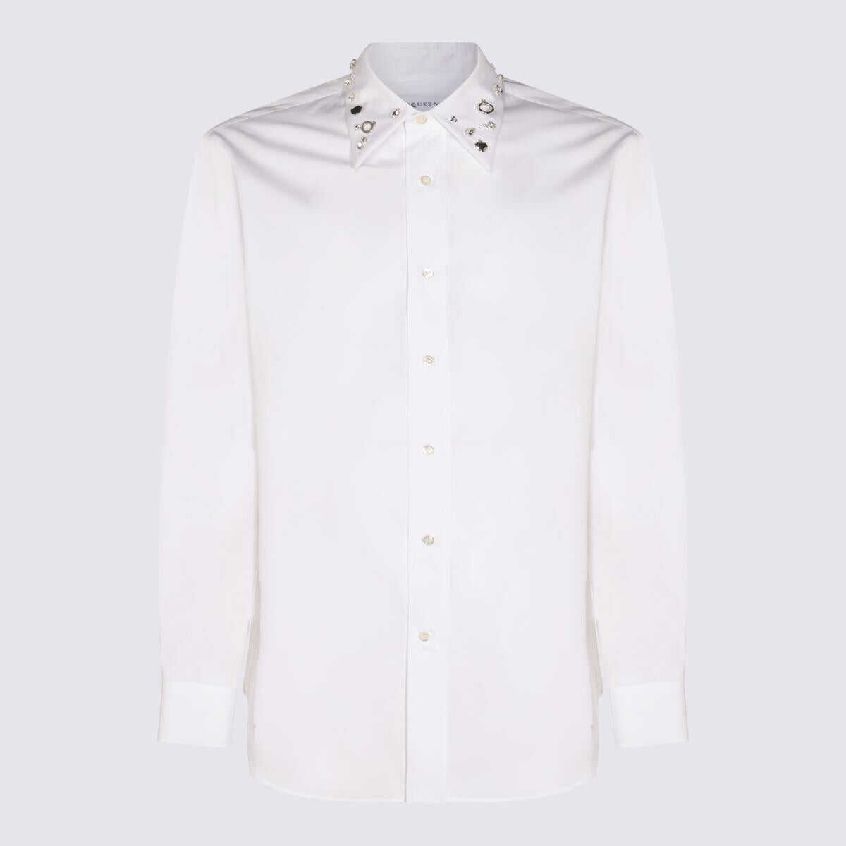 White cotton shirt from McQueen featuring long sleeves, shirt collar with silver tone embellishement, buttons fastening and regular vestibility.