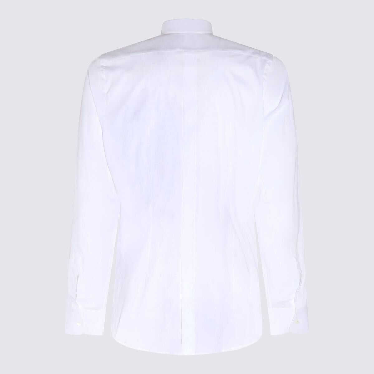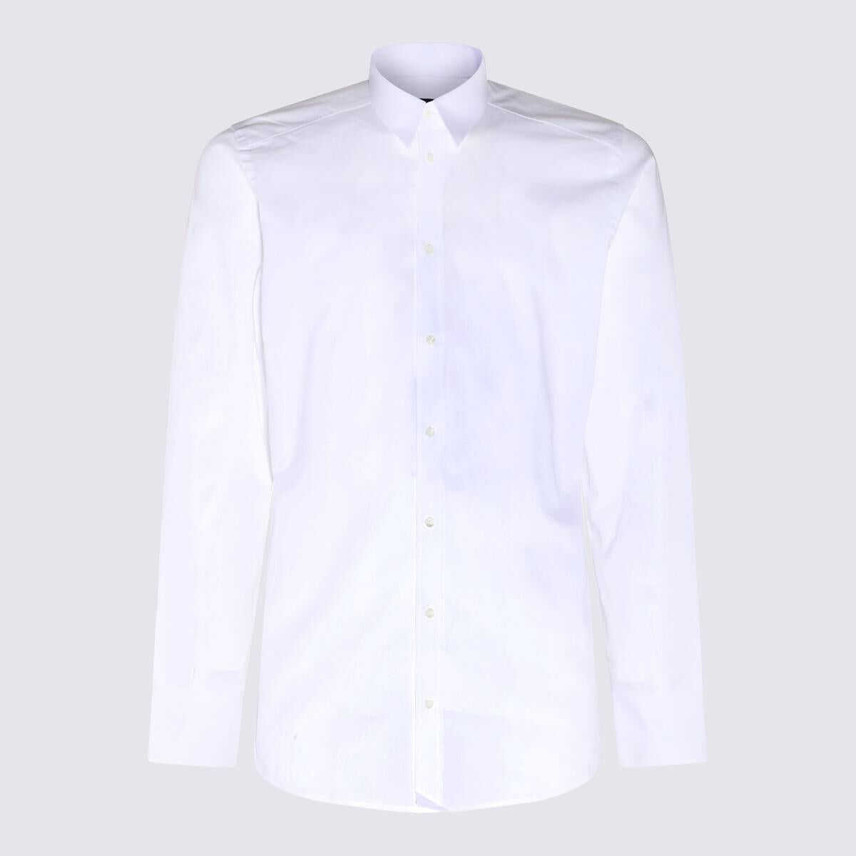 White cotton blend shirt from Dolce&Gabbana featuring pointed flat collar, front button fastening, box-pleat detail, long sleeves, buttoned cuffs and curved hem.