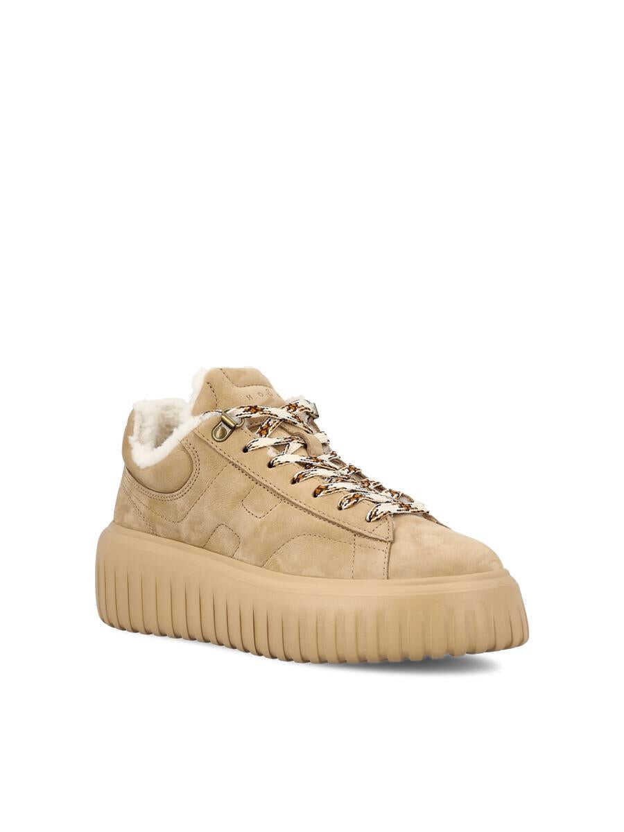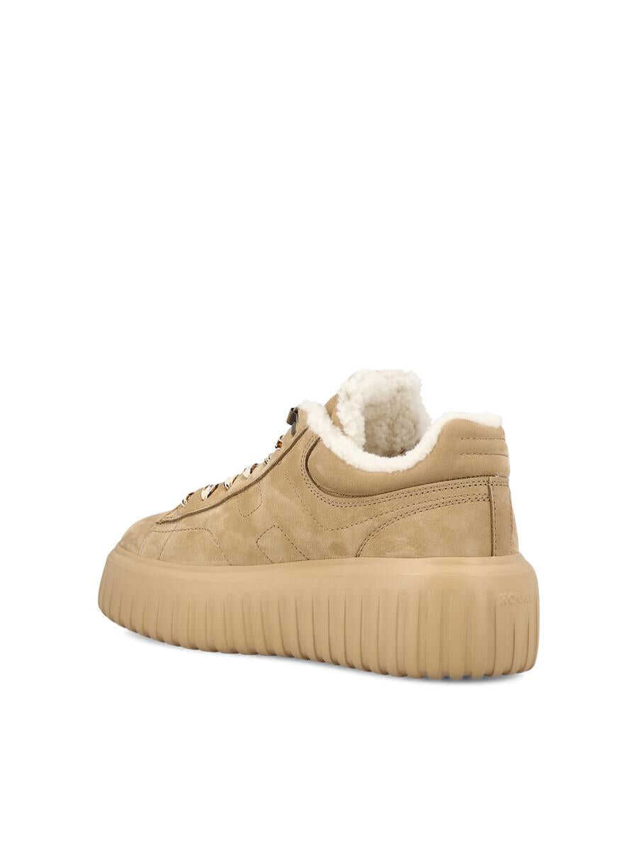 Women's Hogan H-Stripes sneakers made of suede with technical fabric inserts and the iconic contrasting side H. The interior is lined with soft synthetic fur, which ensures thermal comfort and a snug feel. The raised sole completes a contemporary and casual design, ideal for the colder season. - Upper: 100% suede leather - Color: beige - 8 mm memory foam insole - EVA sole - H side - Nappa leather details - Made in Italy - Box included - Item code: HXW6450FN3G6RNC808