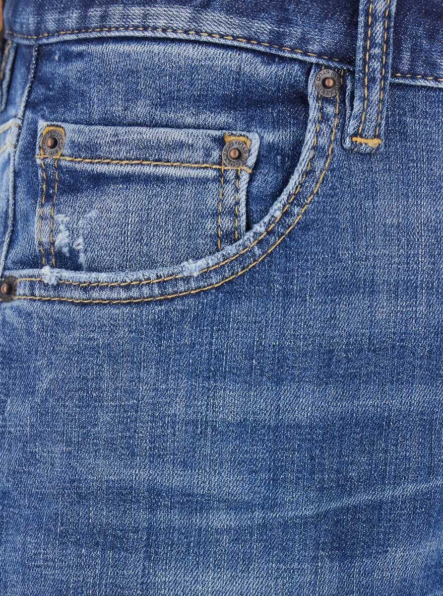 Dsquared2 jeans crafted from blue stretch cotton denim with a distressed finish. Featuring a metal button closure, belt loops, five classic pockets, and a logo patch on the back.