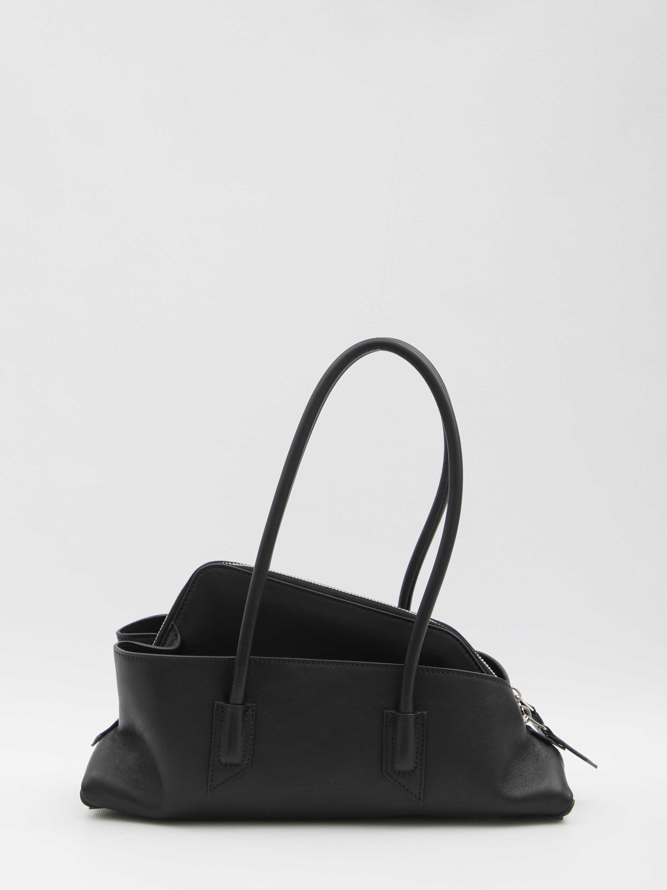 Calf leather bag in black color. Features an internal zip pocket, metal details and leather pull tabs, tubular handles, base feet detail. Dustbag included.