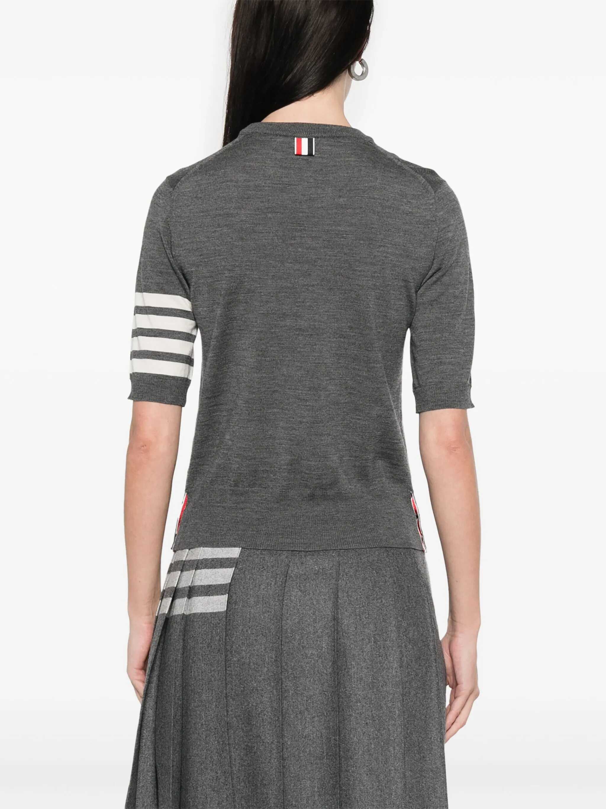 Thom Browne's knit T-Shirt is a garment with a clean and distinctive style. With a ribbed crew neck and hems, it features the brand's iconic bands on the left sleeve, a detail that underscores its unique identity. The ribbed hem with slight side slits adds a touch of modernity and comfort, making it perfect for a casual yet sophisticated look. A versatile must-have for any wardrobe.