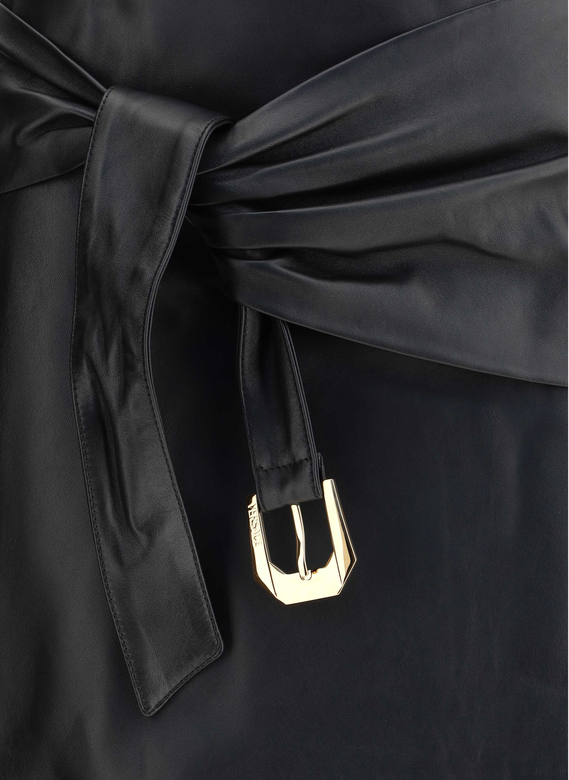 The Versace lambskin Miniskirt is a bold and sophisticated piece, enriched by an elegant decorative knot on the front that adds dynamism to the design. Crafted from soft leather, it features a zip fastening on the back for a precise and sensual fit, in perfect Versace style.