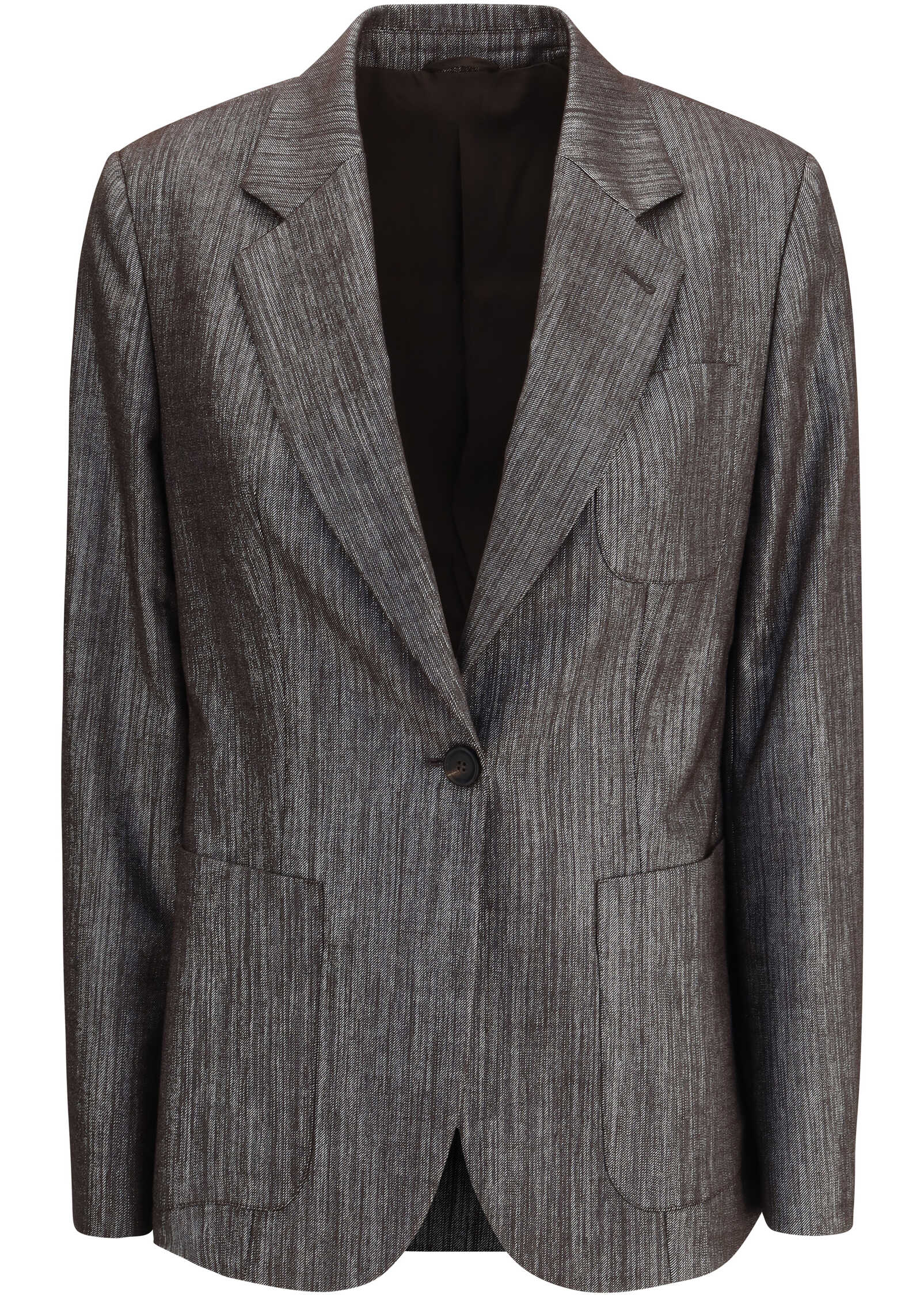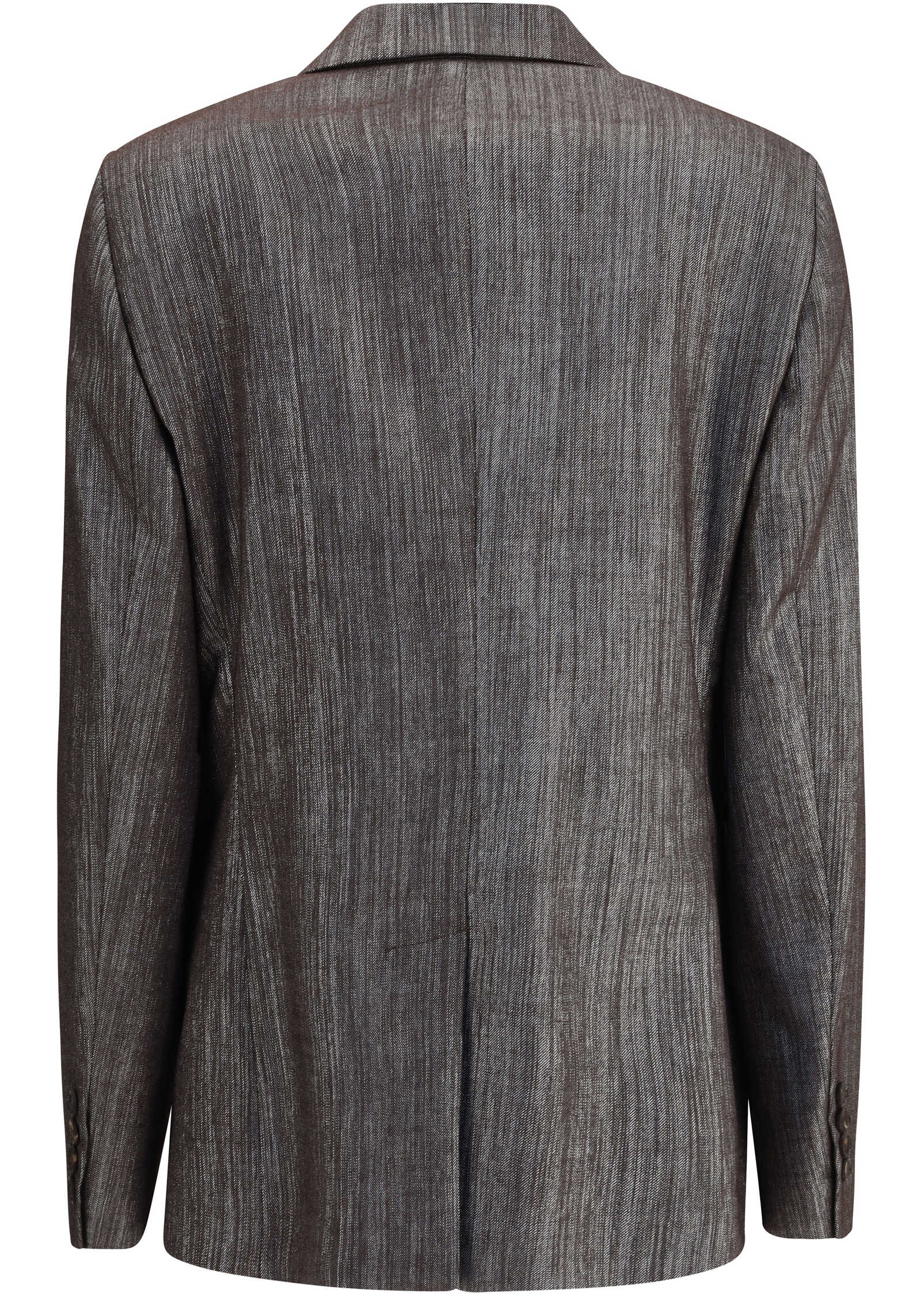 Brunello Cucinelli's Blazer is a refined garment that combines traditional tailoring with a touch of contemporary flare. Made of lurex fabric, it brings discreet and sophisticated shine to the look. It features a button closure, classic lapels, a chest pocket and two patch pockets on the front. The back slit ensures comfort in movement, while the partially lined construction maintains its lightness. Perfect for completing both formal and casual-chic outfits with elegance.