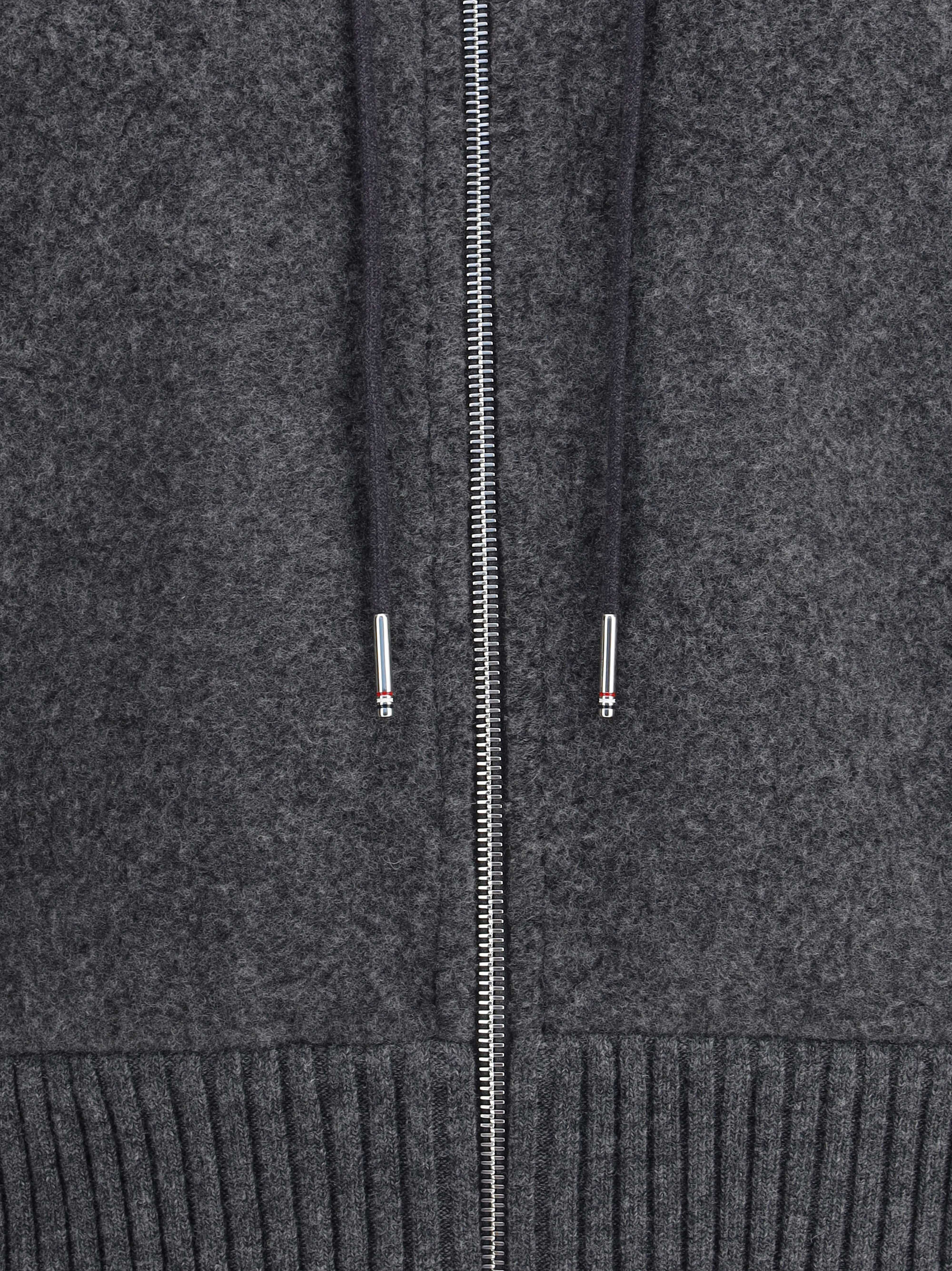 Wool Sweatshirt by Thom Browne with adjustable drawstring hood and ribbed hem. The style features a double-slider front zipper closure, two side welt pockets, and ribbed cuffs and hem for a comfortable fit and a refined design.
