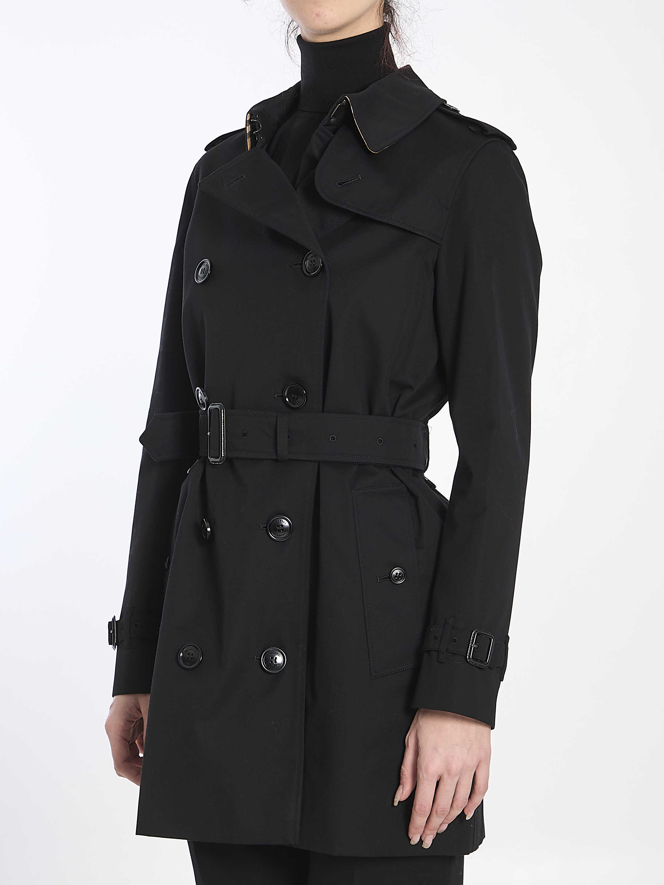 Short Heritage Kensington trench coat in water-resistant black cotton gabardine. It features double-breasted button closure, hook-and-eye collar closure, throat latch, epaulettes, belt with tonal buckle, two side button welt pockets, belted cuffs, back button vent, Burberry Check lining and undercollar.