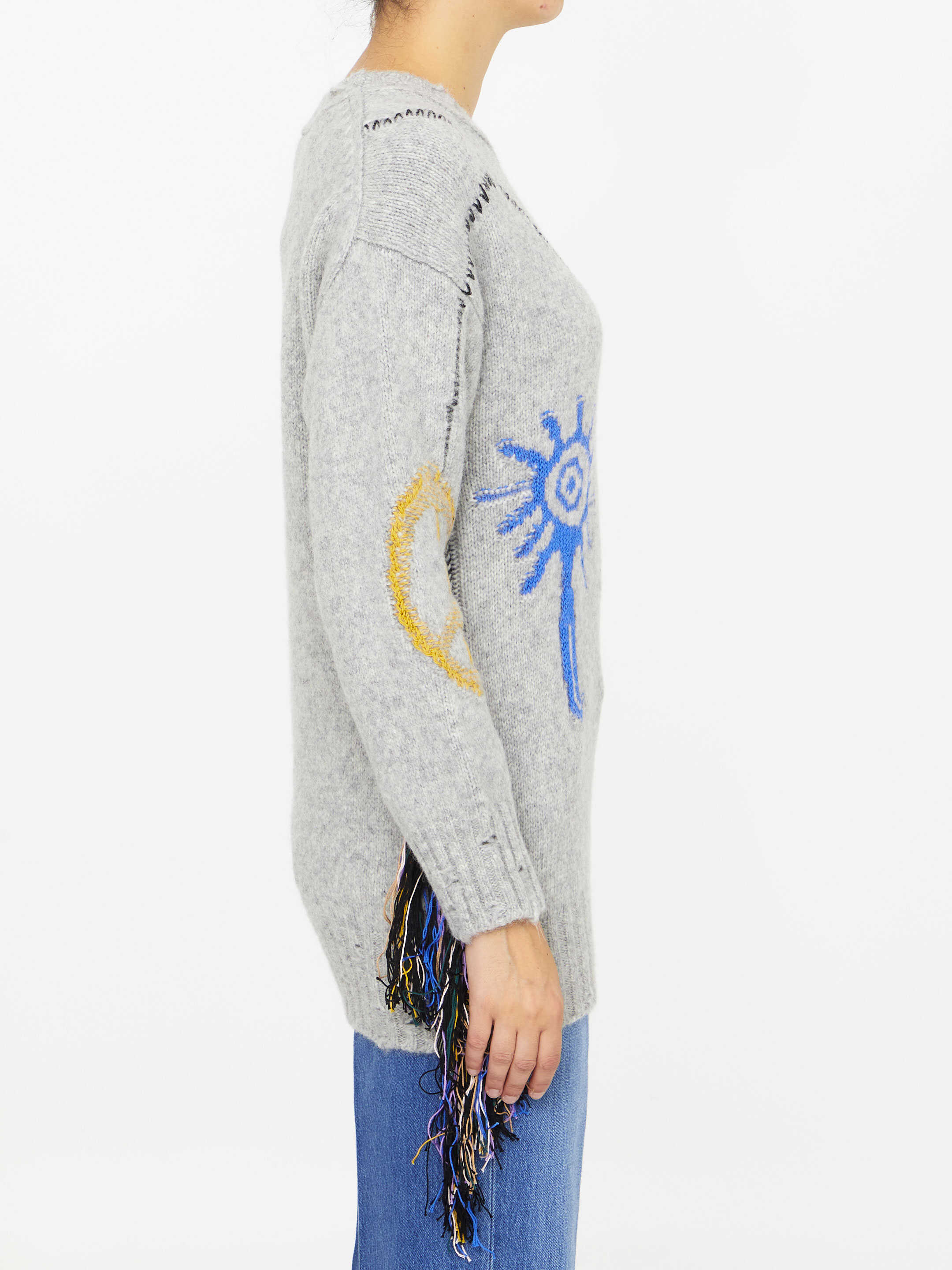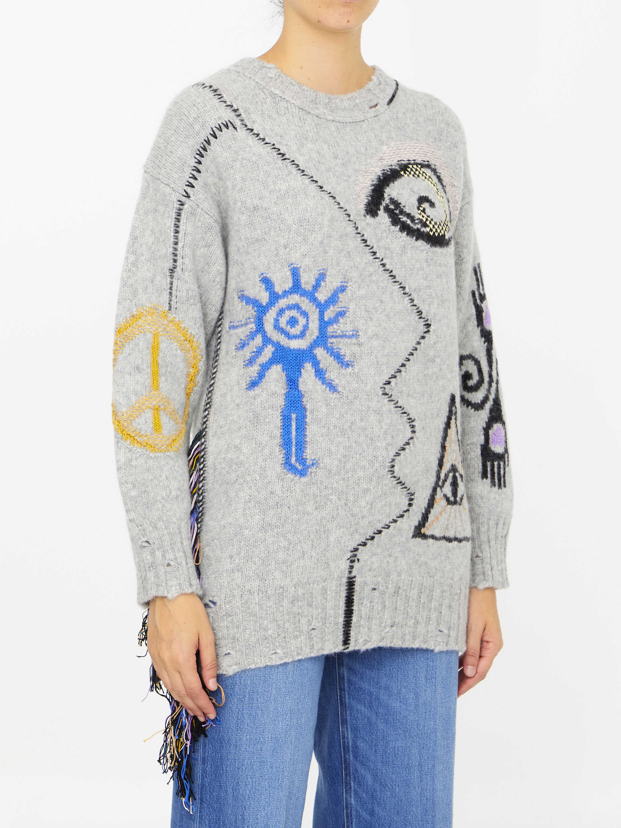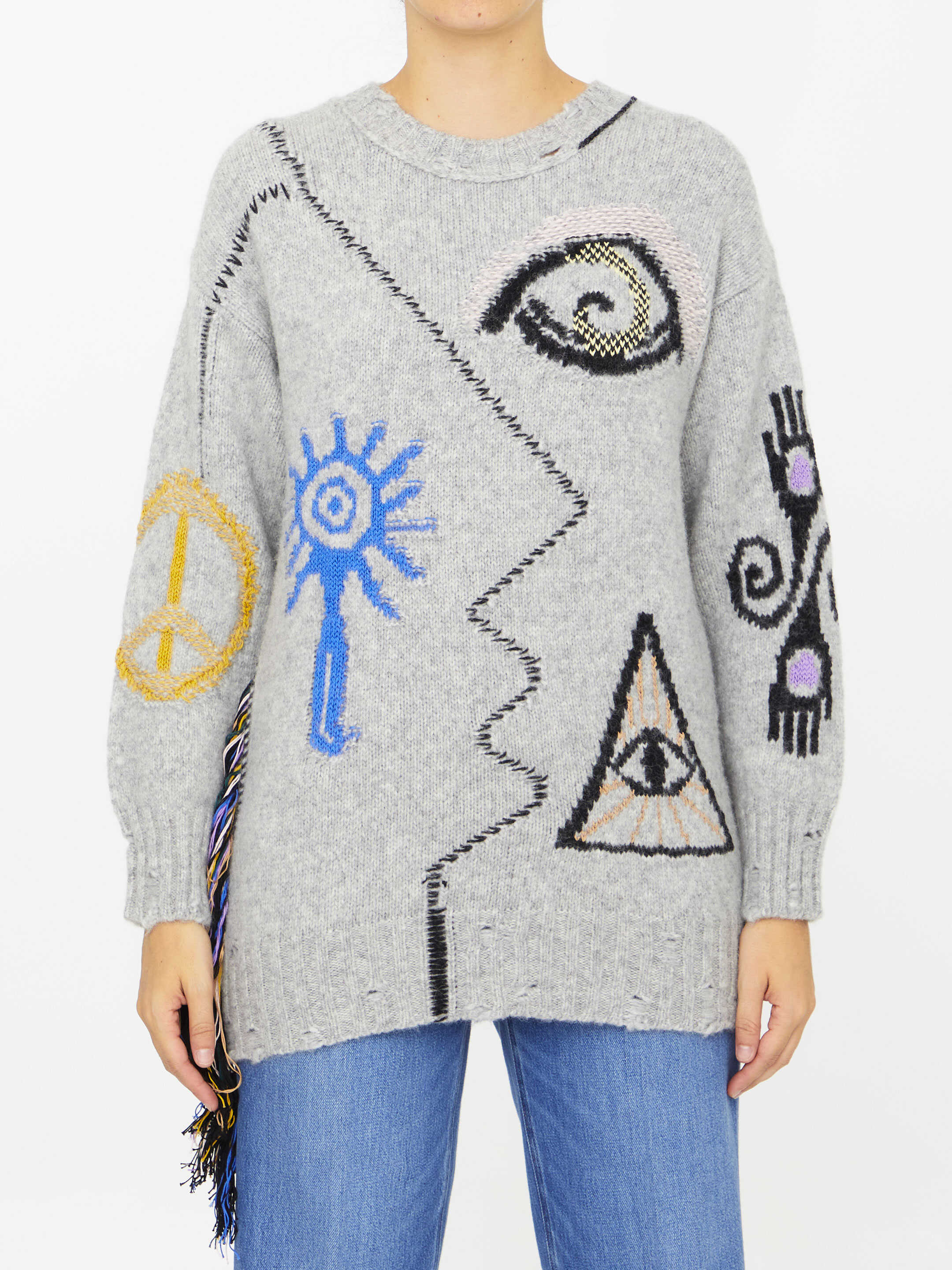 Long-sleeved crewneck jumper in grey alpaca wool blend with multicolor folk-inspired embroideries. Ribbed neck, cuffs and hem. Oversized fit.