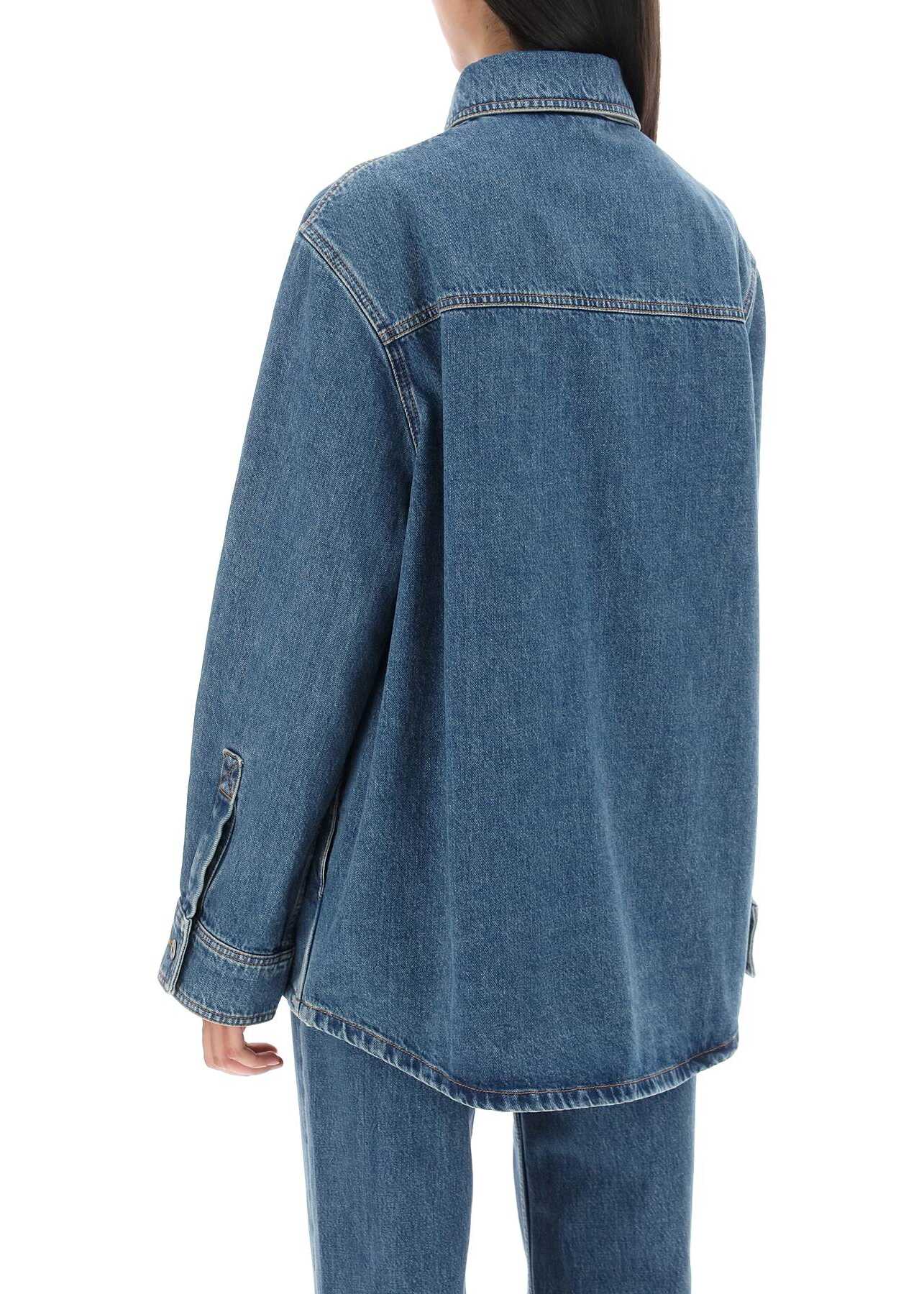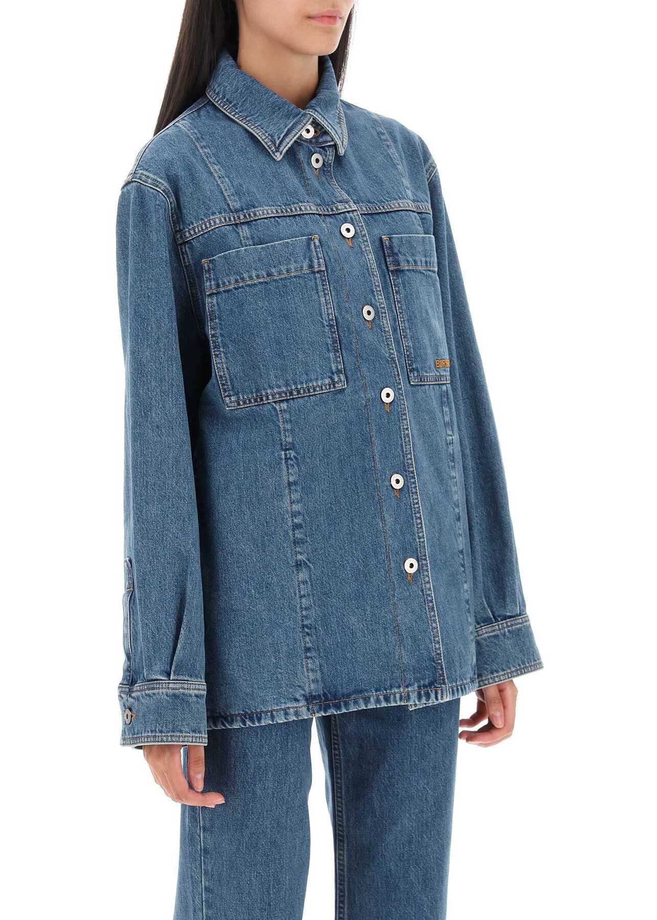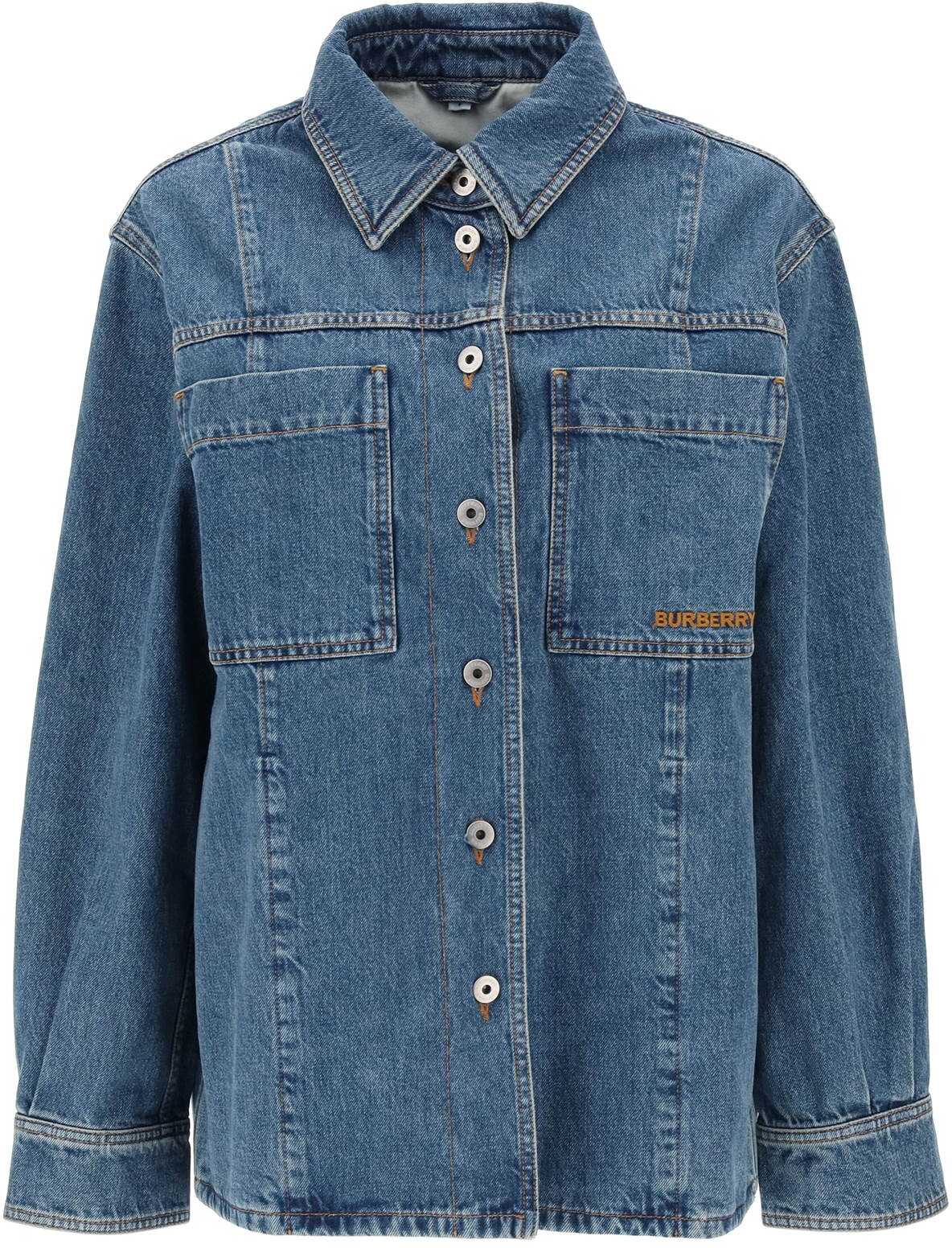 Bensen overshirt by Burberry crafted in solid cotton denim with medium vintage wash. It features classic collar, front button fastening and patch pockets at chest one of which decorated with embroidered logo lettering. Oversized fit with trapeze cut. The model is 177 cm tall and wears size S.