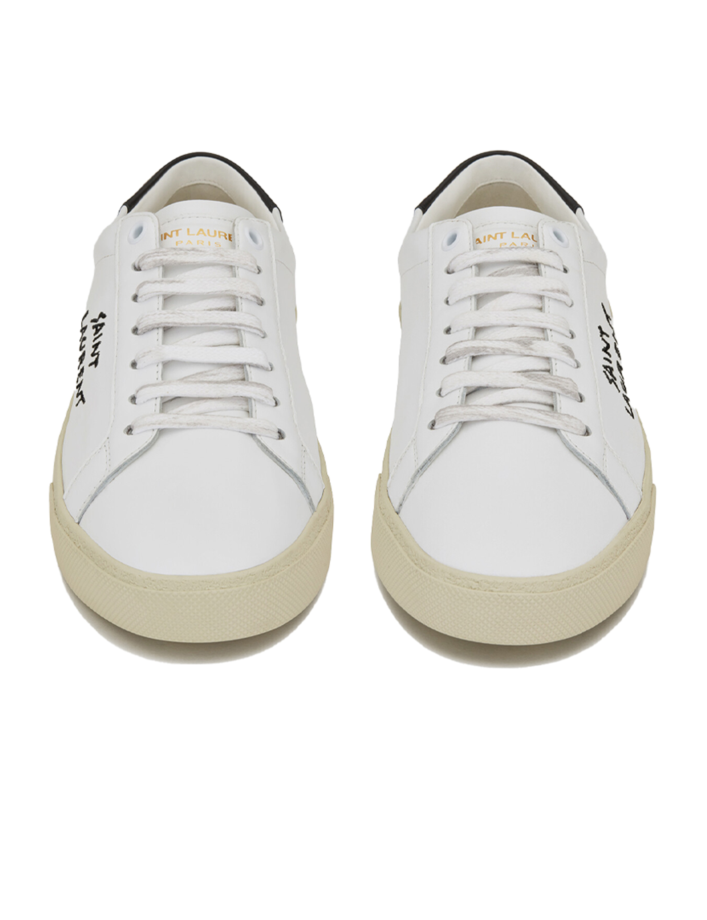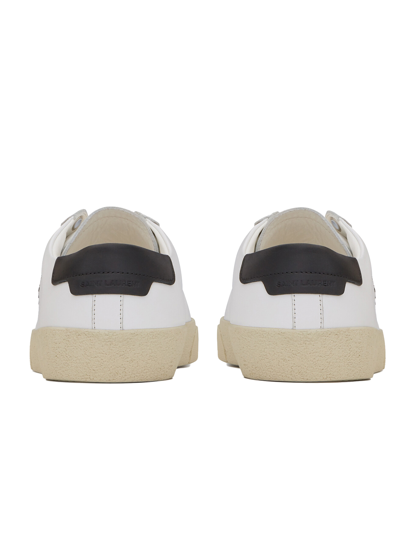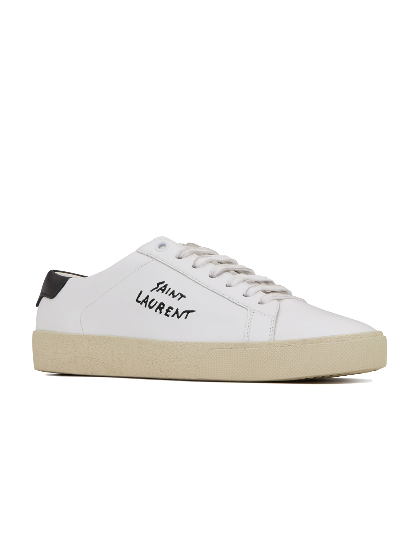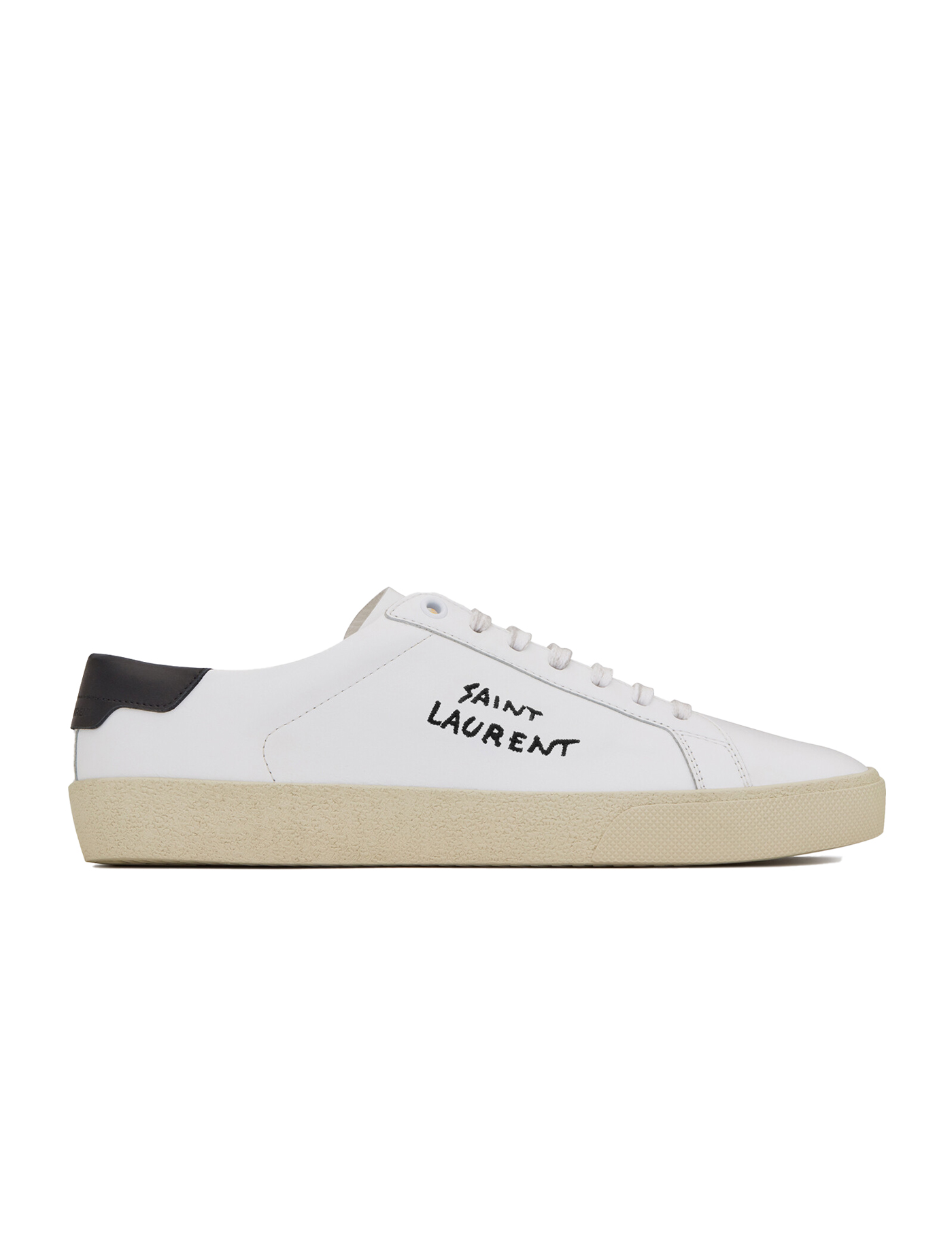 Calfskin Sneakers by Saint Laurent, round toe on front, lace-up front fastening, leather tongue with iconic brand signature pressure print, contrasting iconic brand monogram on side panel, flat sole.