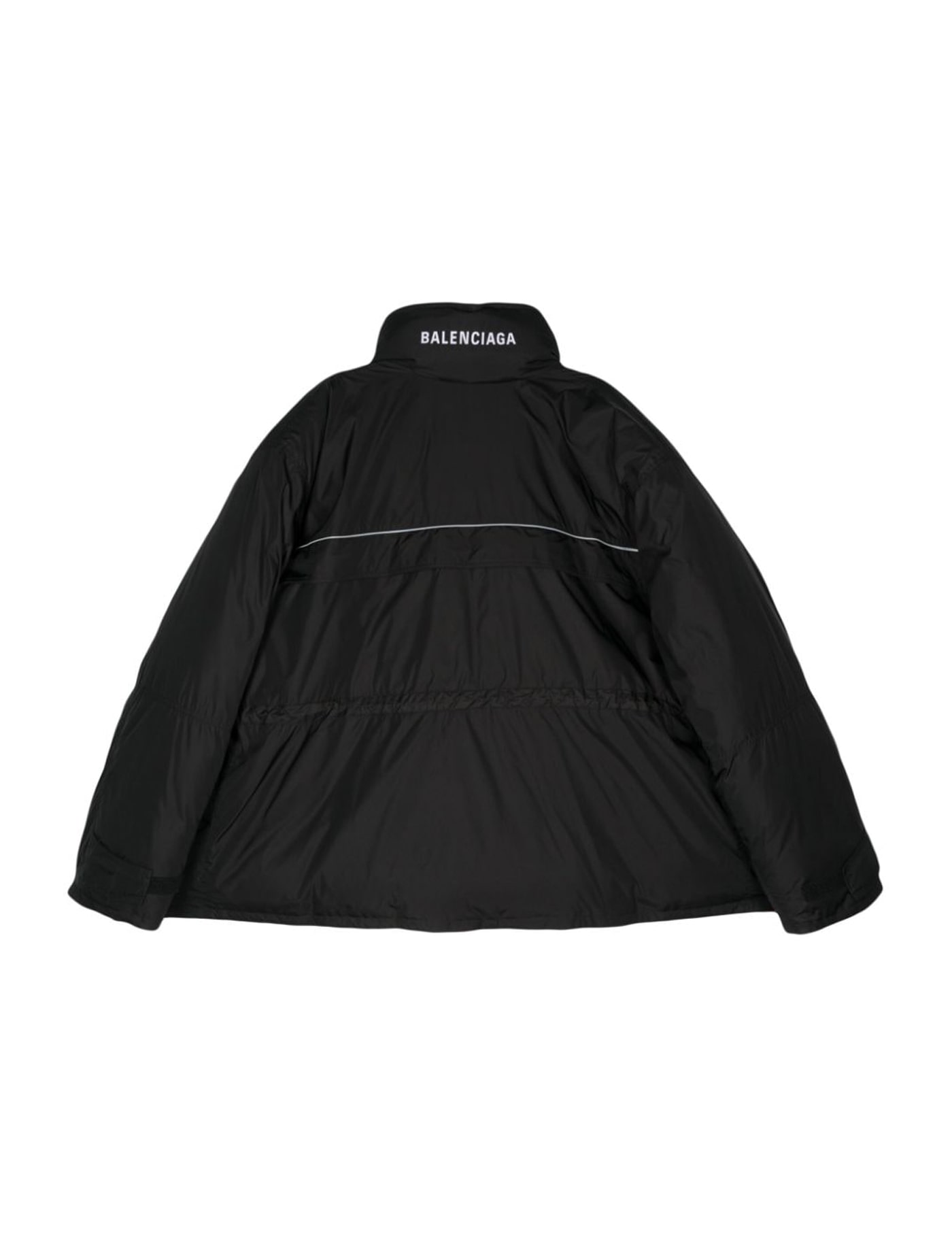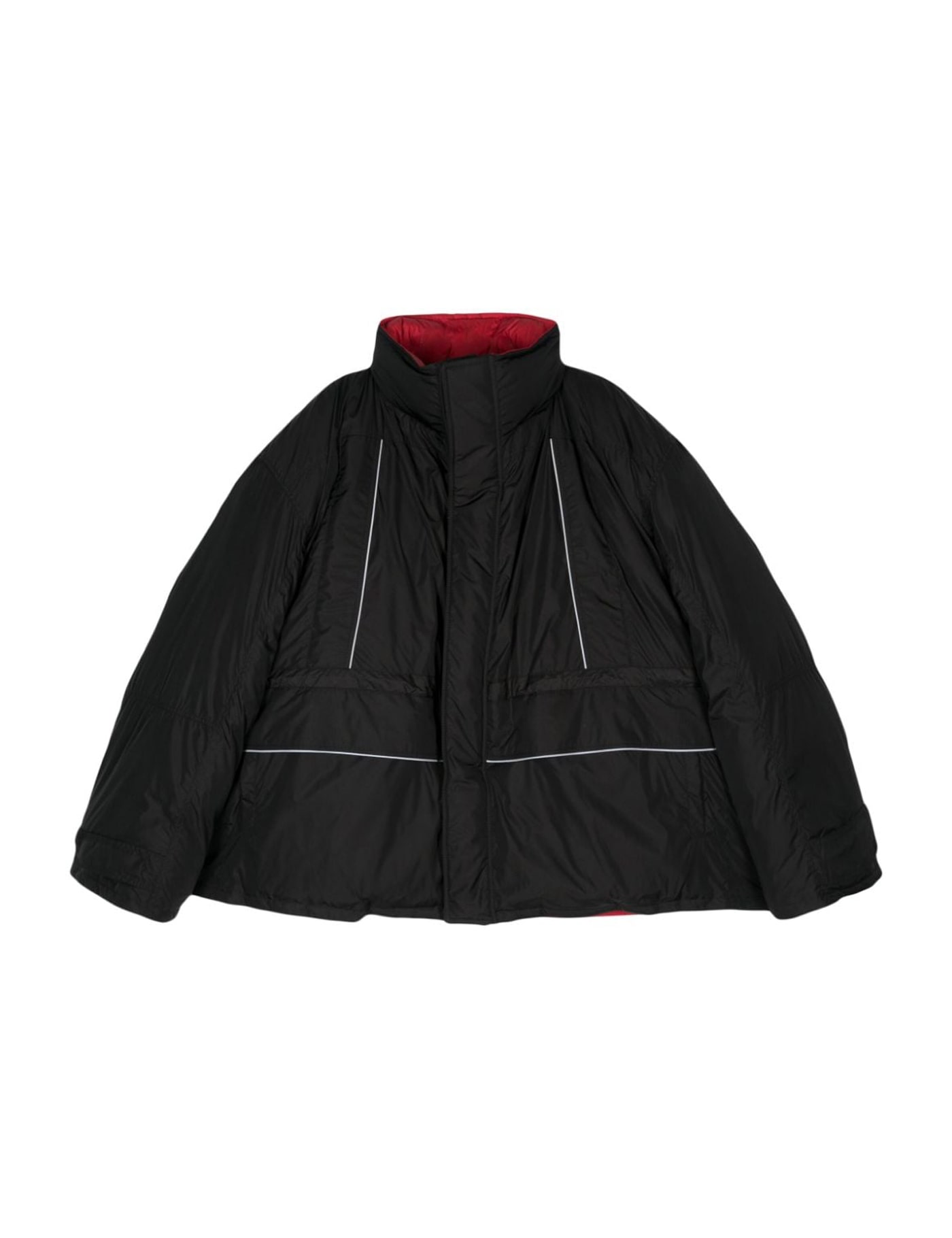 Balenciaga Wrap parka in black matte nylon with contrast red lining. It features high stand-up collar, foldable hood without drawstring, concealed zipped closure with snap buttons, four zipped slash pockets at front, drawstring at waistline, adjustable hook and loop straps at cuffs and Balenciaga logo at back collar. Oversized fit.