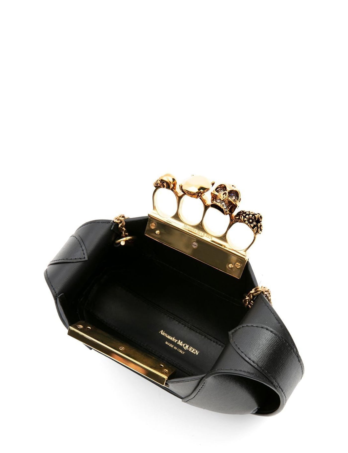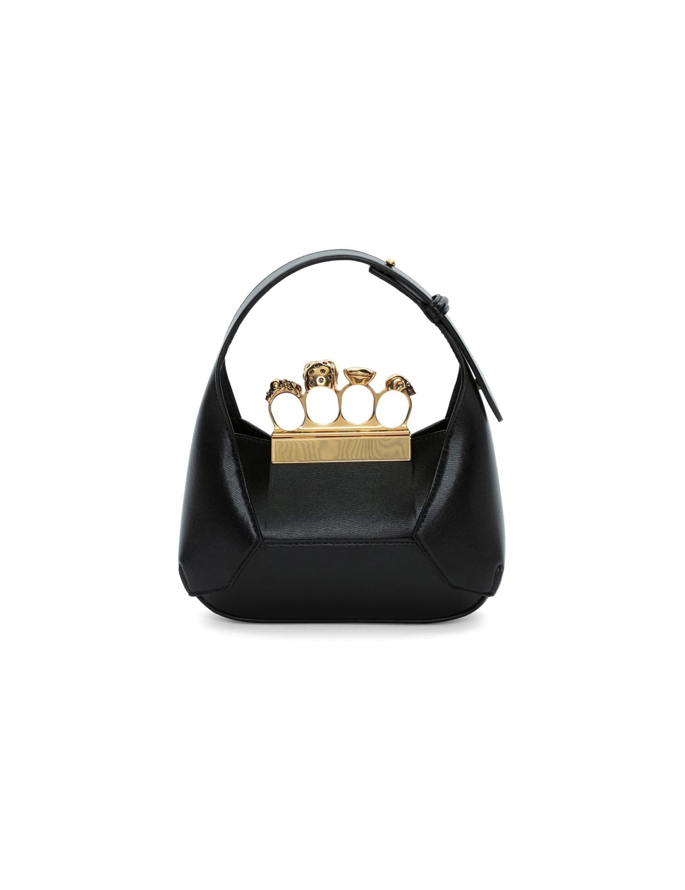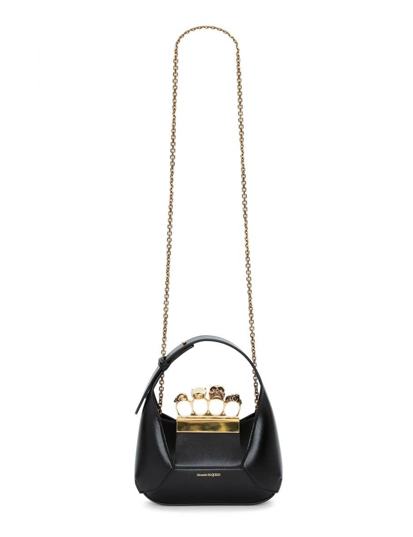 Jewelled Hobo leather mini bag from Alexander McQueen featuring black, calf leather, Swarovski crystal embellishment, skull charm, ring embellishment, gold-plated hardware, engraved logo, magnetic fastening, adjustable top handle, detachable chain-link shoulder strap and main compartment.