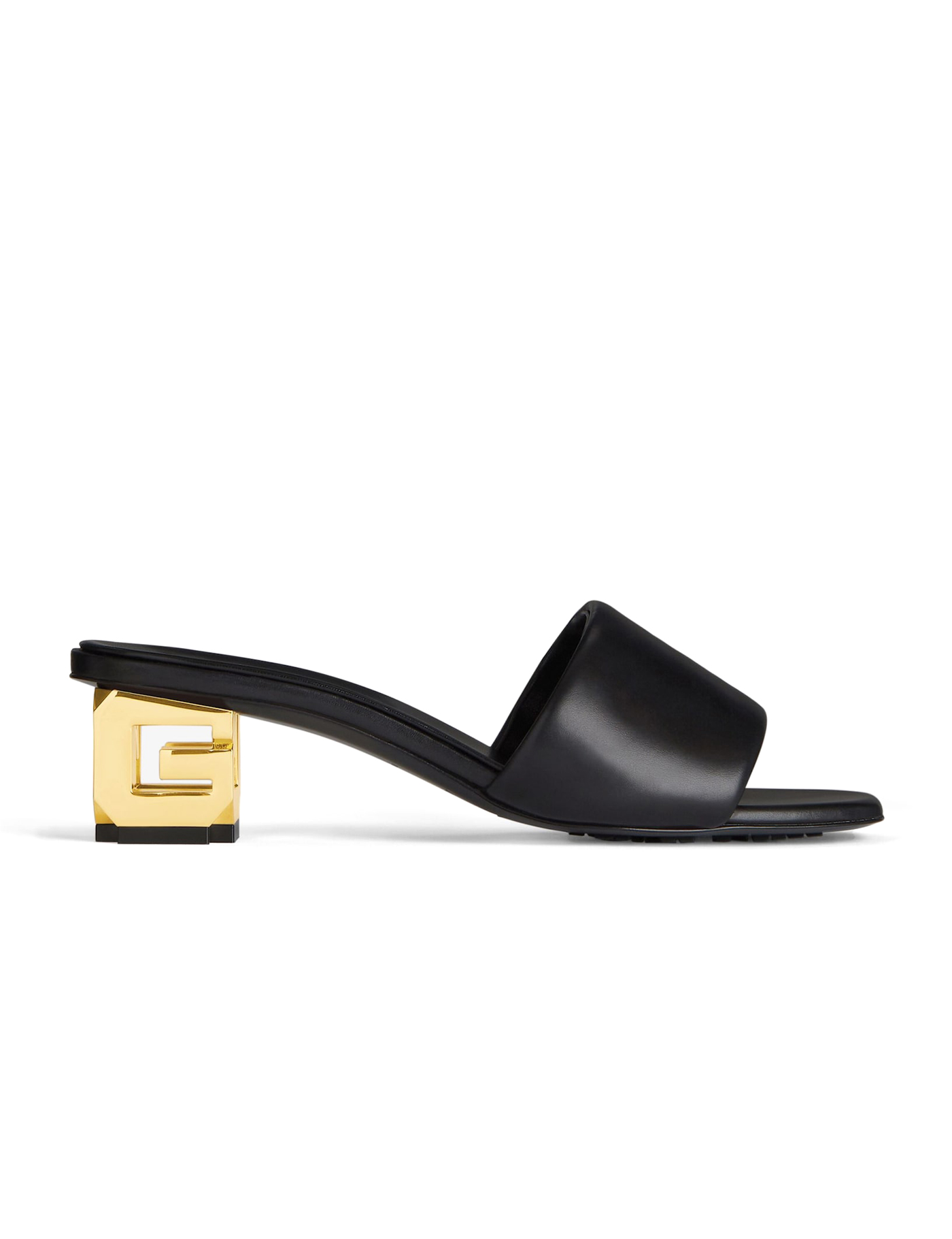 G Cube leather mules from Givenchy (VIP) featuring black, gold-tone, calf leather, open toe, slip-on style, signature 4G motif, low block heel and branded leather insole.