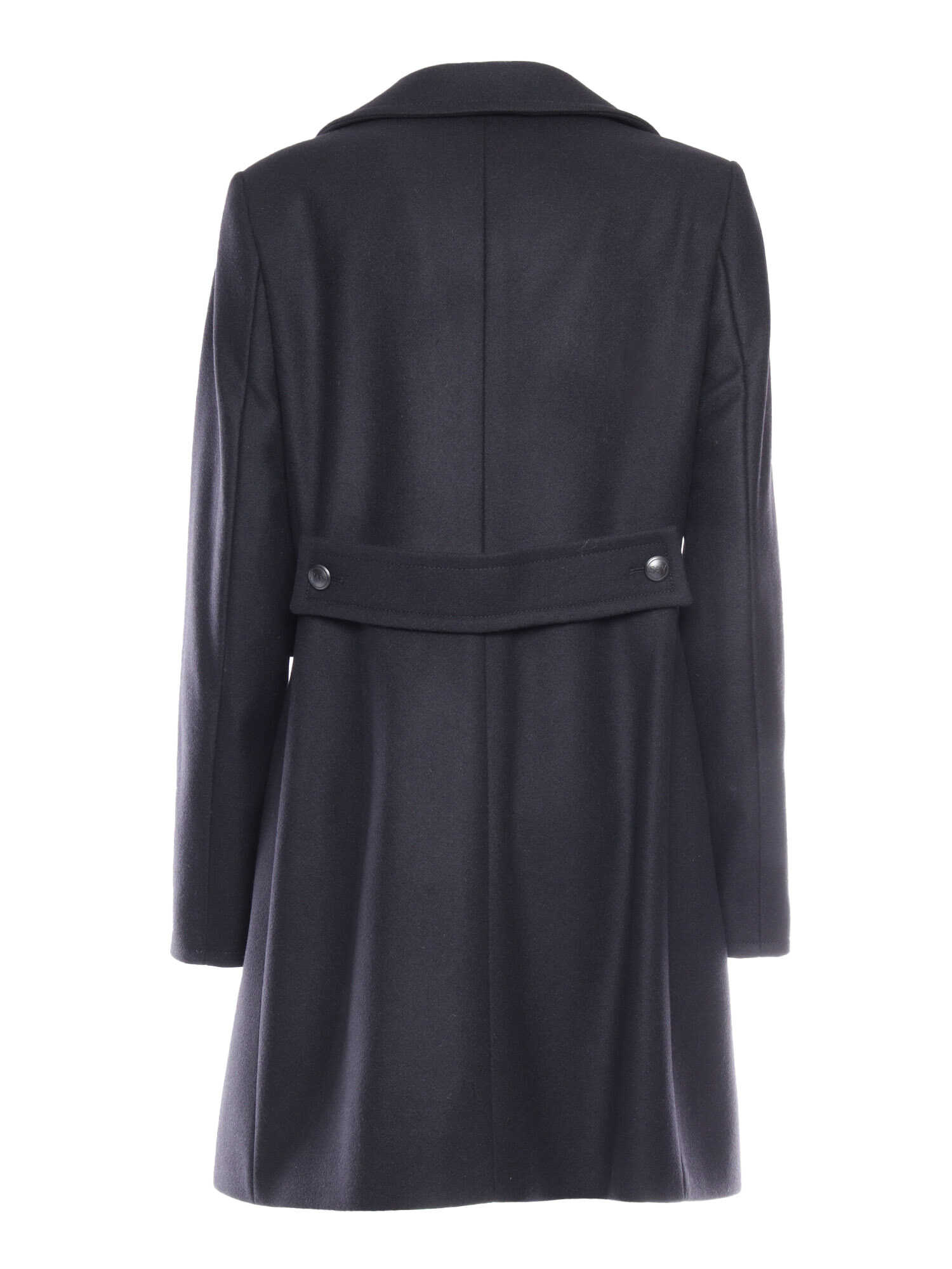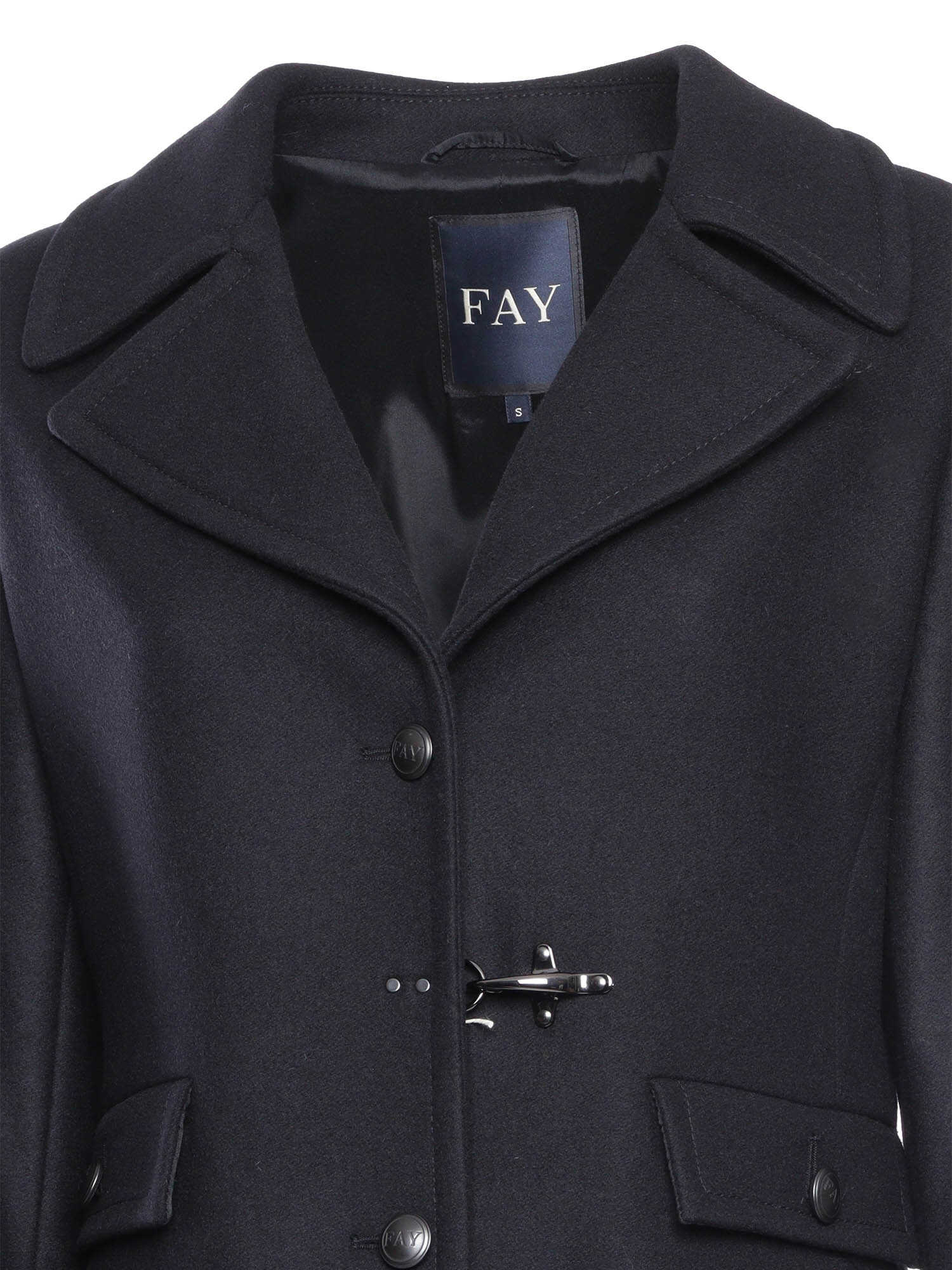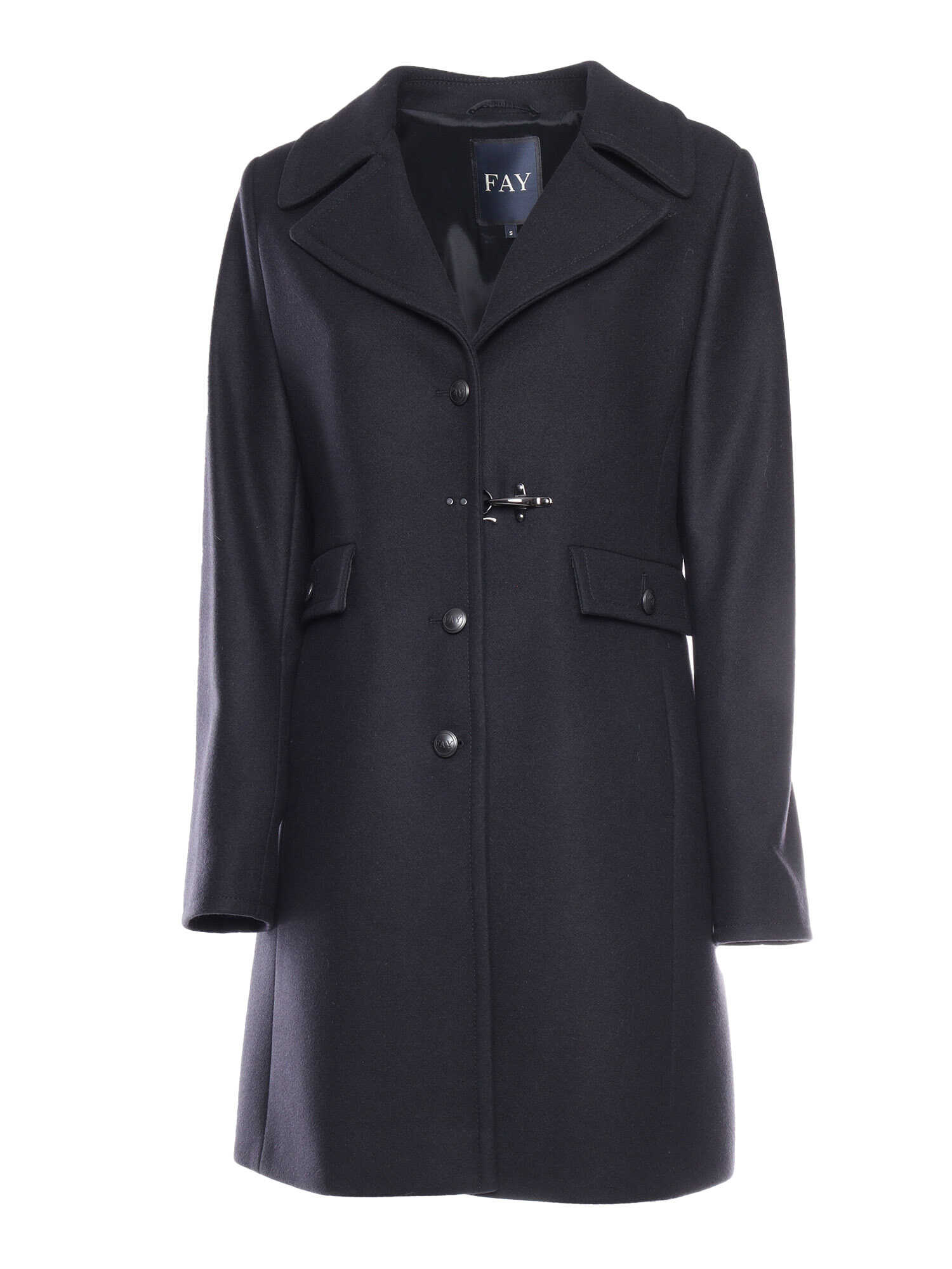 Coat in wool blend cloth, lapel collar, flap pockets, martingale on the back, logo buttons fastening, Fay hook at the waist