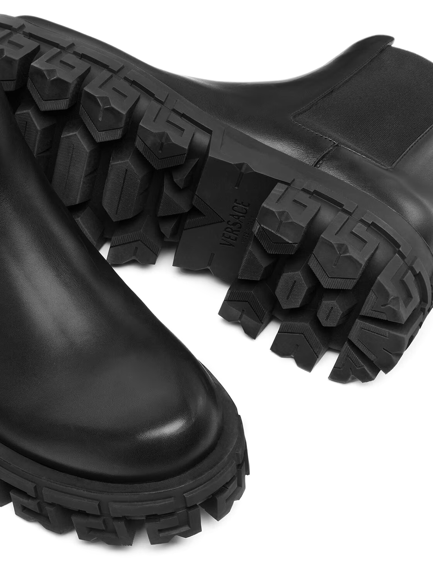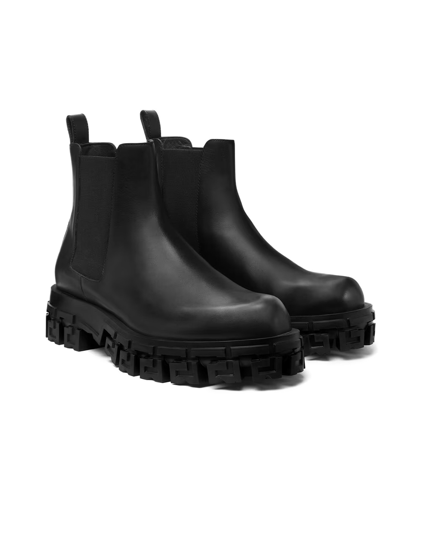 Greca Portico ankle boots by Versace crafte in smooth leather and characterized by a thick rubber lug sole with Greca pattern. Side elastic inserts, logoed back pull, leather interior.