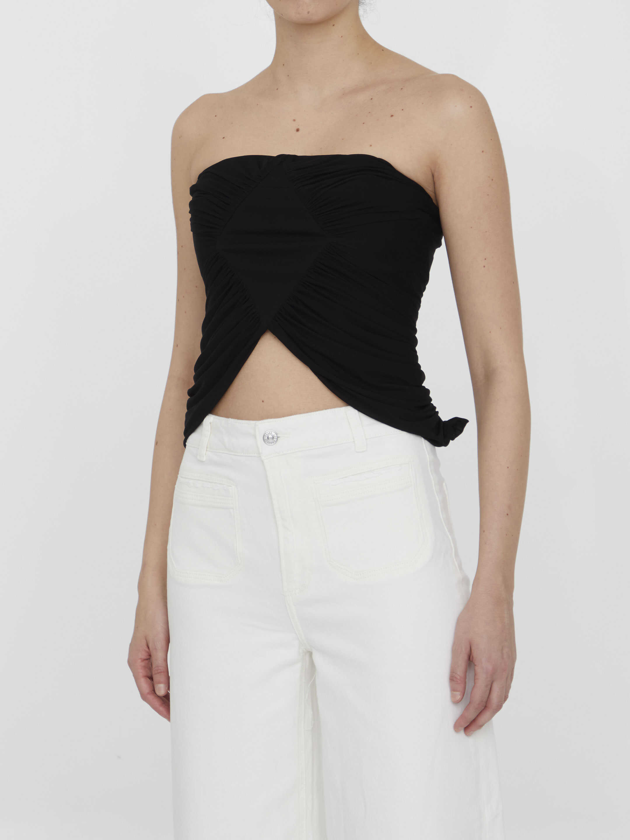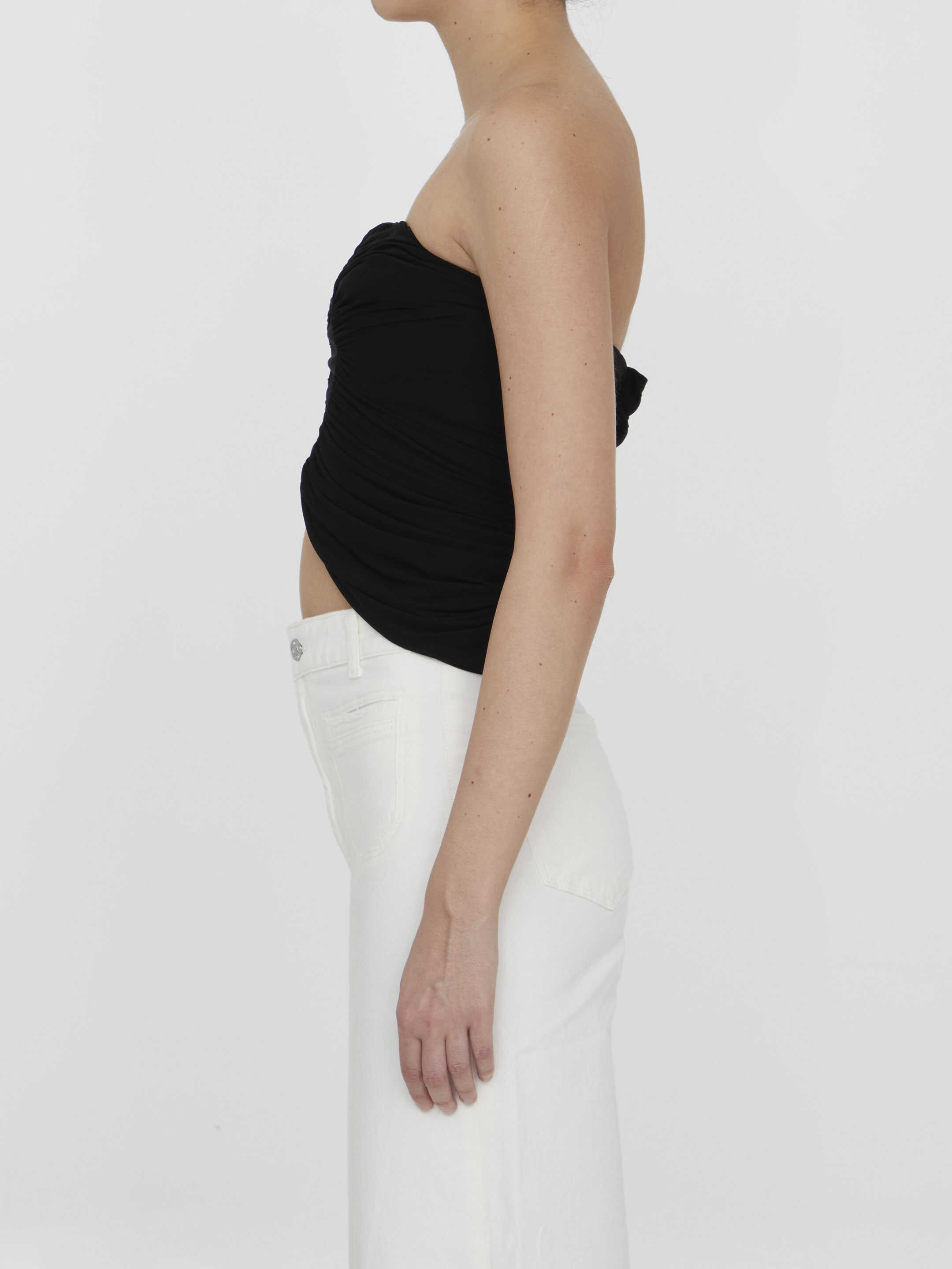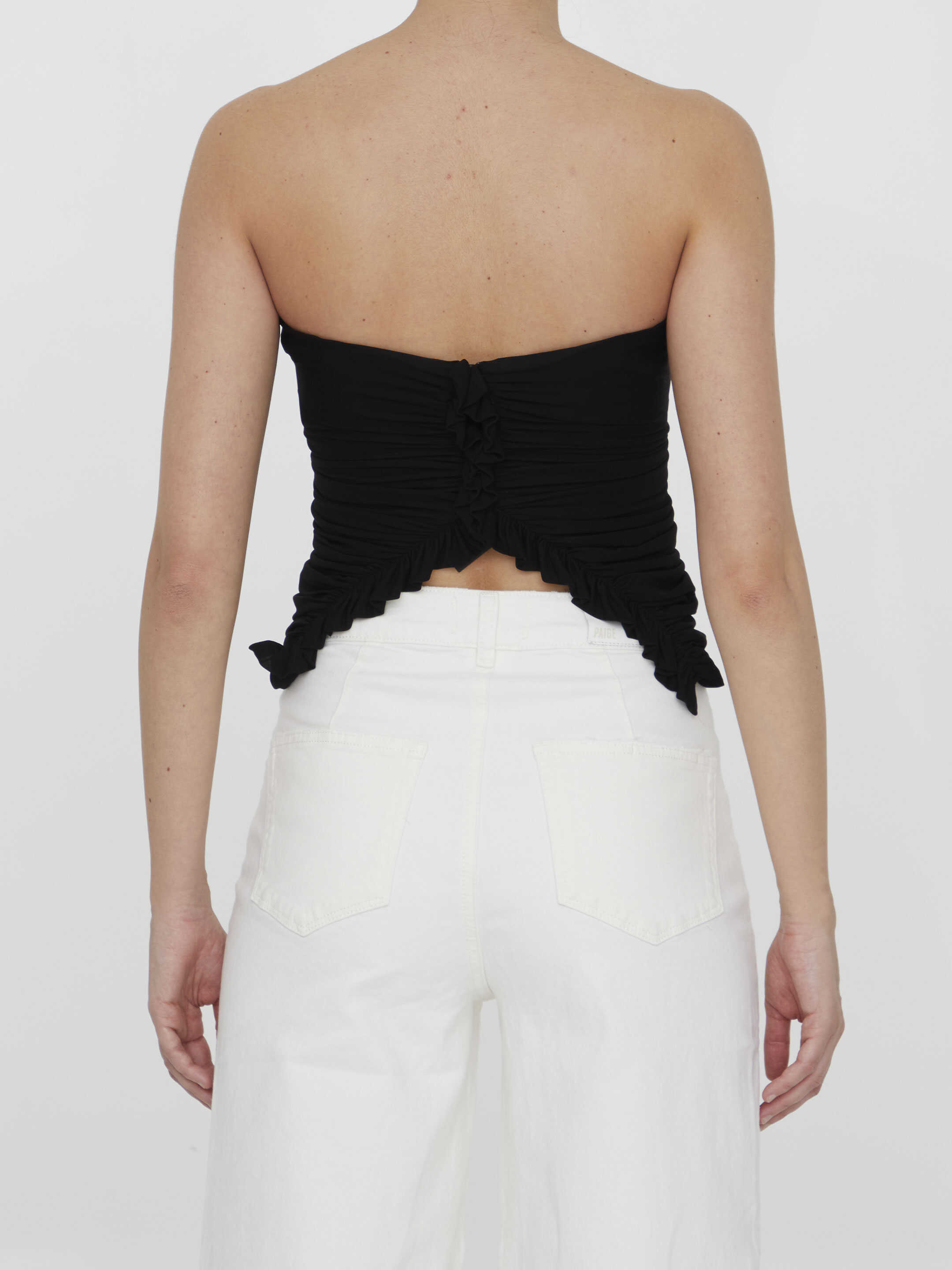 Cropped bustier in black jersey adorned with ruffles with ruching at the seams. Rear zip closure. V-cut hem.
