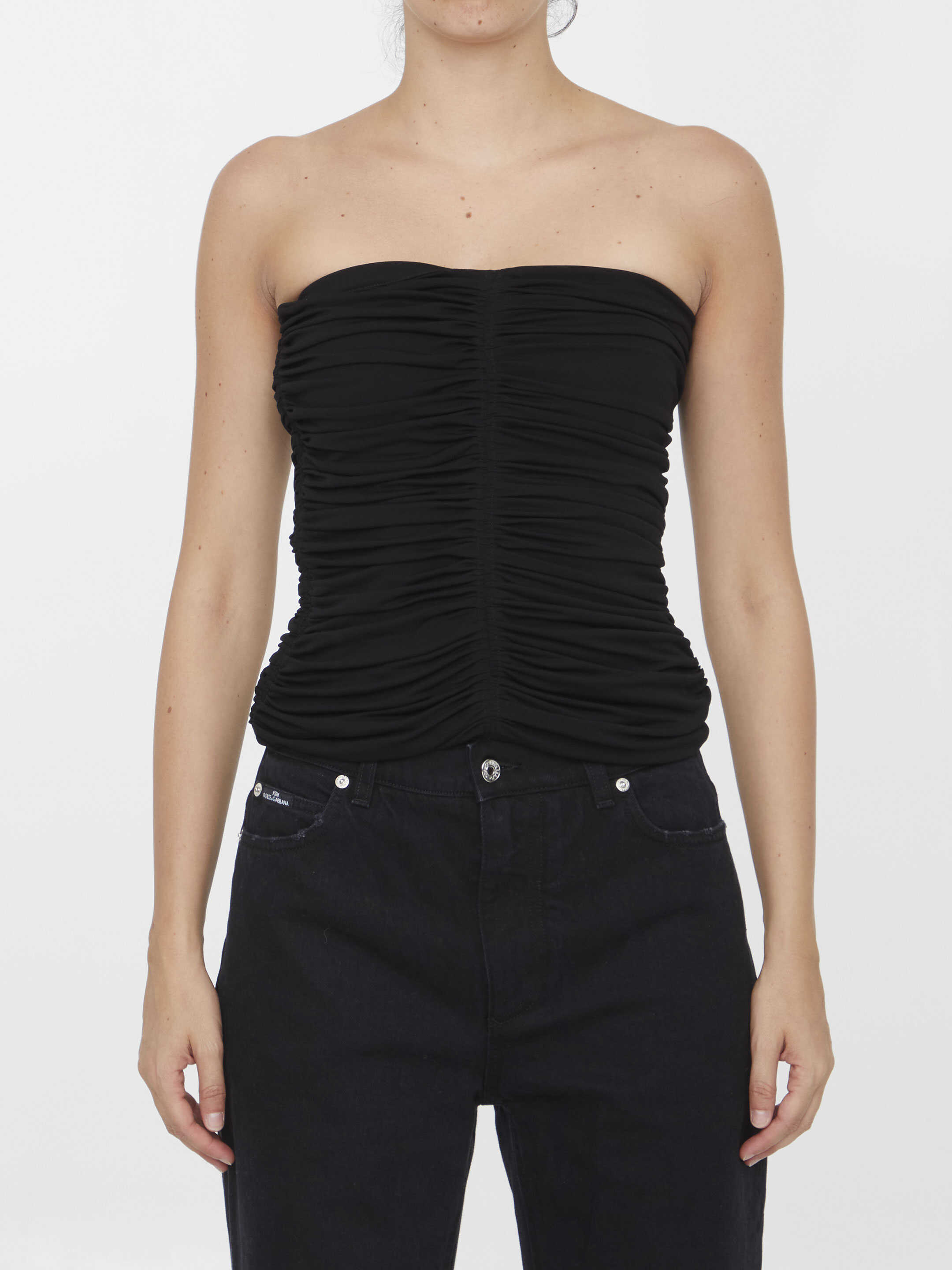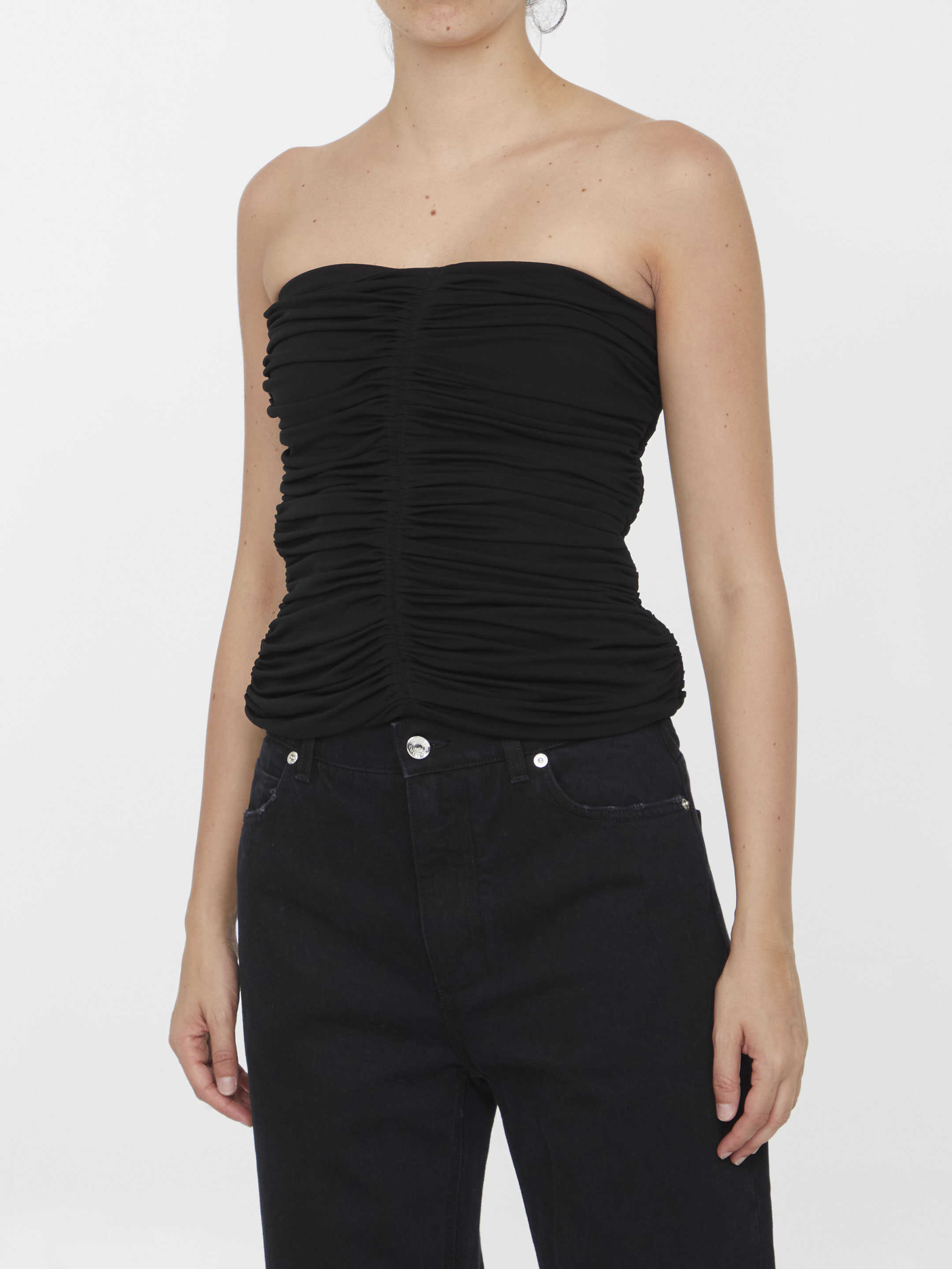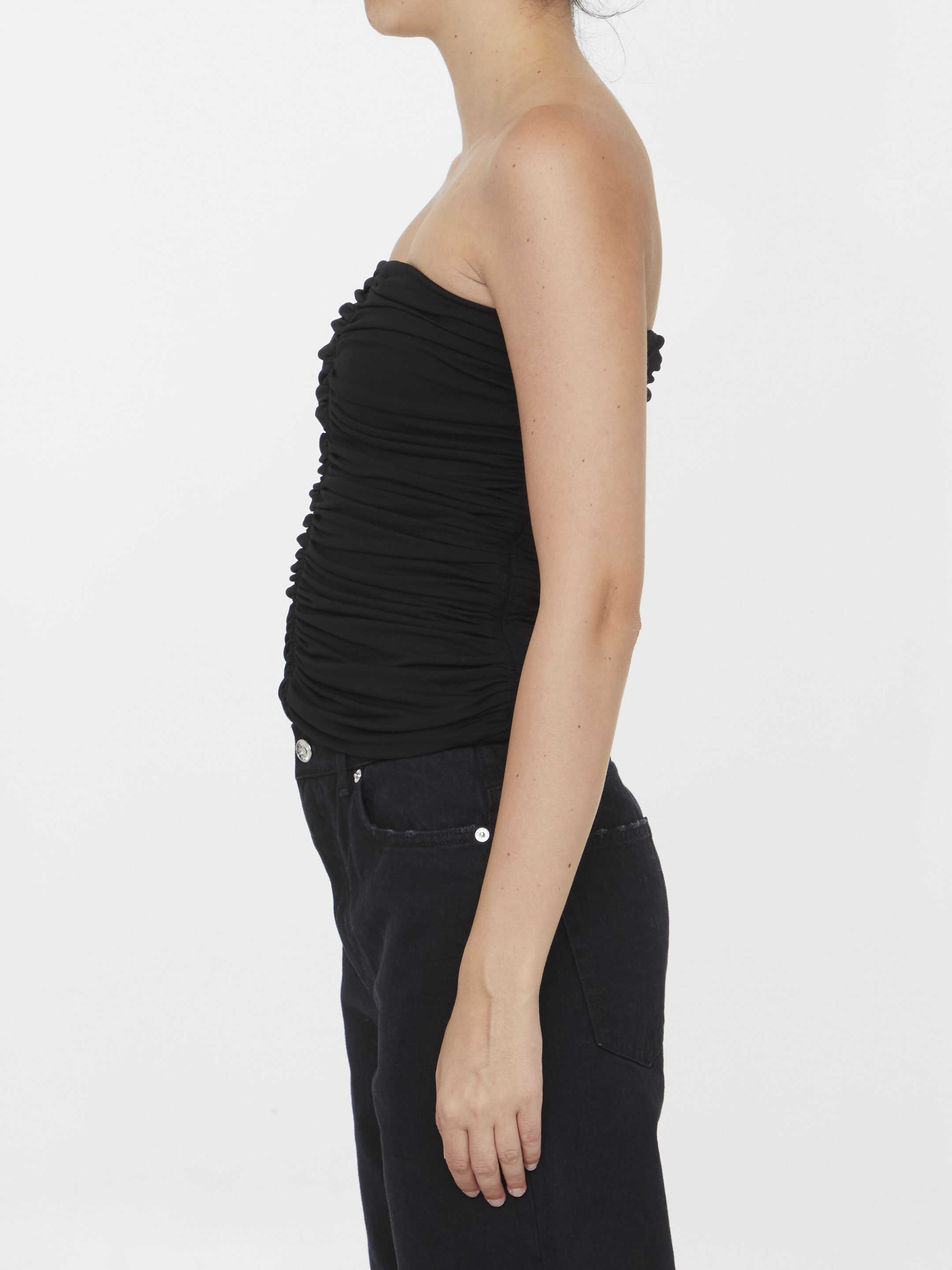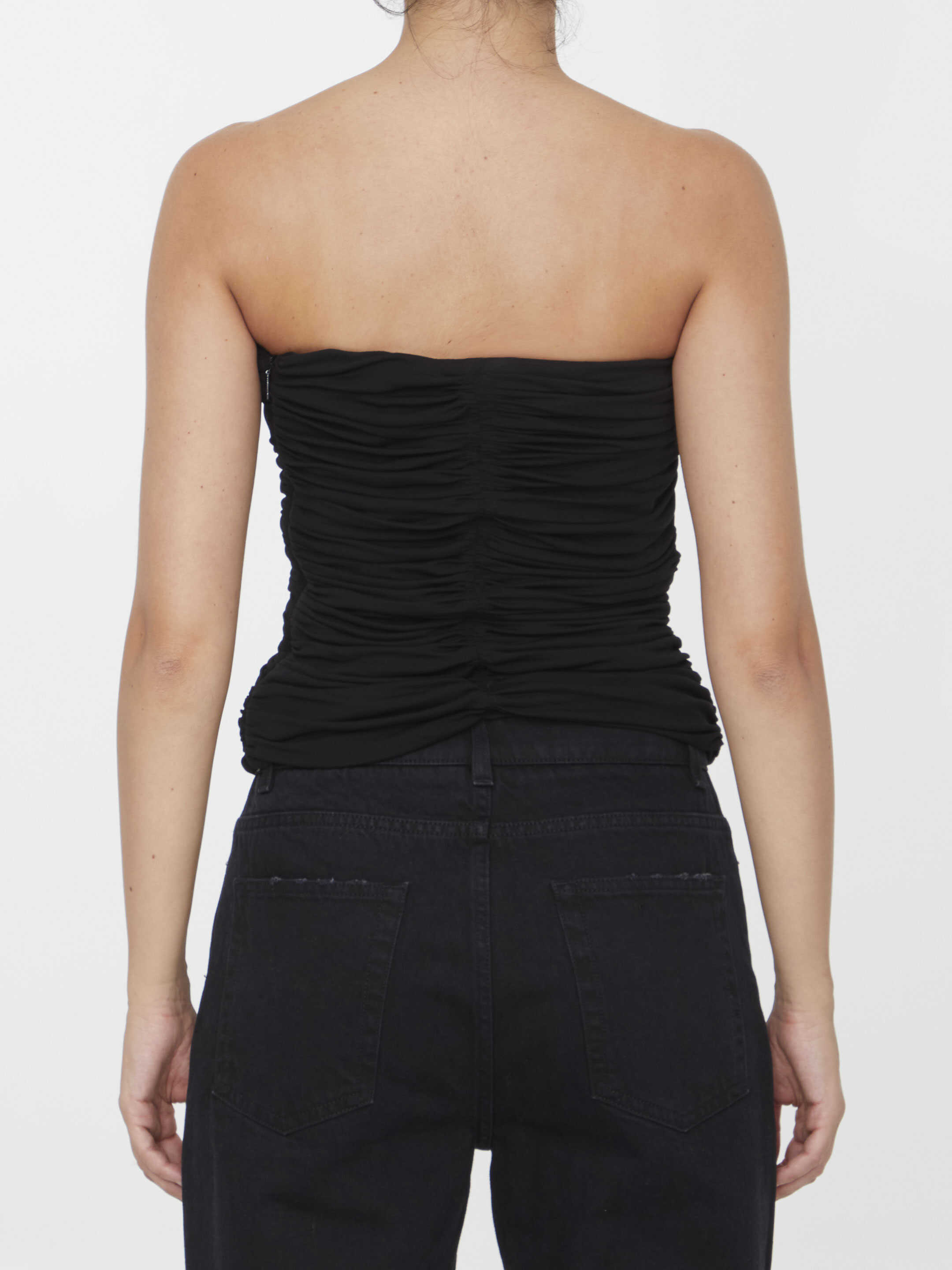 Strapless bustier made from black viscose crêpe with sweetheart neckline and all-over ruching. Concealed side zip closure. Slim fit.