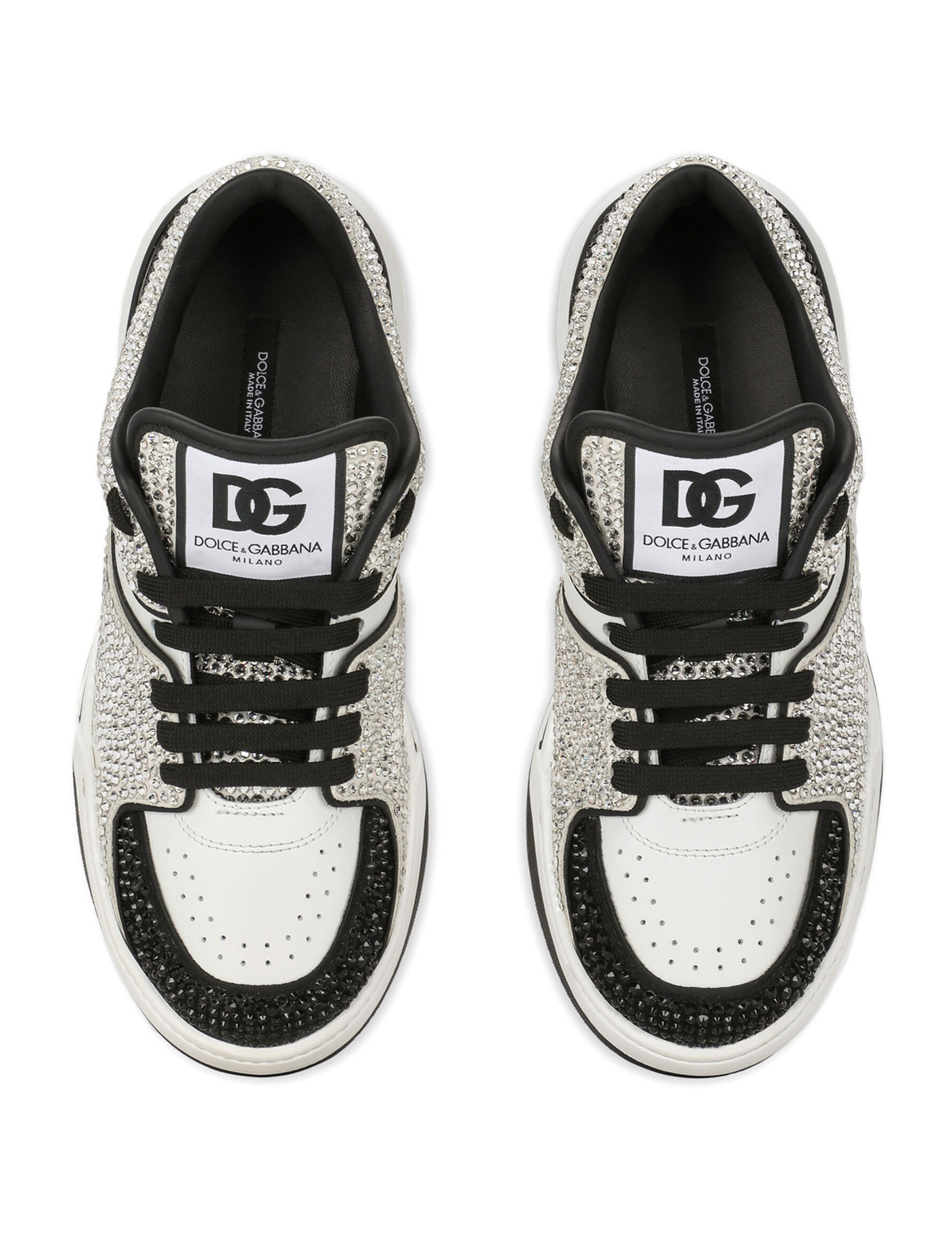New Roma sneakers in black and white calfskin with all-over hand-applied Swarovski. Lace-up closure, logo on tongue and bicolor rubber sole.
