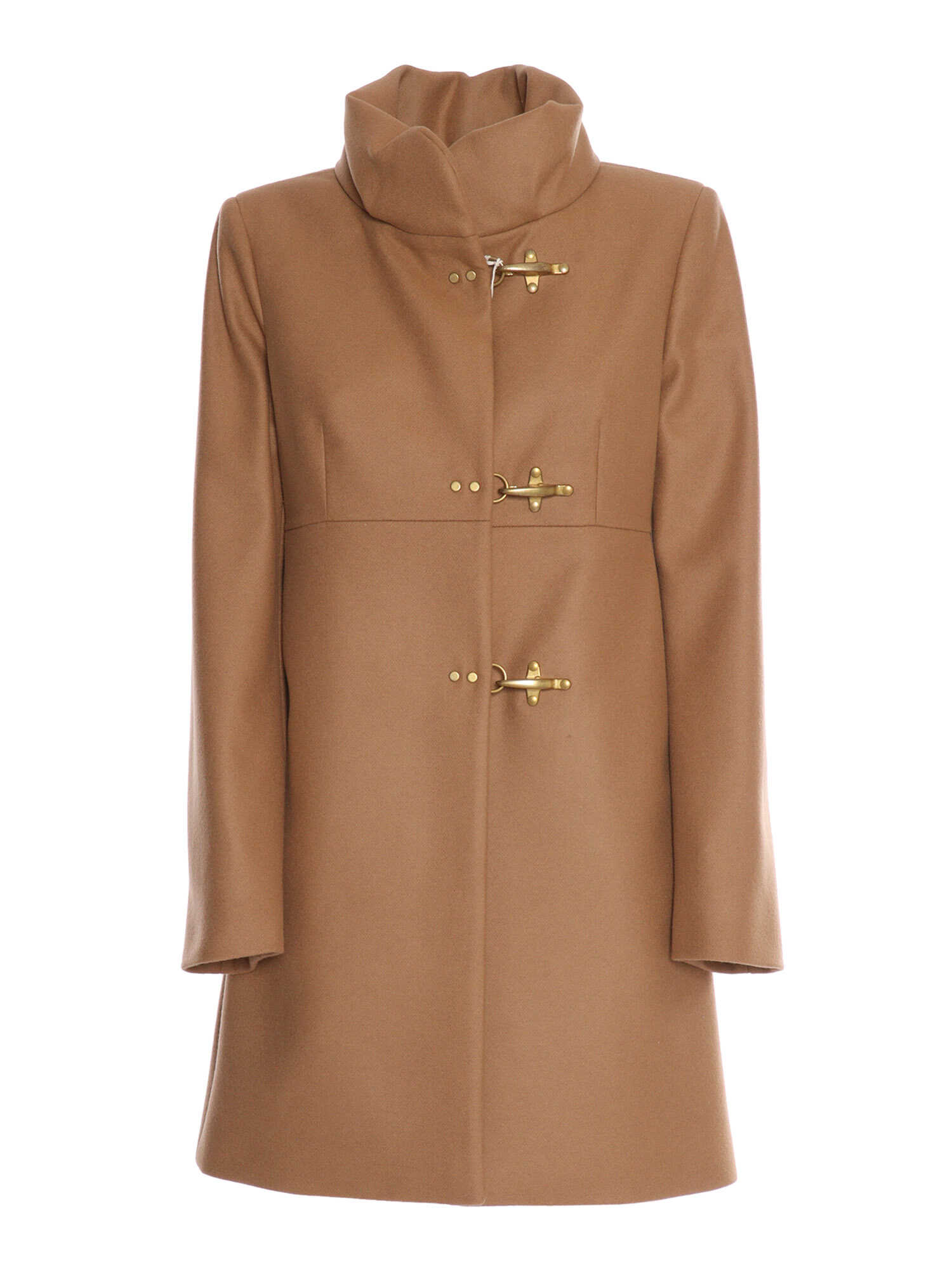 Virgin wool blend coat, funnel neck, front hook fastening, mid length, straight hem, lined