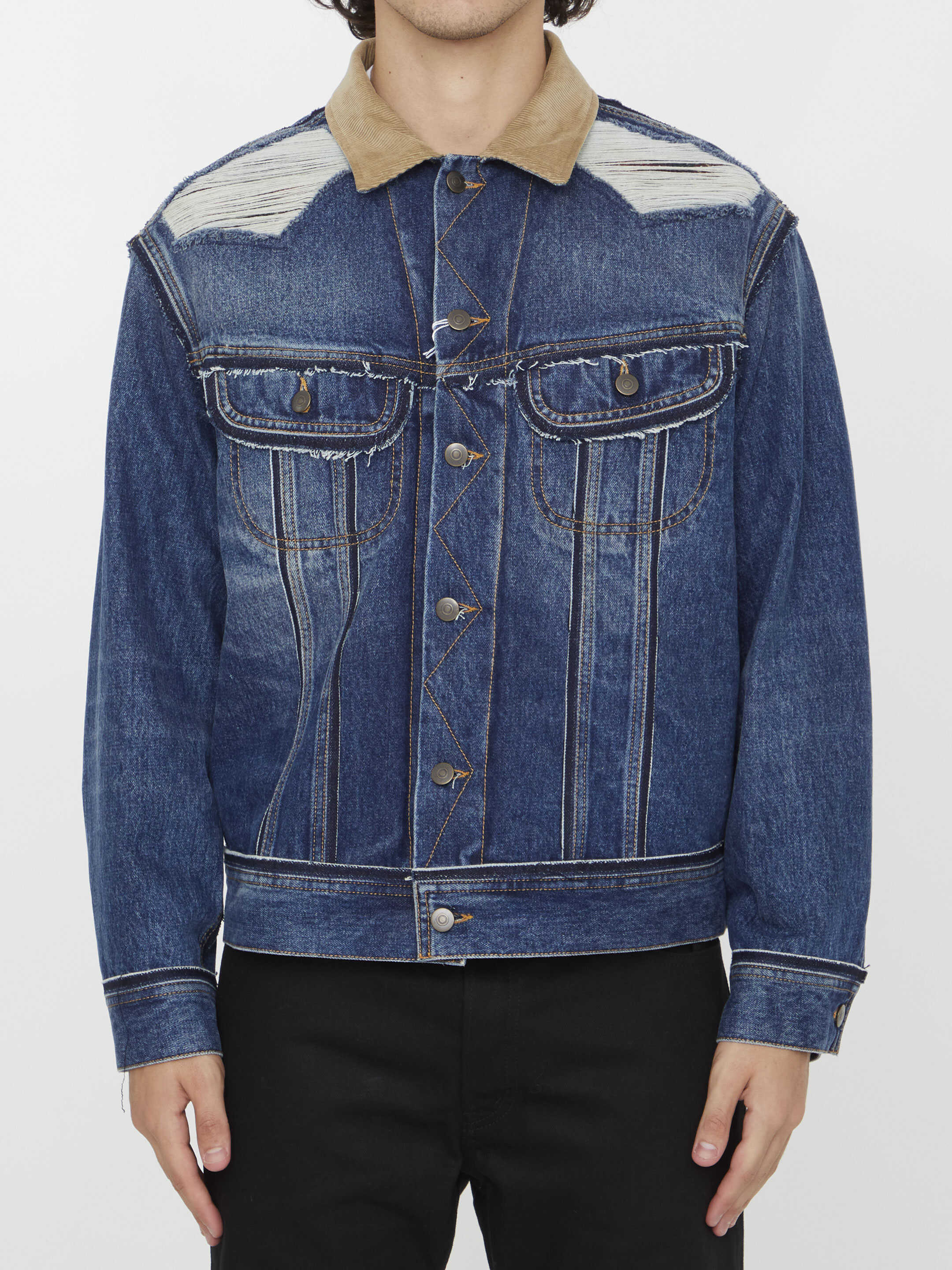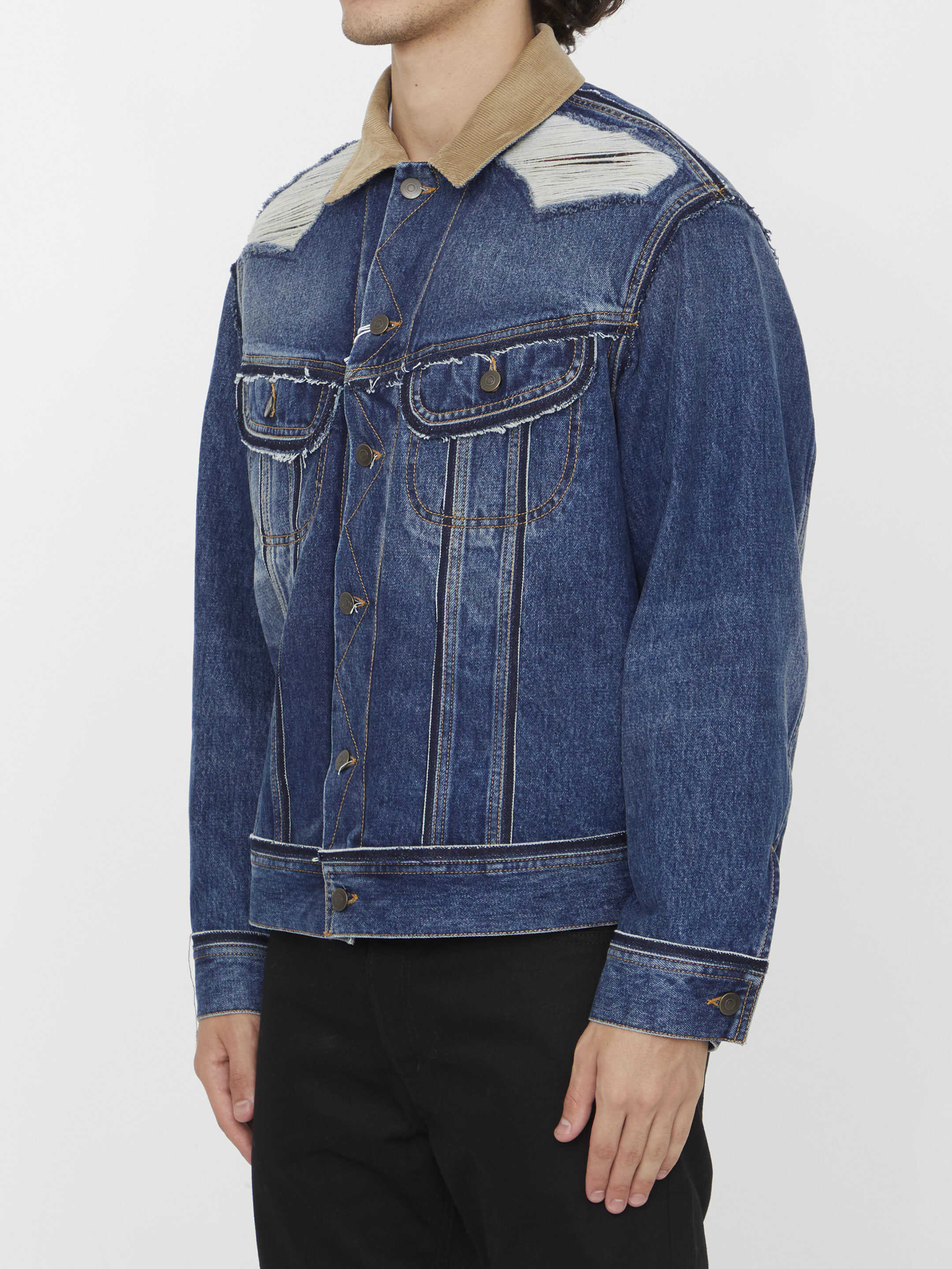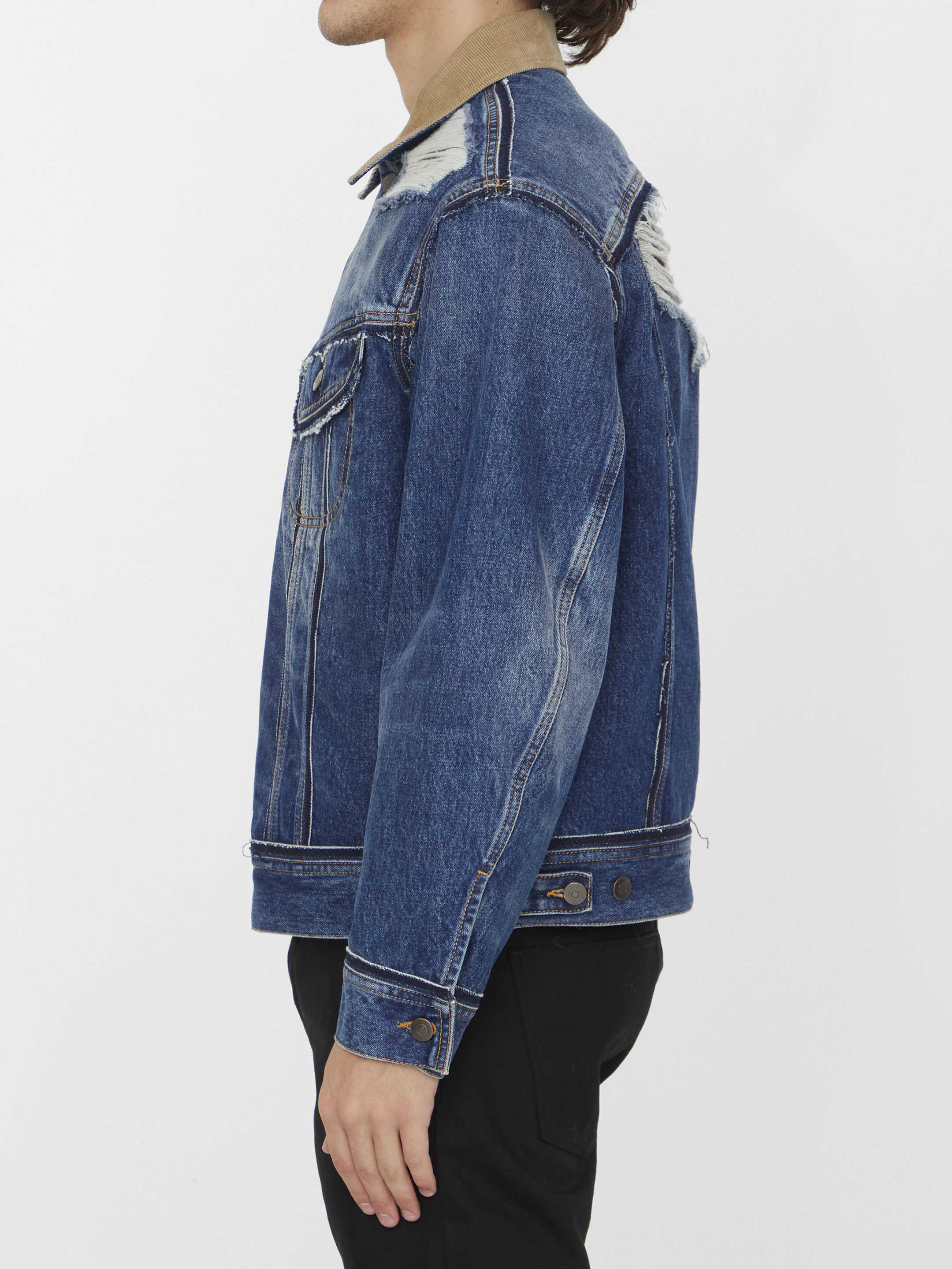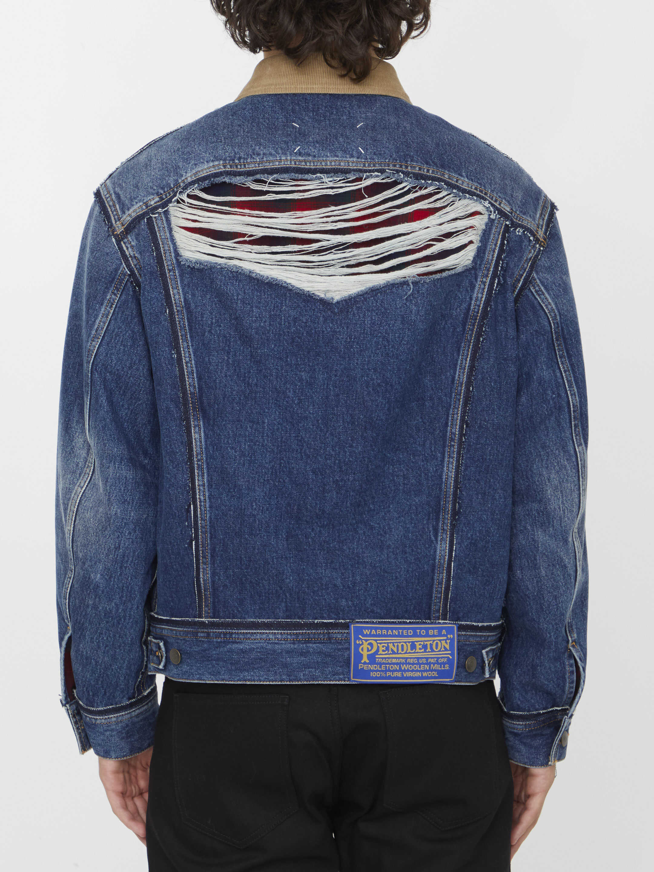 Pendleton denim jacket with corduroy collar, distressed details and Pendleton check wool lining. It features button closure, two buttoned flap pockets on chest and buttoned cuffs. Four stitches detail at the back. Regular fit.