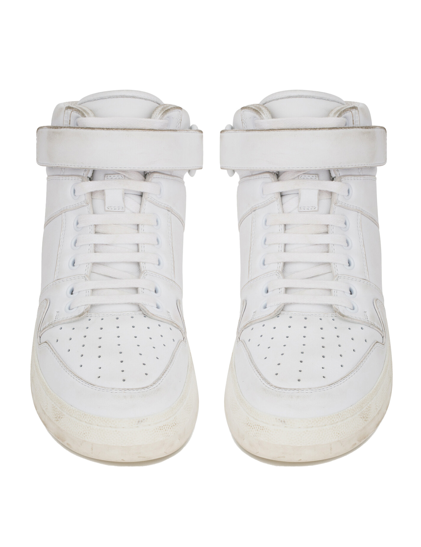 Mid-top laced sneakers with a velcro tab, featuring perforated leather on the front, a Saint Laurent signature on the back tab, on the toungue and side sole. Any leather imperfections are not to be considered factory defects, but a peculiarity of the material.