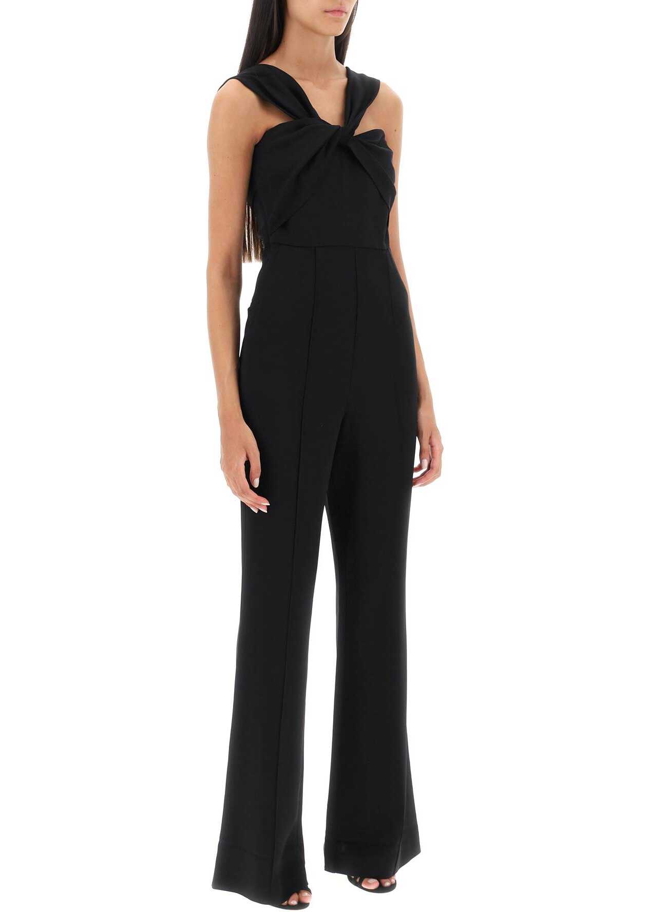 Roland Mouret jumpsuit crafted in stretch viscose cady and characterized by a ruched twisted neckline. It features boned inner bustier, side invisible zipper-and-hook closure, side slash pockets and a back welt pocket. Lined interior. Waisted fit with natural waistline and flared pants enhanced by pintucks. The model is 177 cm tall and wears size UK 6.