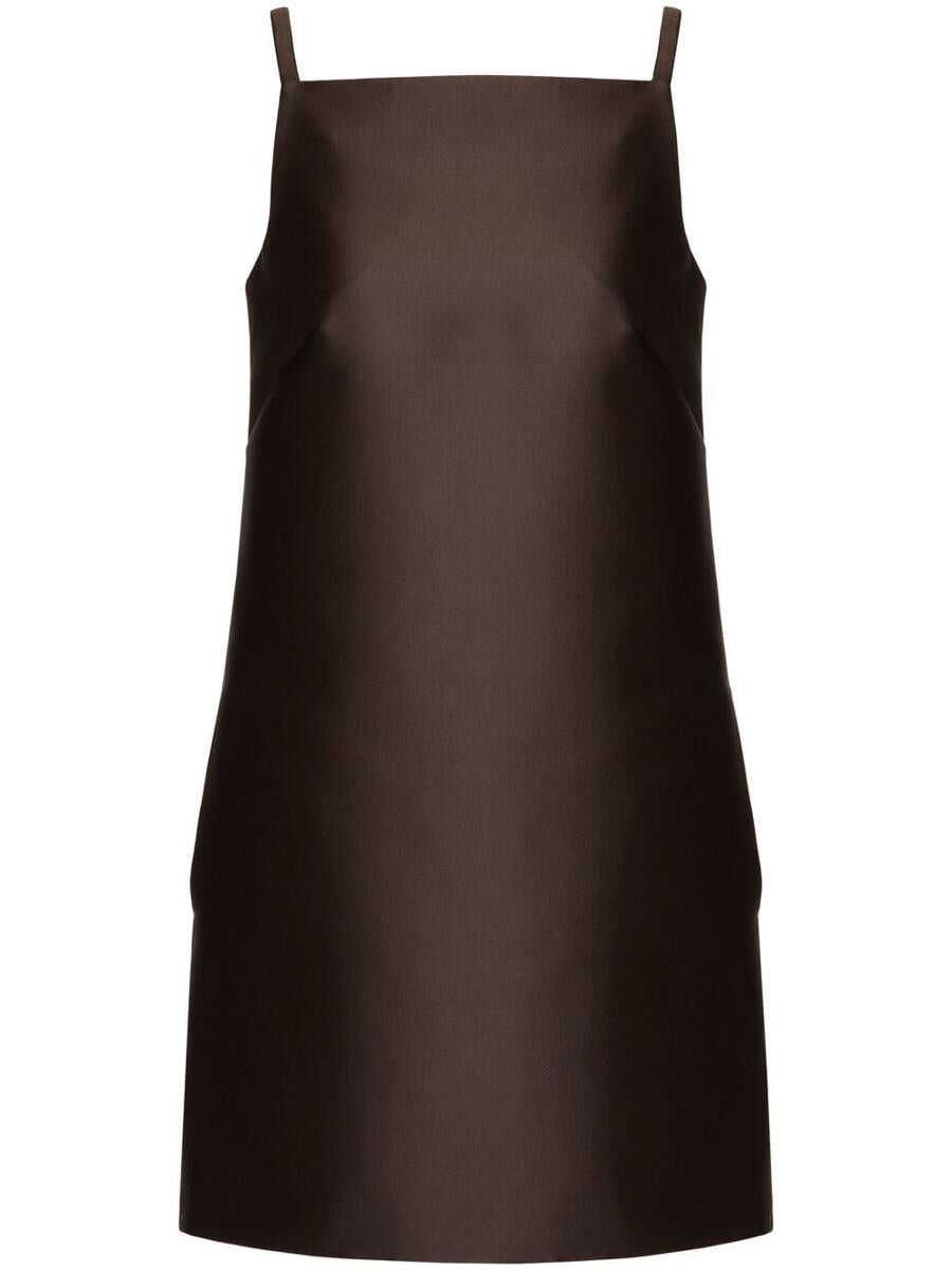 Square-neck silk minidress featuring chocolate brown, silk, square neck, spaghetti straps, concealed rear zip fastening and full lining.