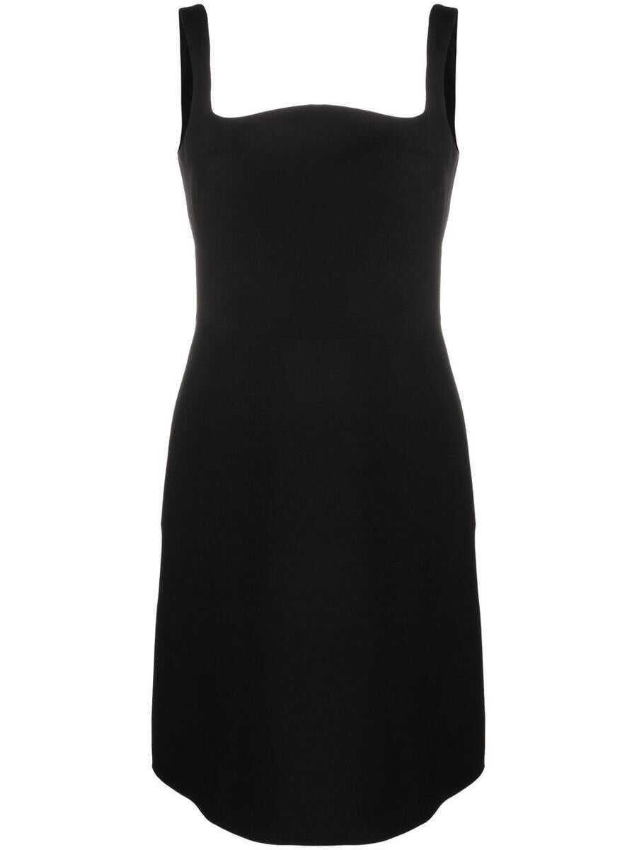 Curved sleeveless dress featuring black, virgin wool-silk blend, strapless, square neck, concealed rear hook and zip fastening, silk lining, open back, above-knee length and straight hem.