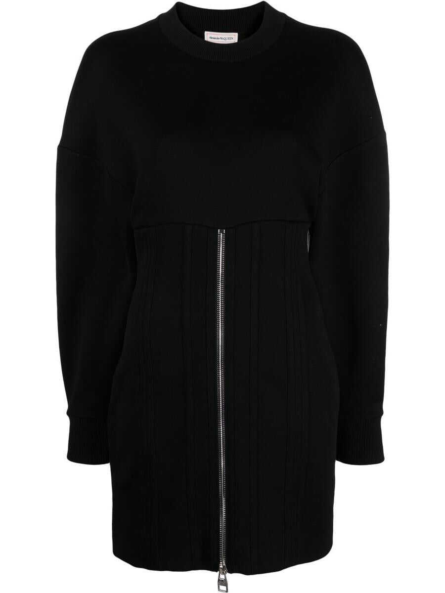 zip-detail mini dress from Alexander McQueen featuring black, cotton blend, ribbed edge, crew neck, drop shoulder, long sleeves, ribbed cuffs, decorative zip detailing, above-knee length and straight hem.