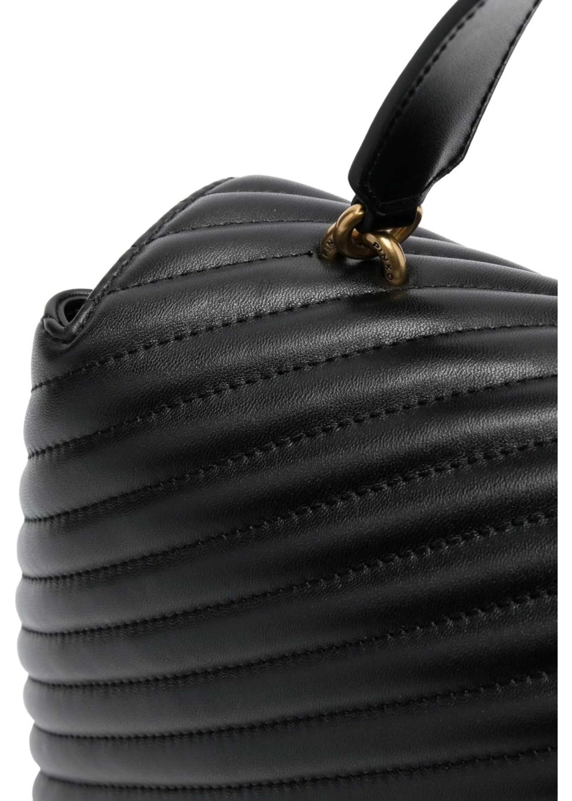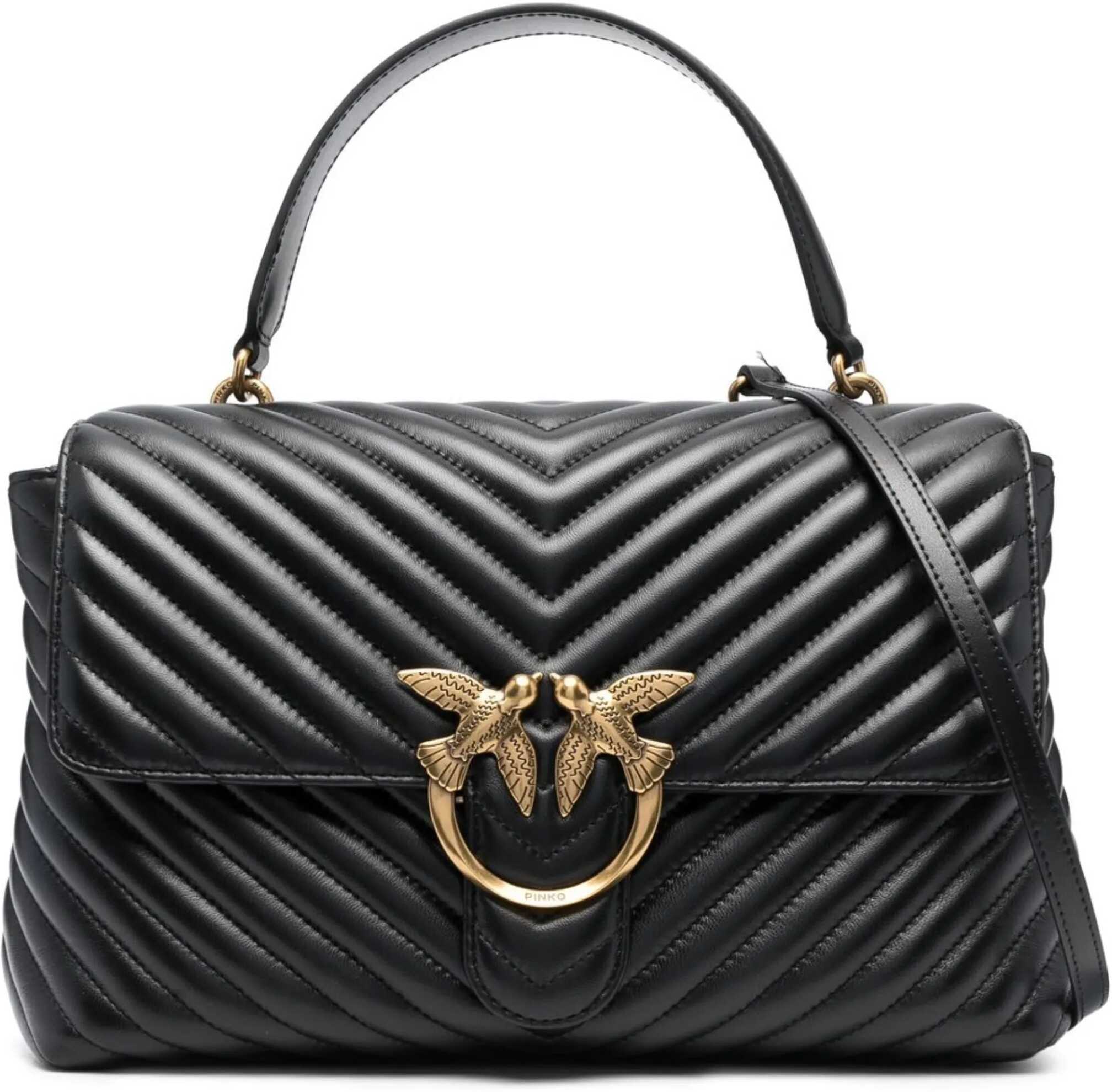 The Calfskin Love Lady Handbag by Pinko, magnetic flap front closure, iconic gold-plated Love Birds logo embossed on the front, quilted and padded design, double interior compartment, removable chain shoulder strap with smooth leather insert, flat rigid top handle, interior flat pocket with zipper, iconic tone-on-tone embroidered brand monogram on the back.
