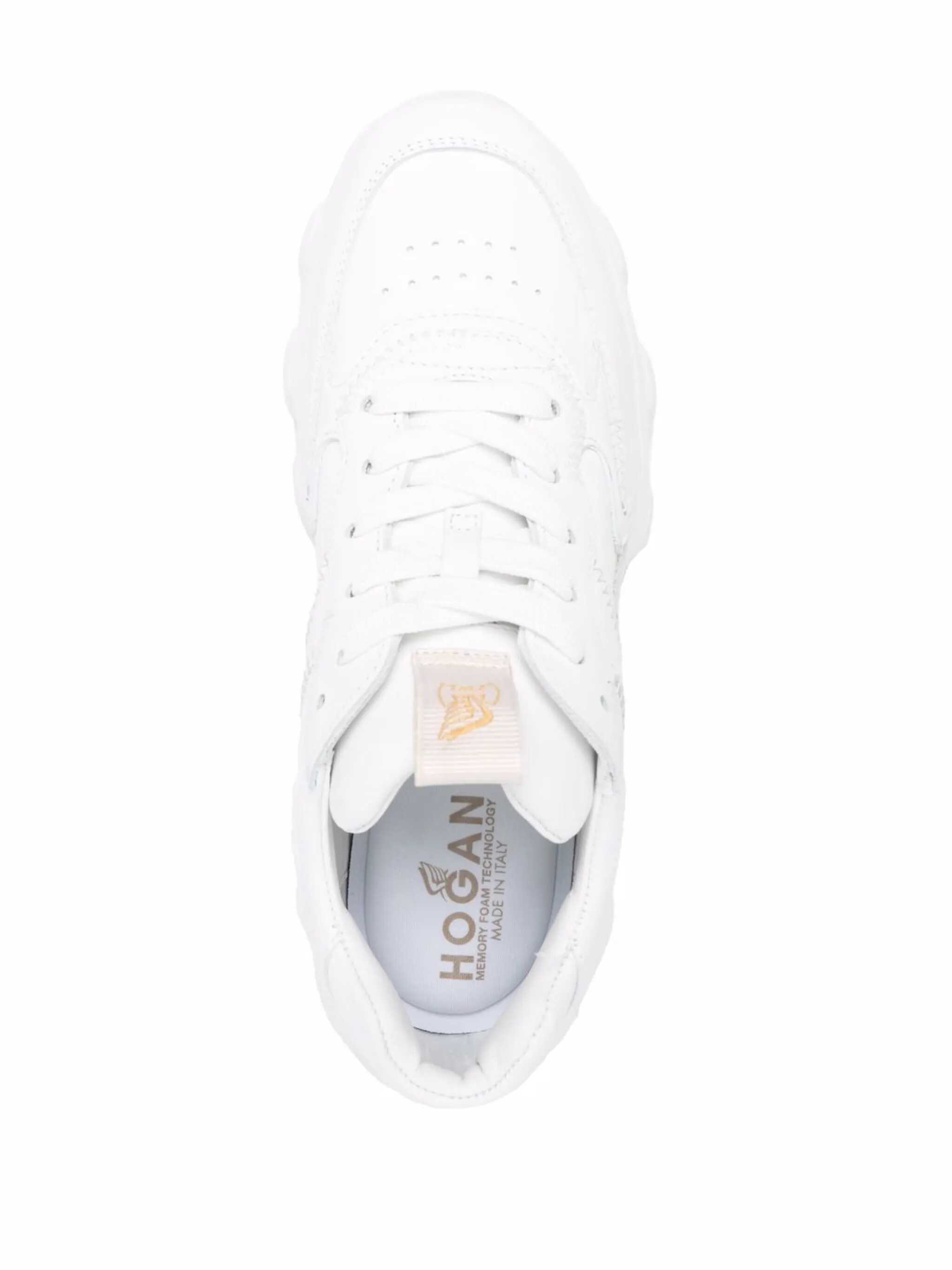 Sneakers Hogan "Hyperactive" made of White leather. Stitch a view. Side drilling. Breathable round toe. Logo patch applied on the tongue. Laced. Tone-on-tone "Hogan" logo lettering on the side. Memory foam fussbed. Rubber sole, writing on the back. 8mm raised fussbett Total height 6.2cm