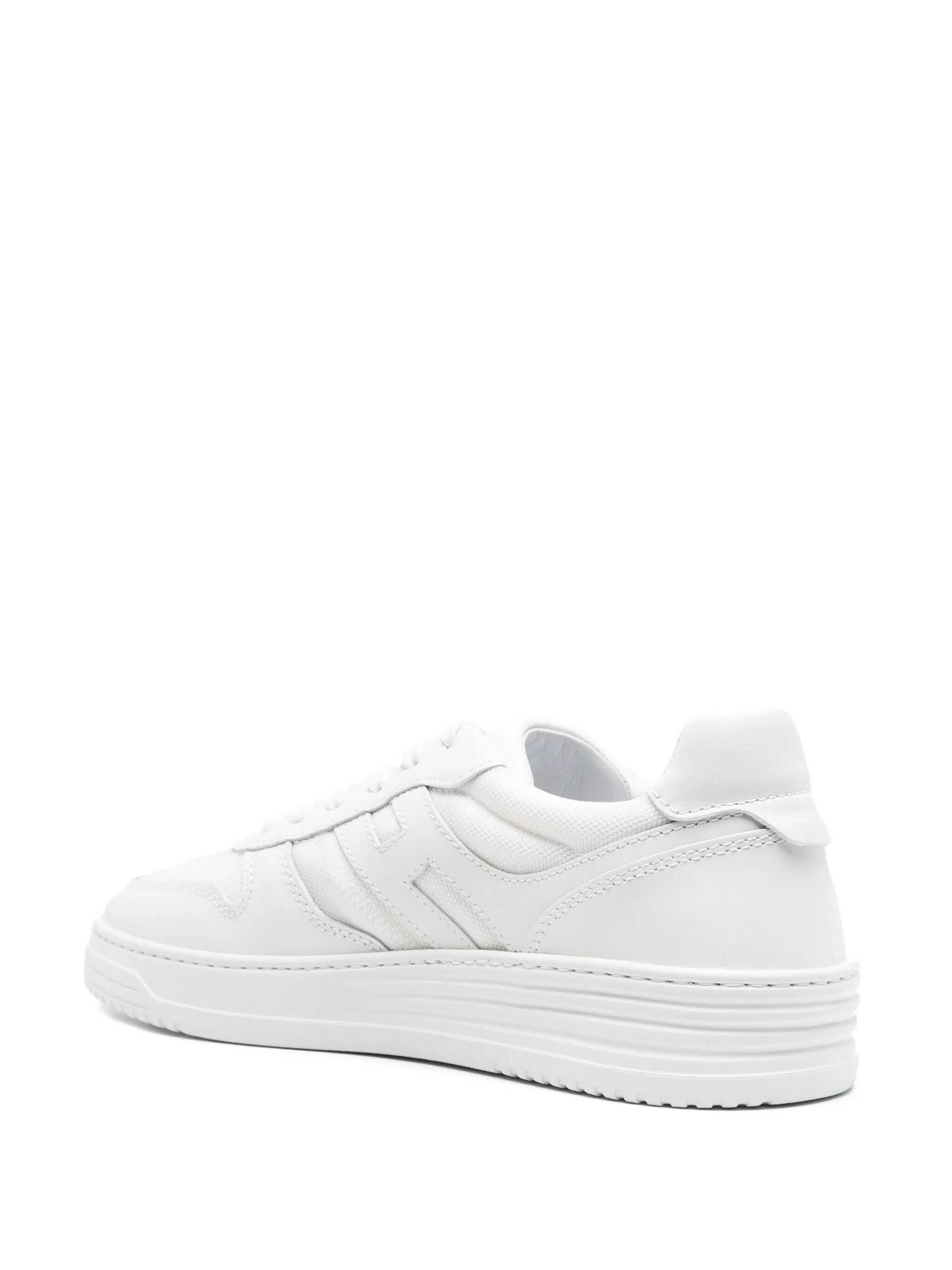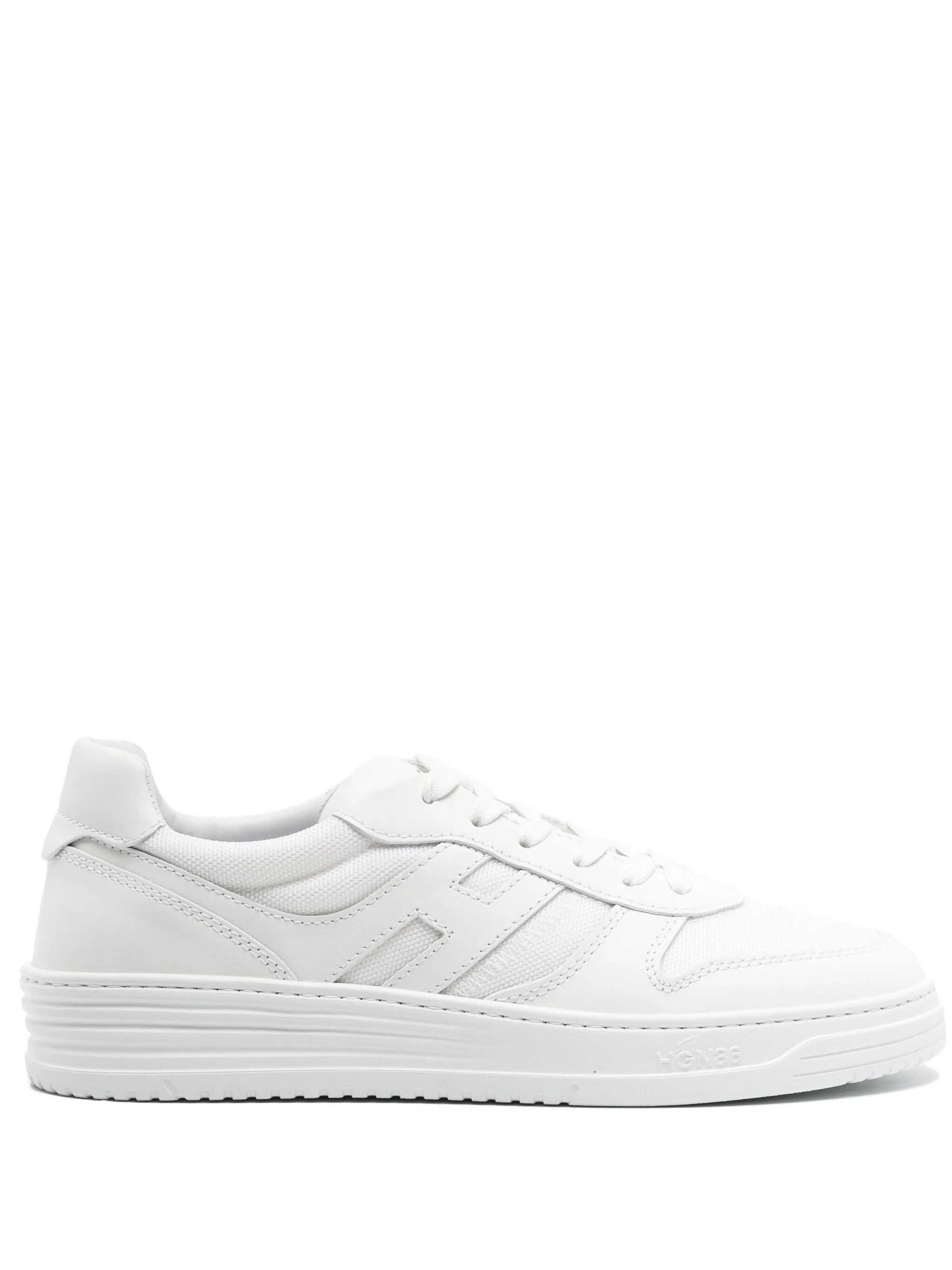 Hogan "H630" sneakers in leather and nylon White. Perforated round toe. "Hogan" logo lettering on the tongue. Lace-up. "H" logo on the side in leather. Memory foam footbed. Rubber sole. "HGN86" logo embossed on the rubber.