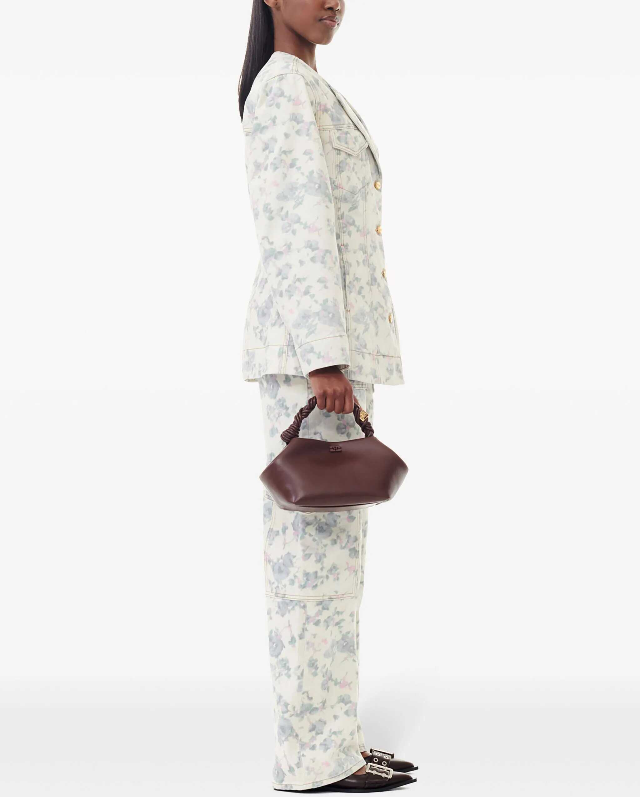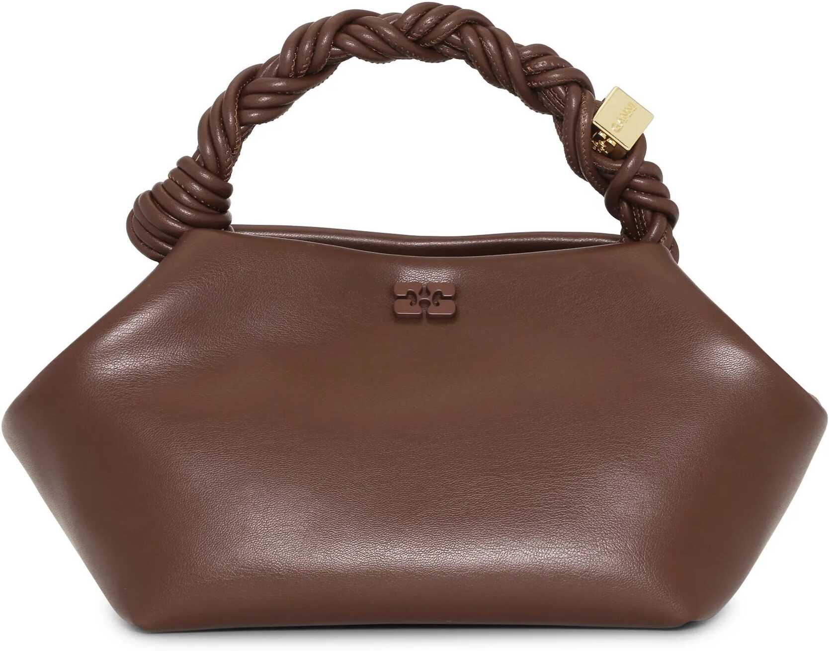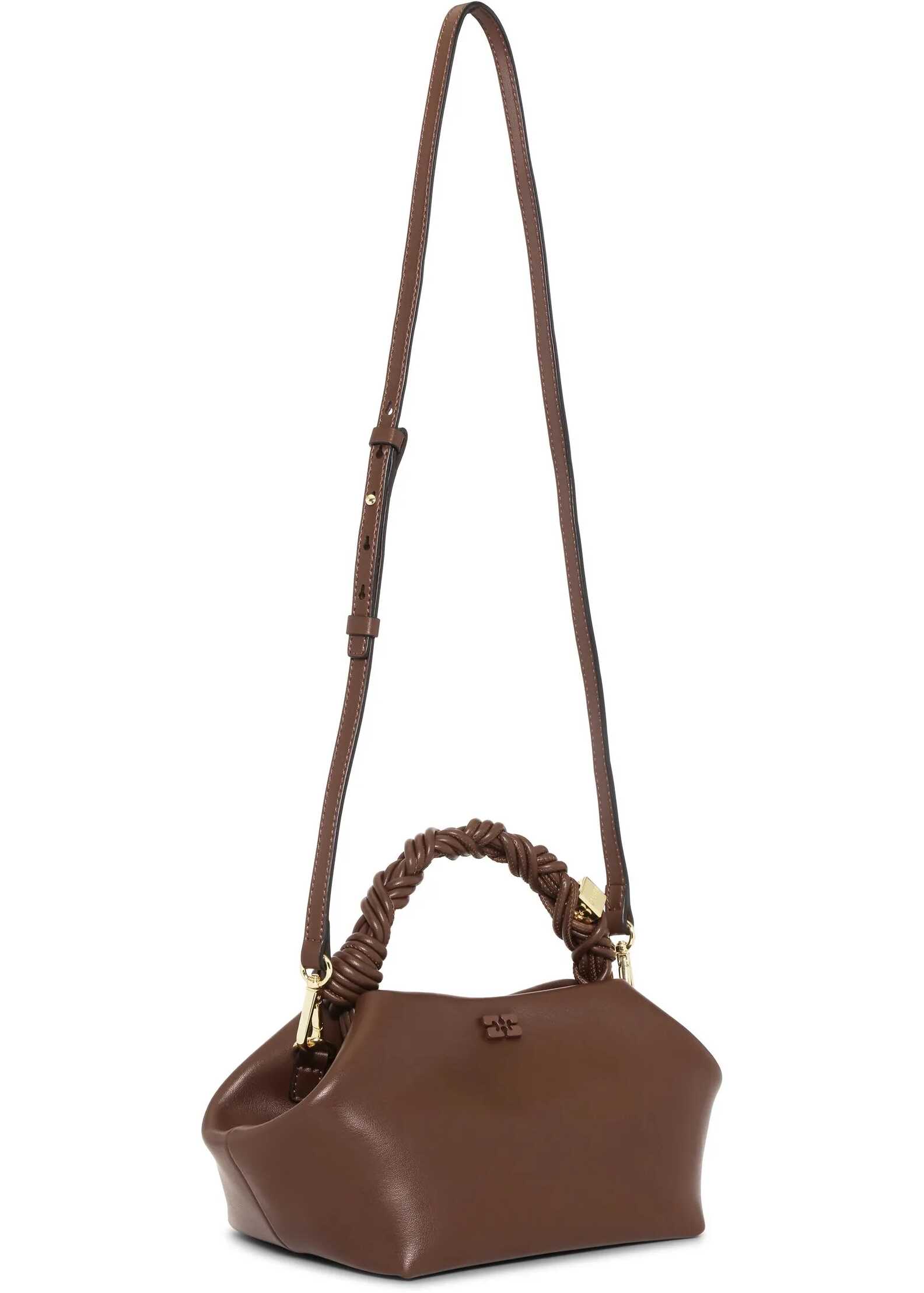 Certified Recycled Calfskin Mini Bou Handbag by Ganni, interior magnet closure, removable and adjustable flat shoulder strap, top handle with braided detail, hexagonal bag design, iconic three-dimensional Butterfly logo applique on front, interior welt pocket, dual interior compartments, metal brand logo dice engraved and applied to handle.