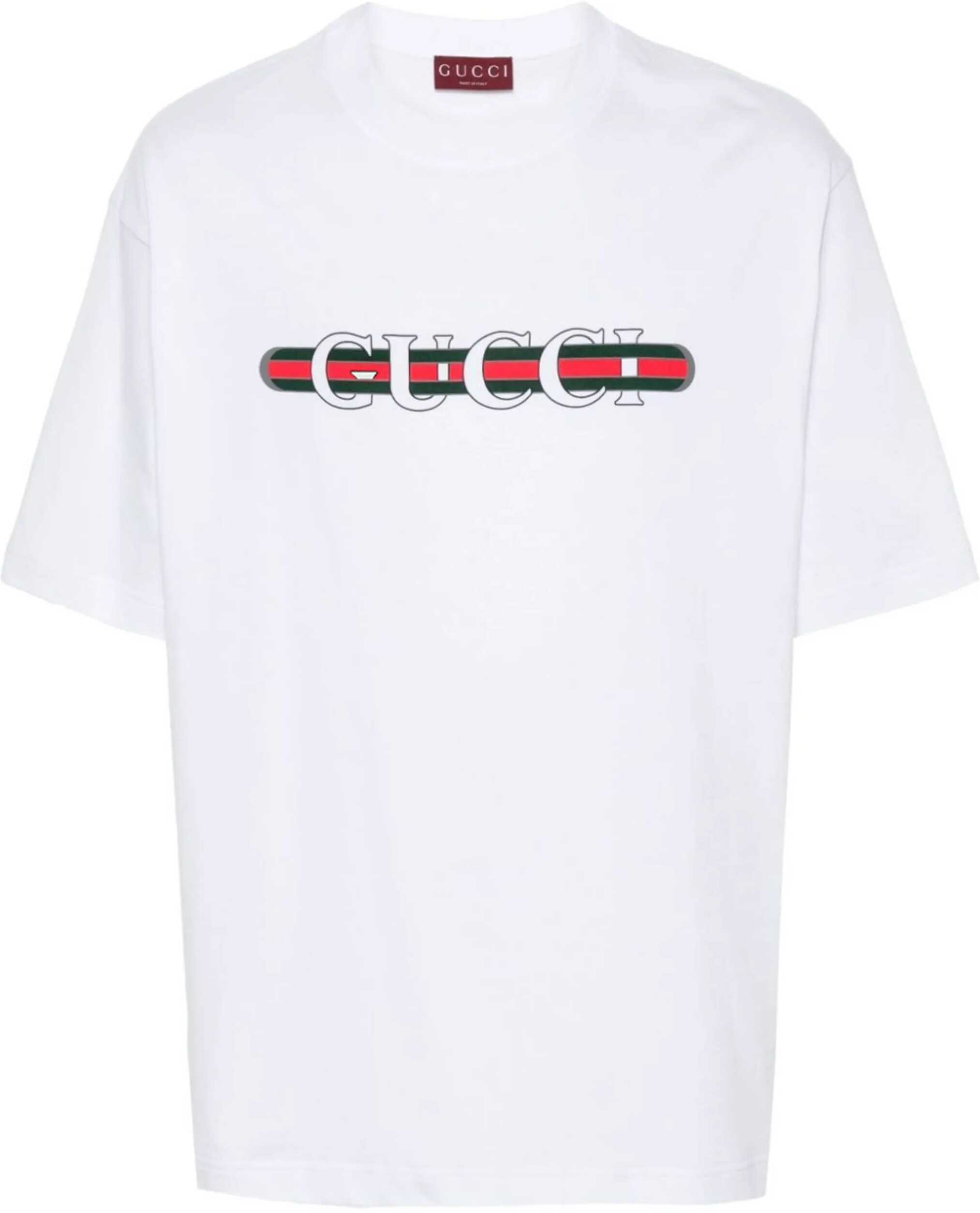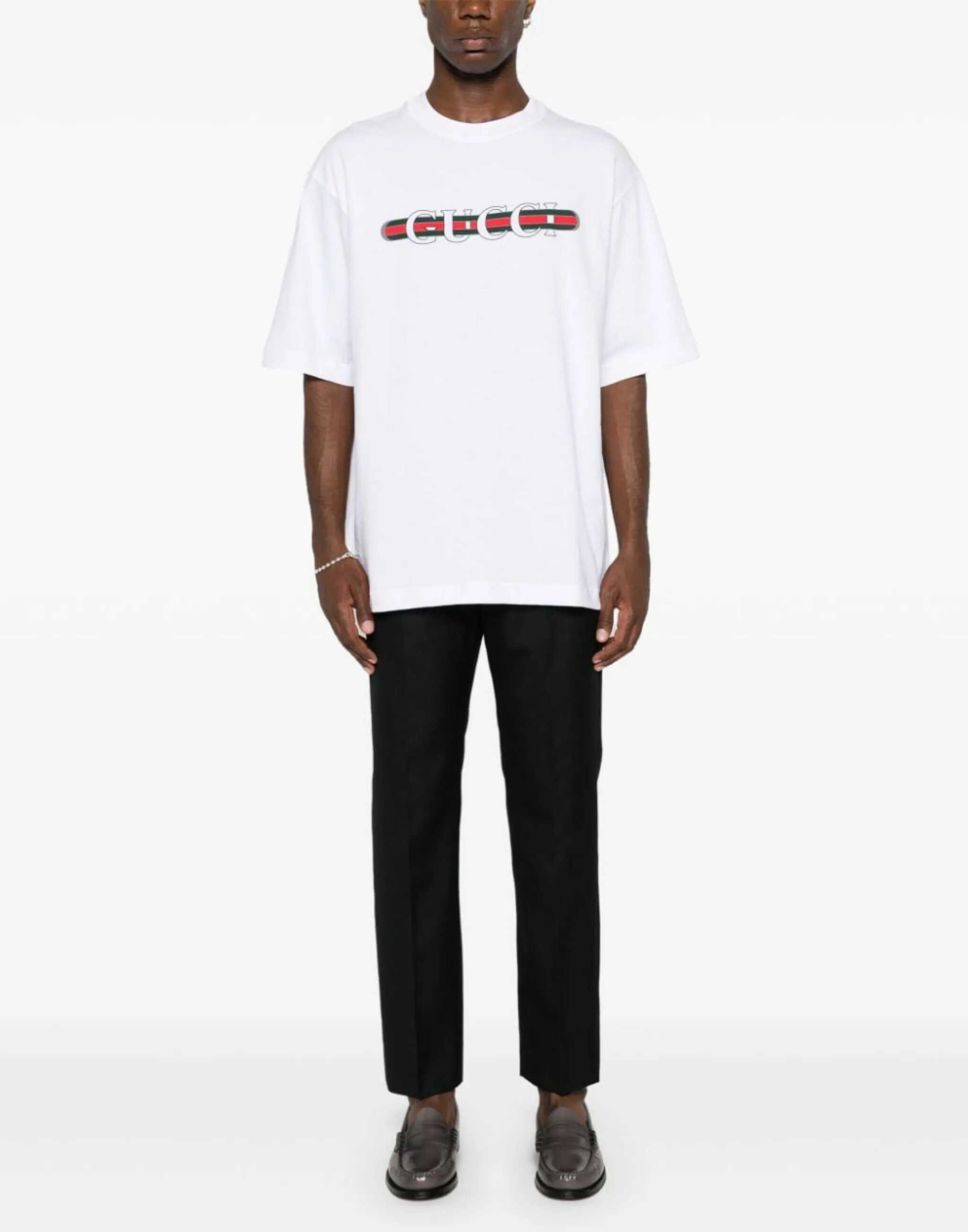 Cotton T-Shirt by Gucci, ribbed crew neck, contrasting iconic brand monogram at front, monochrome pattern, regular fit.