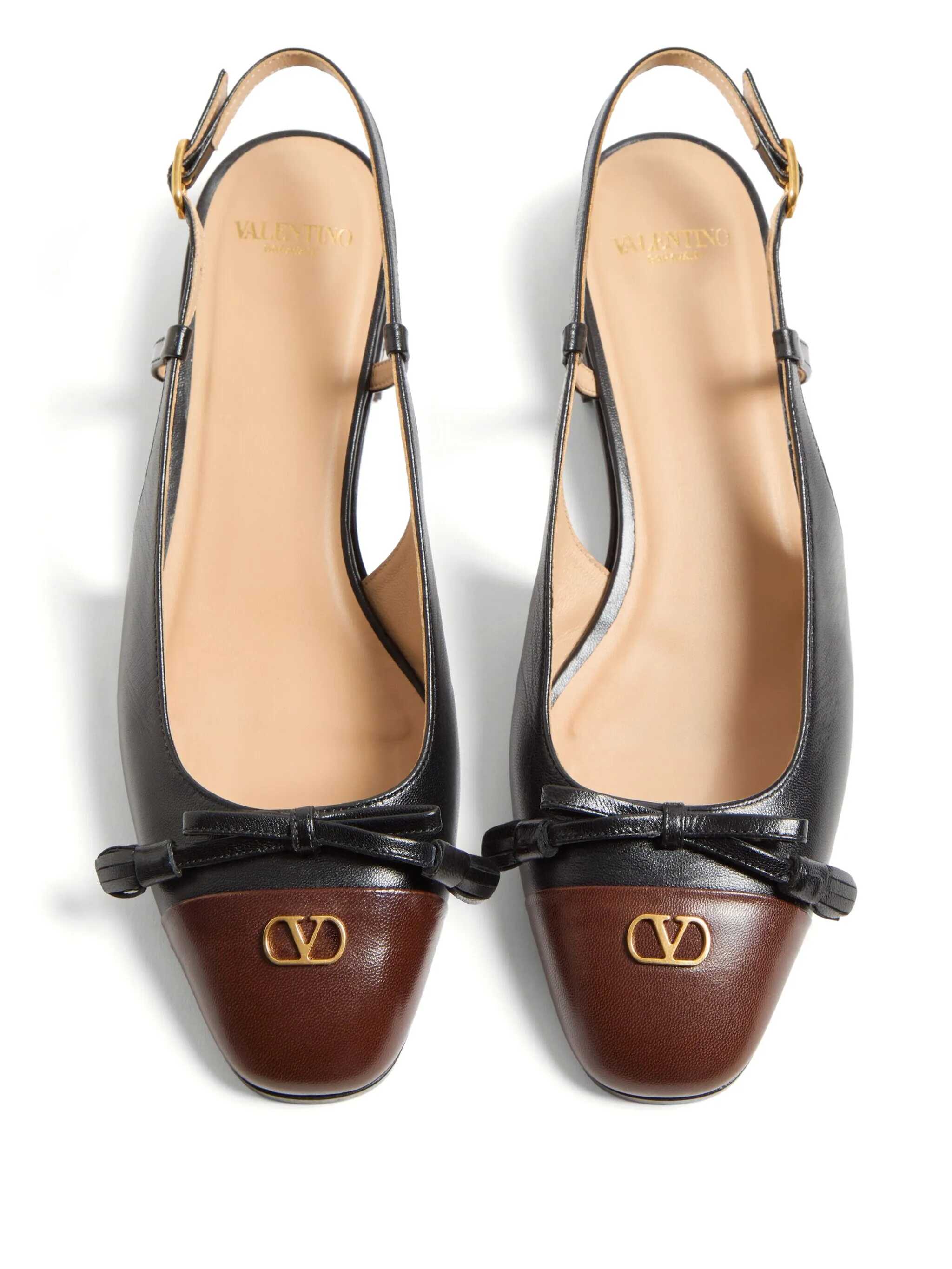 'Valet Du Roi' two-tone leather slingback, VLogo Signature metallic antiqued effect and bow with front tassels, square toe model, adjustable strap, heel, leather sole