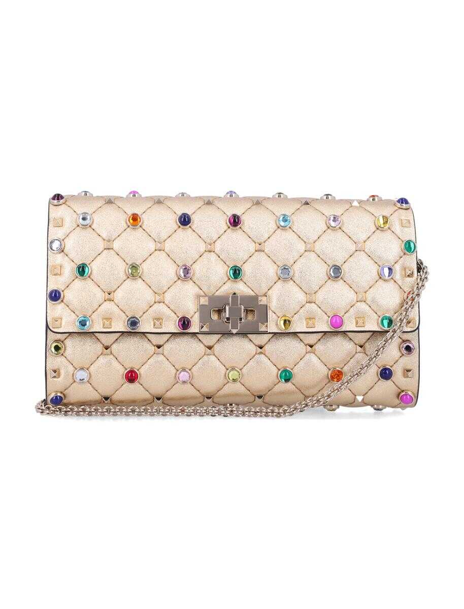 The Valentino Garavani Rockstud Spike bag shines in metallic nappa leather, elevated with multicolor cabochon studs and signature pyramid Rockstud detailing.