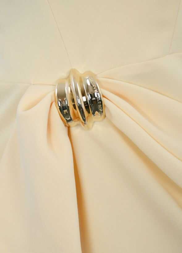 Fluid crêpe dress with mini skirt. The dress stands out for the construction on the hips which gives the effect of a macro bow, embellished with the golden metal jewel decoration on the knot. On the back, eyelets with intertwined laces