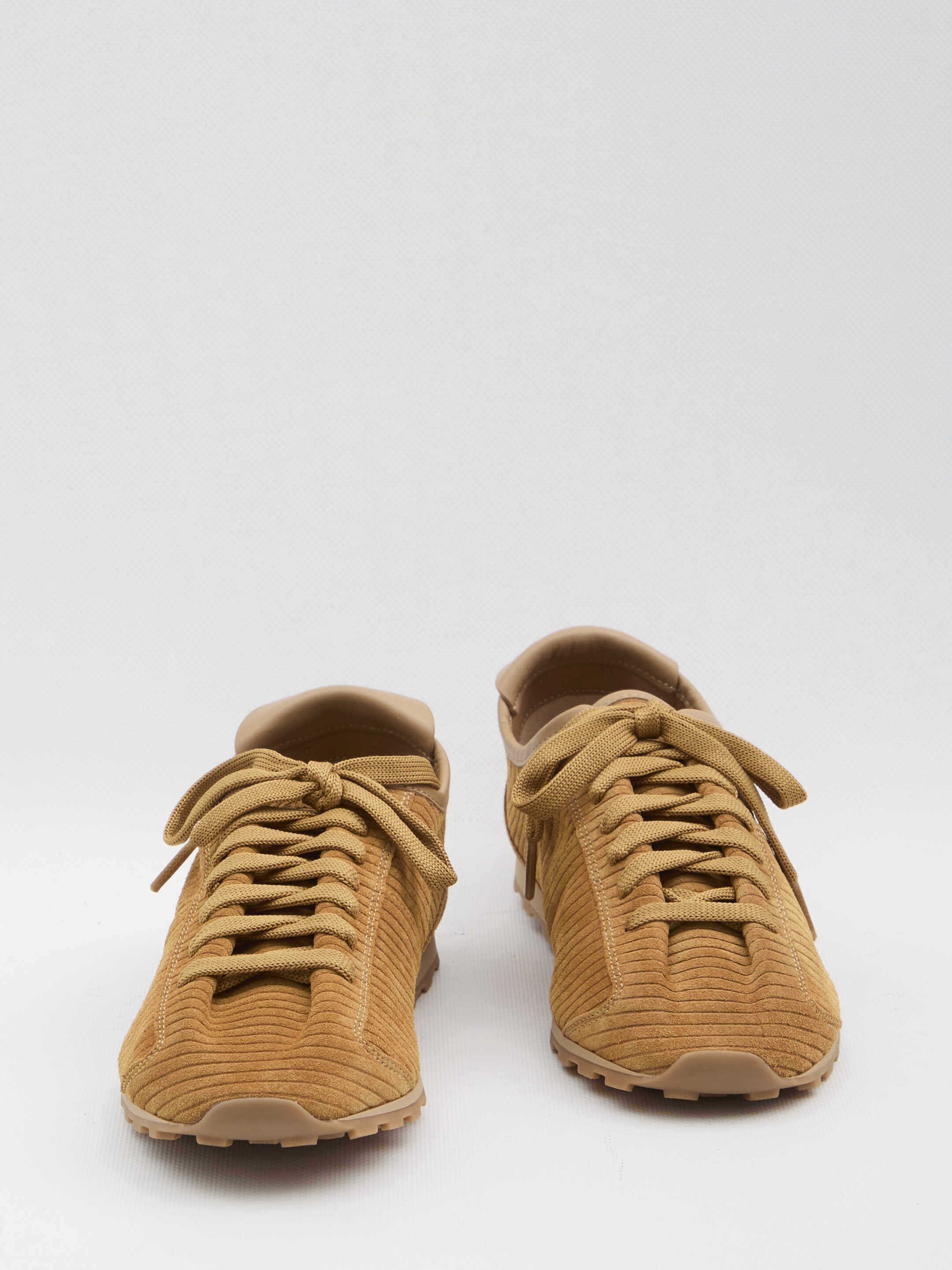 Sneakers in soft camel brown embossed suede leather with crocodile effect. Featuring almond-shaped toe, flat laces, embossed logo on the tongue and heel tab, removable leather-covered insole, and a rubber sole with round and square detailing. Dustbag included. Slim fit sneakers.