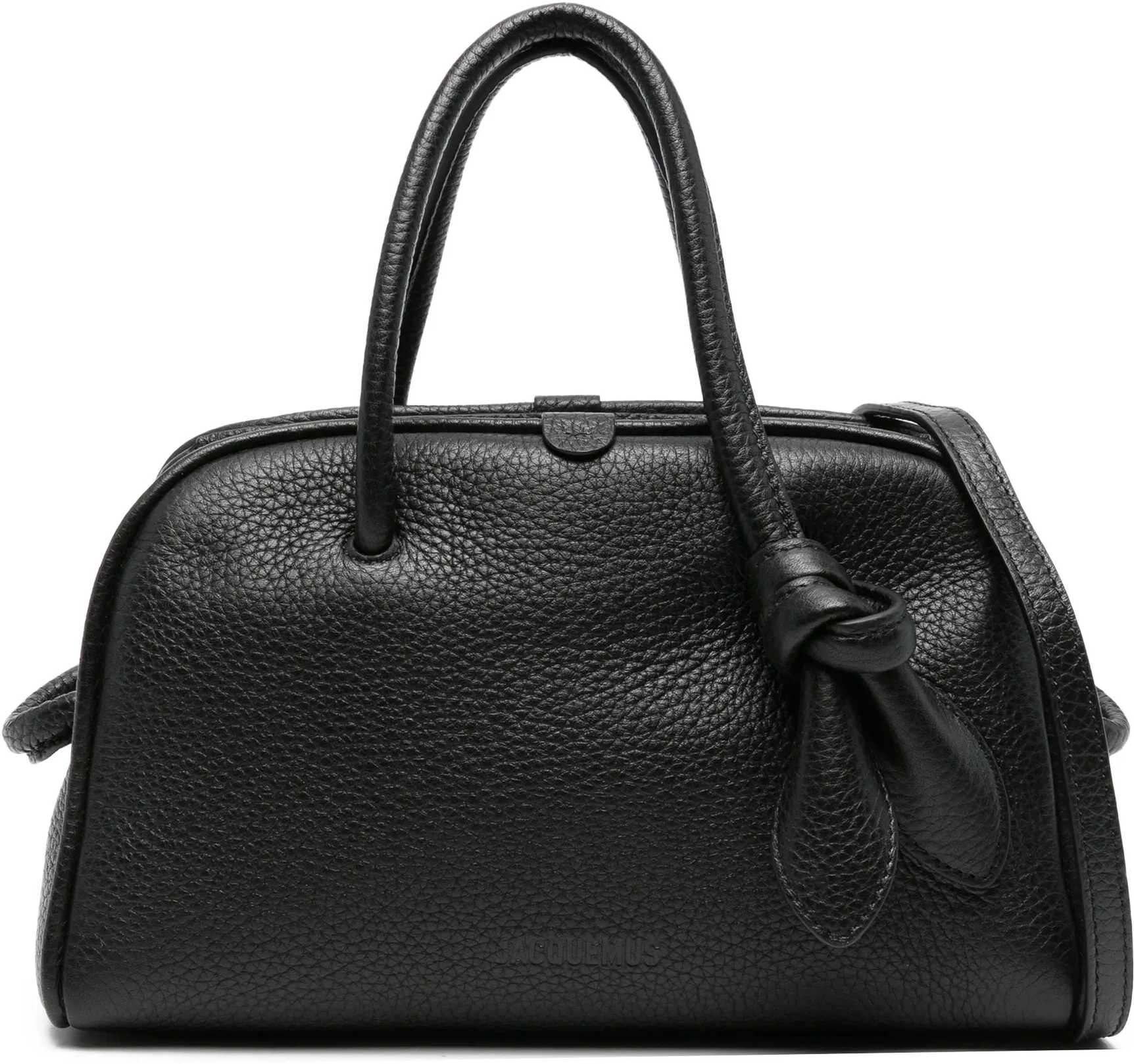 Black grained leather bowling bag. It features fixed handles with bow detail, an adjustable and removable shoulder strap, two side loops, a double zipper closure, one main compartment with a flat pocket. Dustbag included. Any imperfections in the leather should not be considered manufacturing defects but a characteristic of the material.