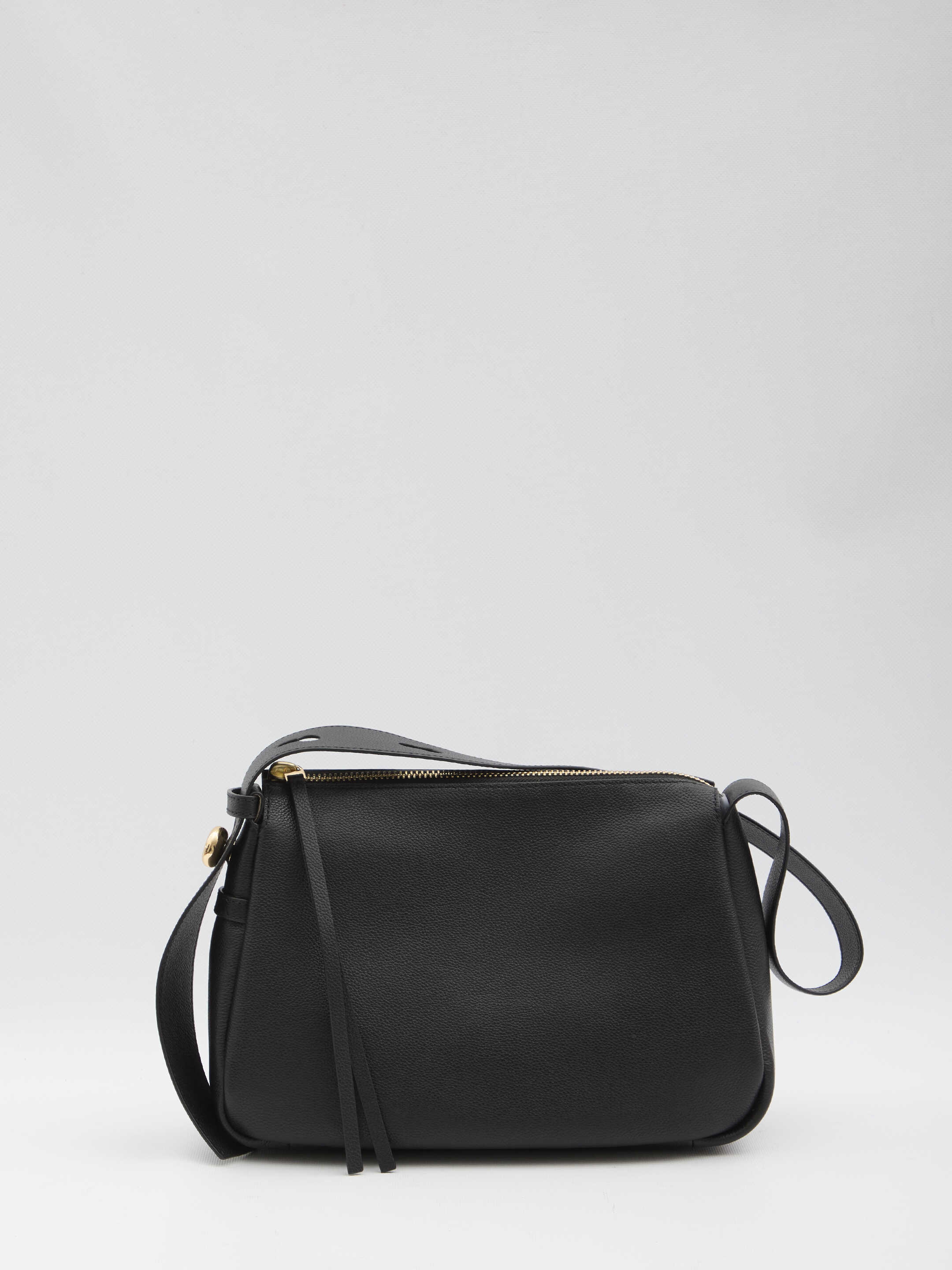 Black grained leather bag. Features an adjustable handle with gold-tone metal logo detail, zip closure with leather pull, one main compartment with an open flat pocket. Dust bag included. Any imperfections in the leather should not be considered manufacturing defects but a characteristic of the material.