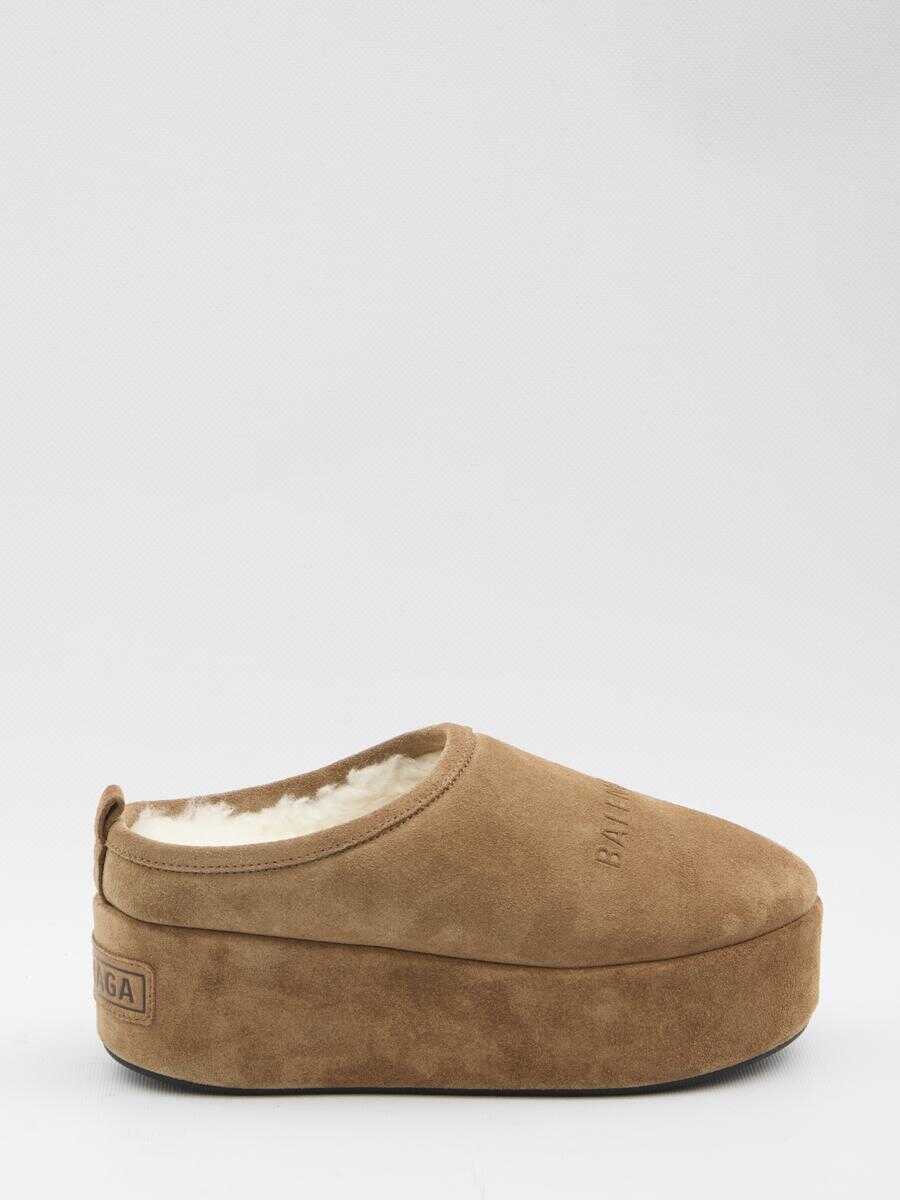 Sabots in brown calf suede with fake shearling, polyester, and acrylic. Featuring rounded toe, Balenciaga logo on the upper, printed Balenciaga logo and details on the back, open heel. Dustbag included.