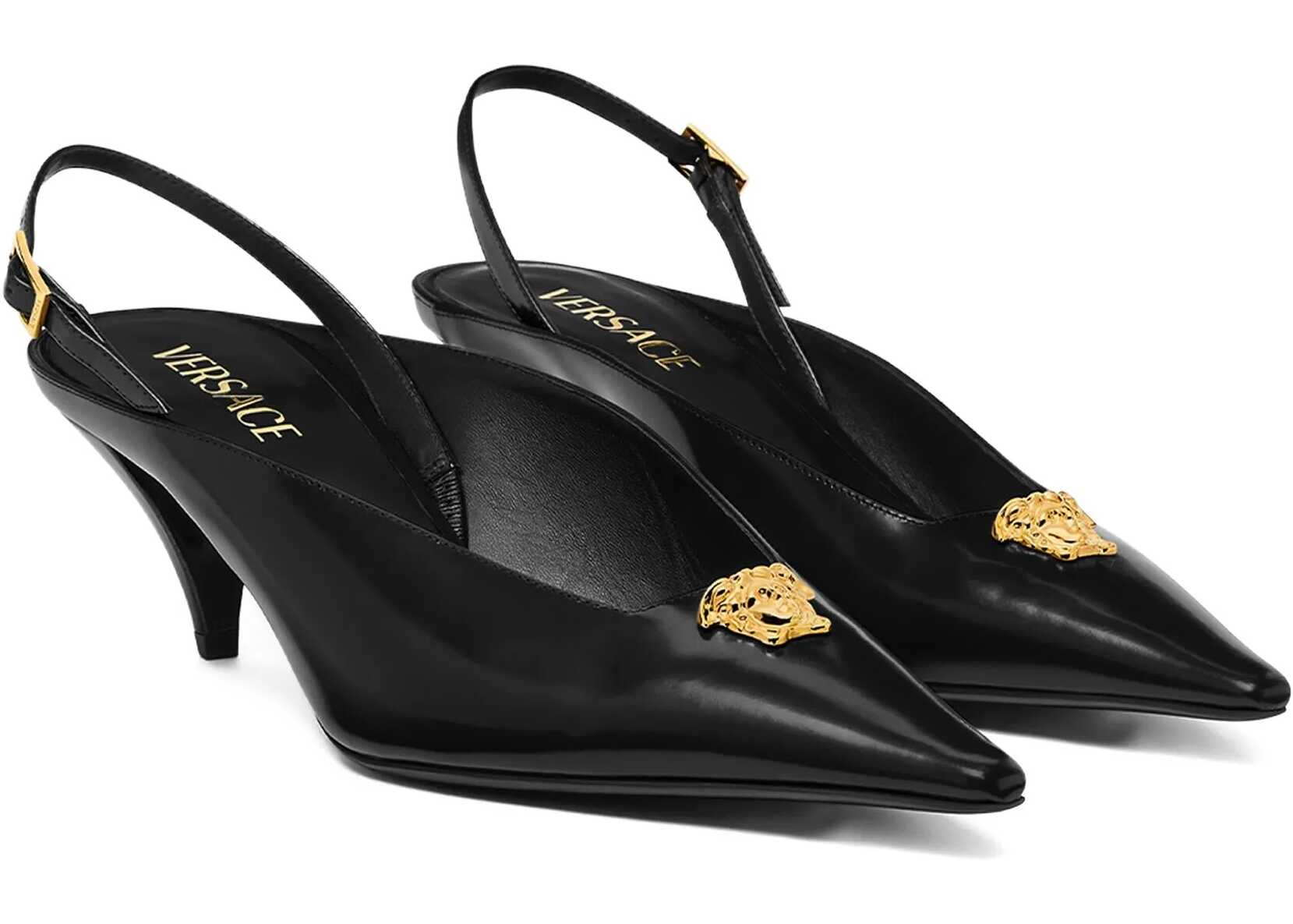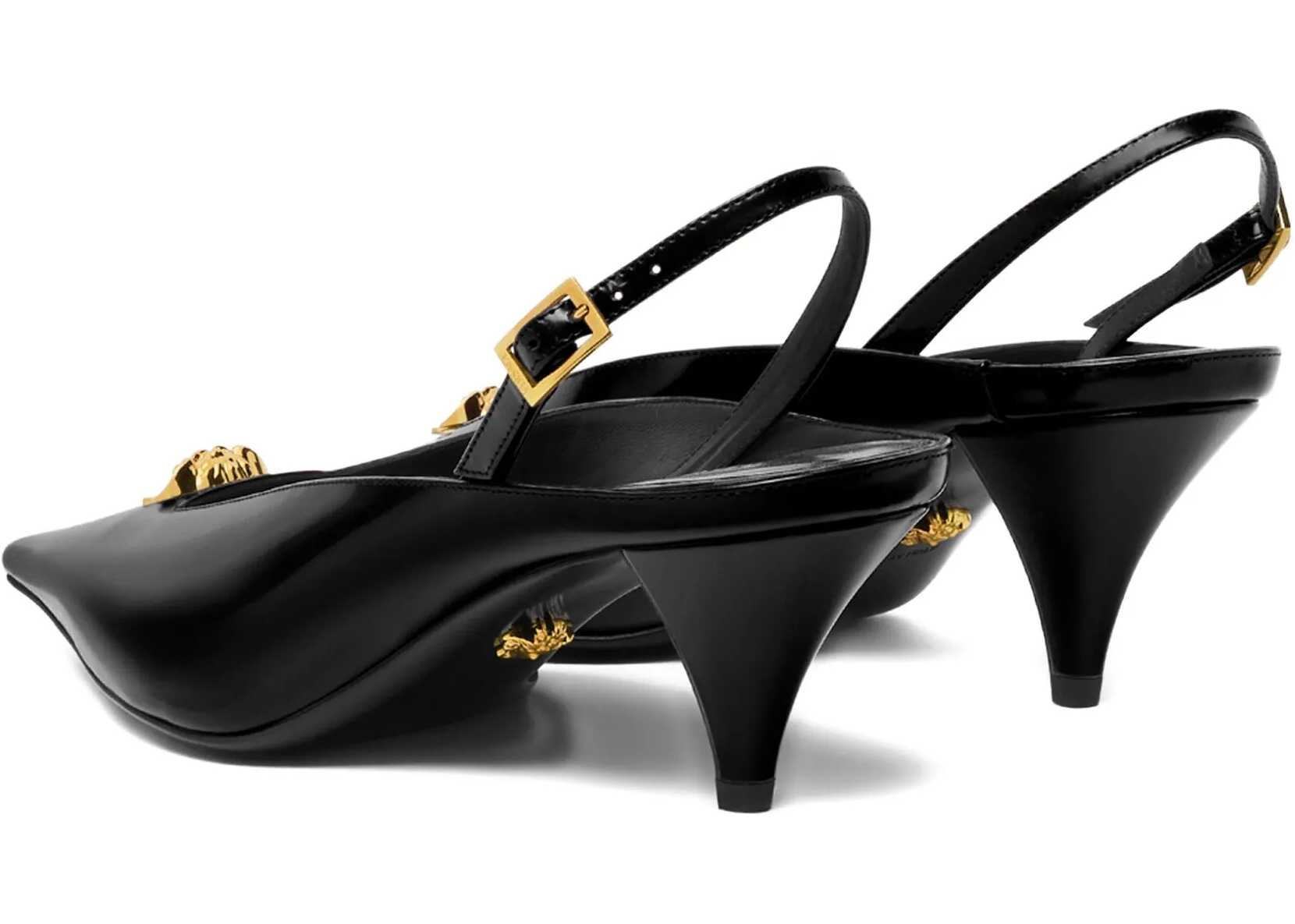 La Medusa slingback Pumps by Versace combine elegance and iconic identity in a refined design. Crafted from glossy calfskin, they feature a pointed silhouette and a low heel that makes them comfortable and versatile. The adjustable ankle strap ensures a secure fit, while the three-dimensional La Medusa accessory on the front adds a distinctive touch typical of Versace's bold style.