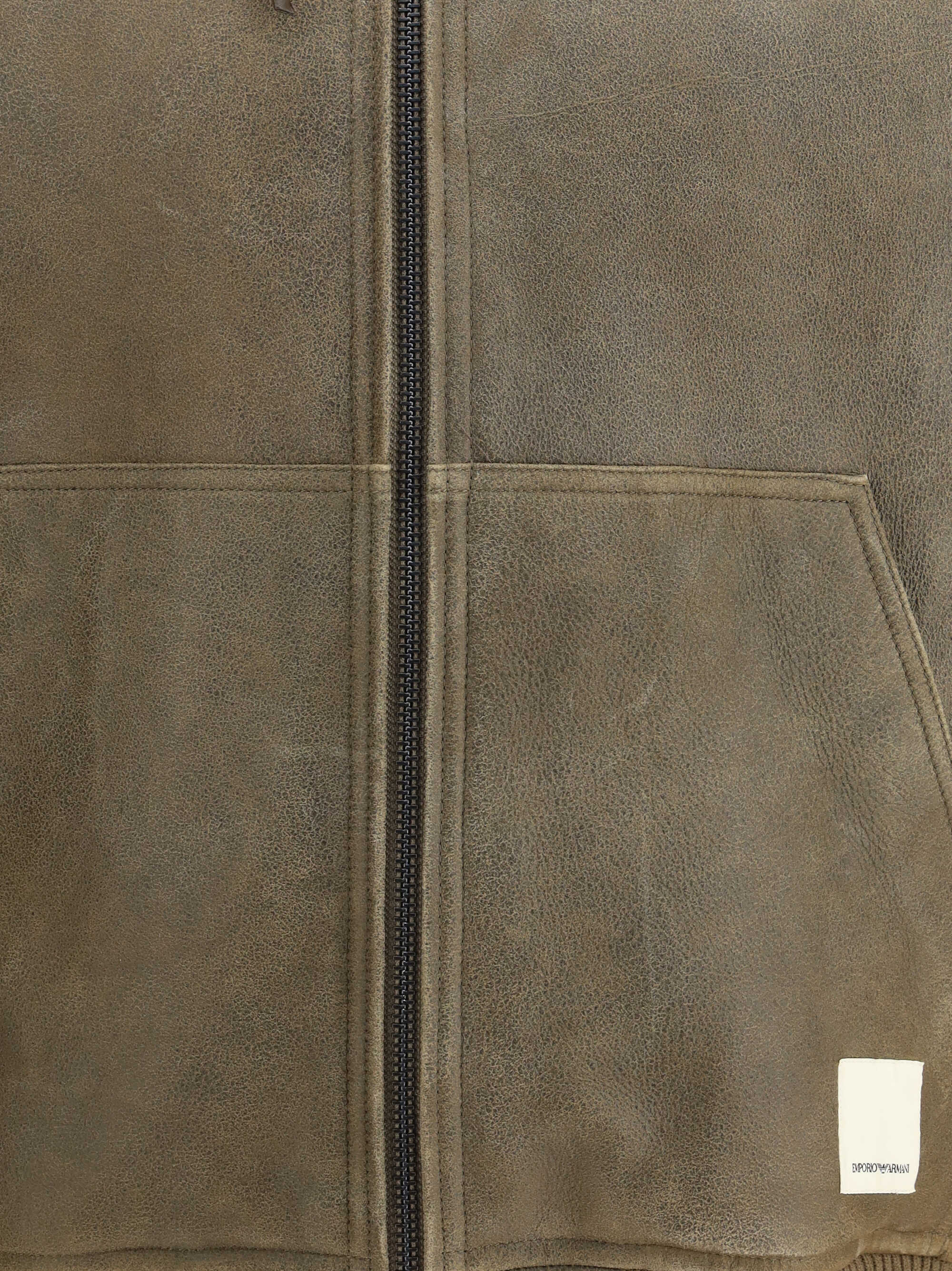 Emporio Armani's leather Bomber Jacket combines urban style with functional details. Featuring an adjustable drawstring hood and a double-slider front zipper closure, it has two patch pockets on the front, ribbed fleece cuffs and hem for a comfortable fit. Completing the design is the logo patch on the front for a distinctive and contemporary touch.