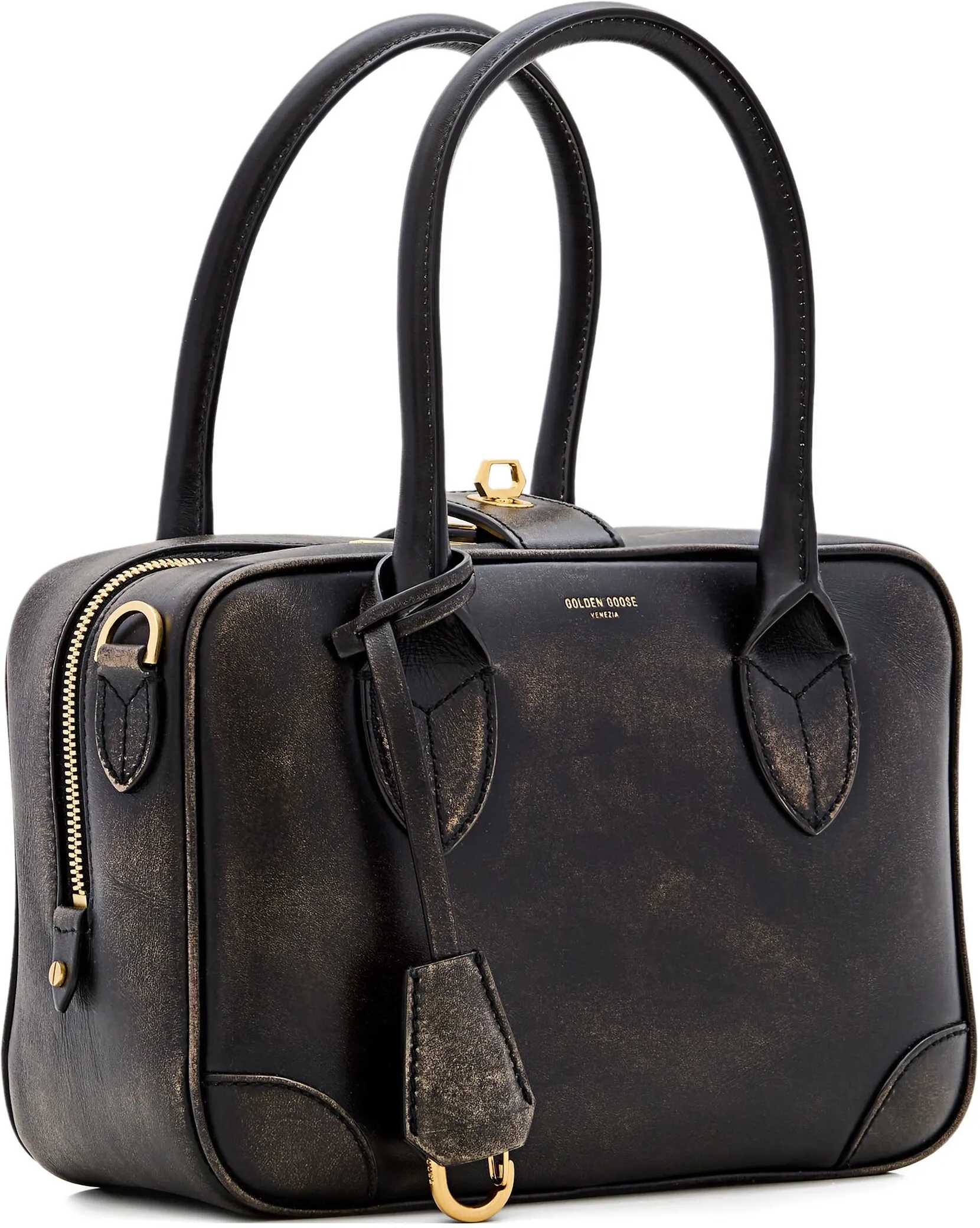 Black leather bag. Features fixed double handles, a removable key holder, an adjustable and removable shoulder strap, twist-lock closure with gold-toned hardware, double-zip closure, one main compartment with a zip pocket and three flat pockets, and gold-toned metal feet and details. Cotton lining. Vintage finish. Dust bag included. Any irregularities in the leather are not to be considered defects, but distinctive features that highlight the natural quality of the material.