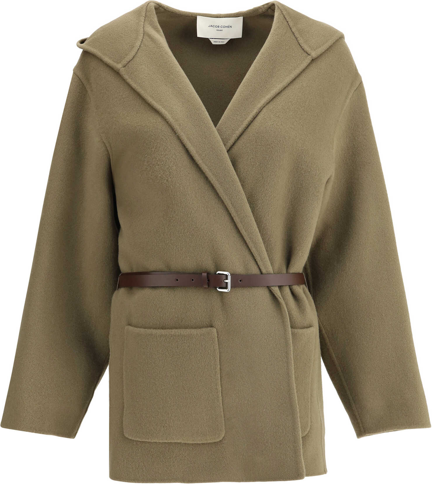 Jacob Cohën's Double wool cloth caban Jacket is an elegant, wrap-around piece made of fine cream-colored brushed wool. Featuring a hooded design with a belted waist, it has a double-knit fabrication that enhances its quality craftsmanship. Patch pockets complete the look with a functional and refined touch.