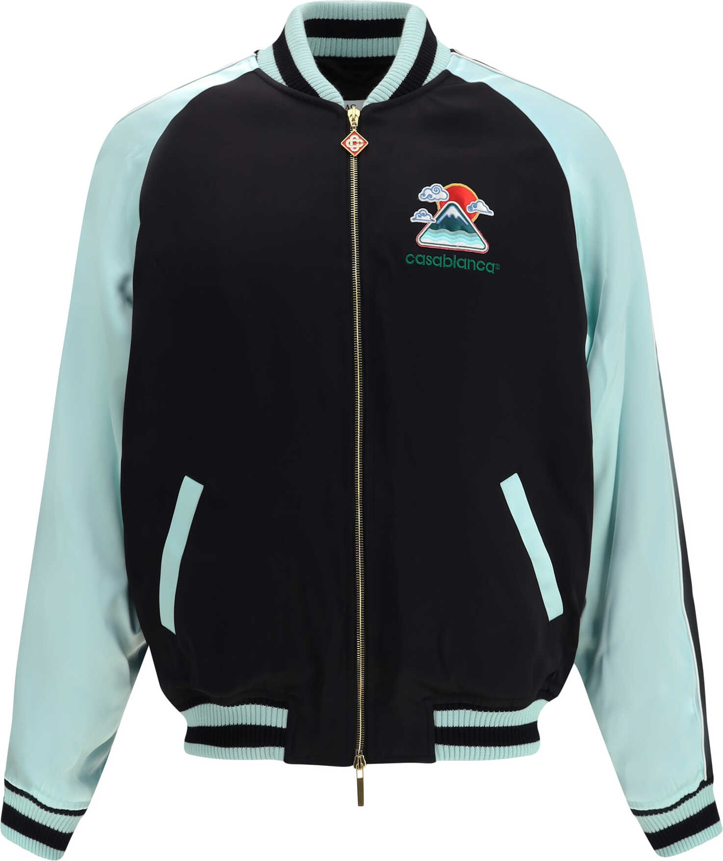 Casablanca's two-tone satin bomber Jacket combines elegance and comfort with a refined viscose satin design. Featuring logo embroidery on the chest and back, it has a ribbed collar, cuffs and hem for a classic look. A zipper closure and two front slit pockets complete the garment, which is also lined for a comfortable fit.