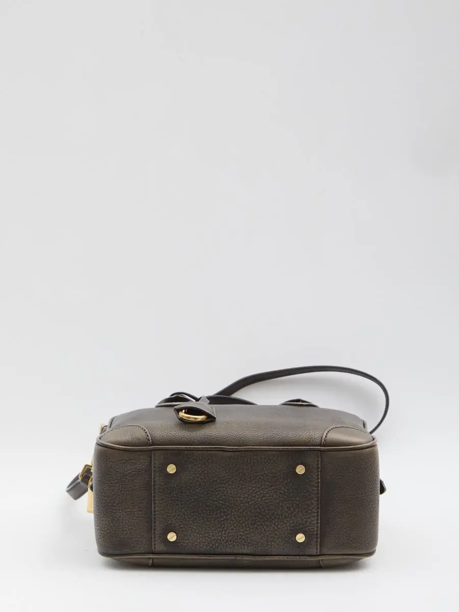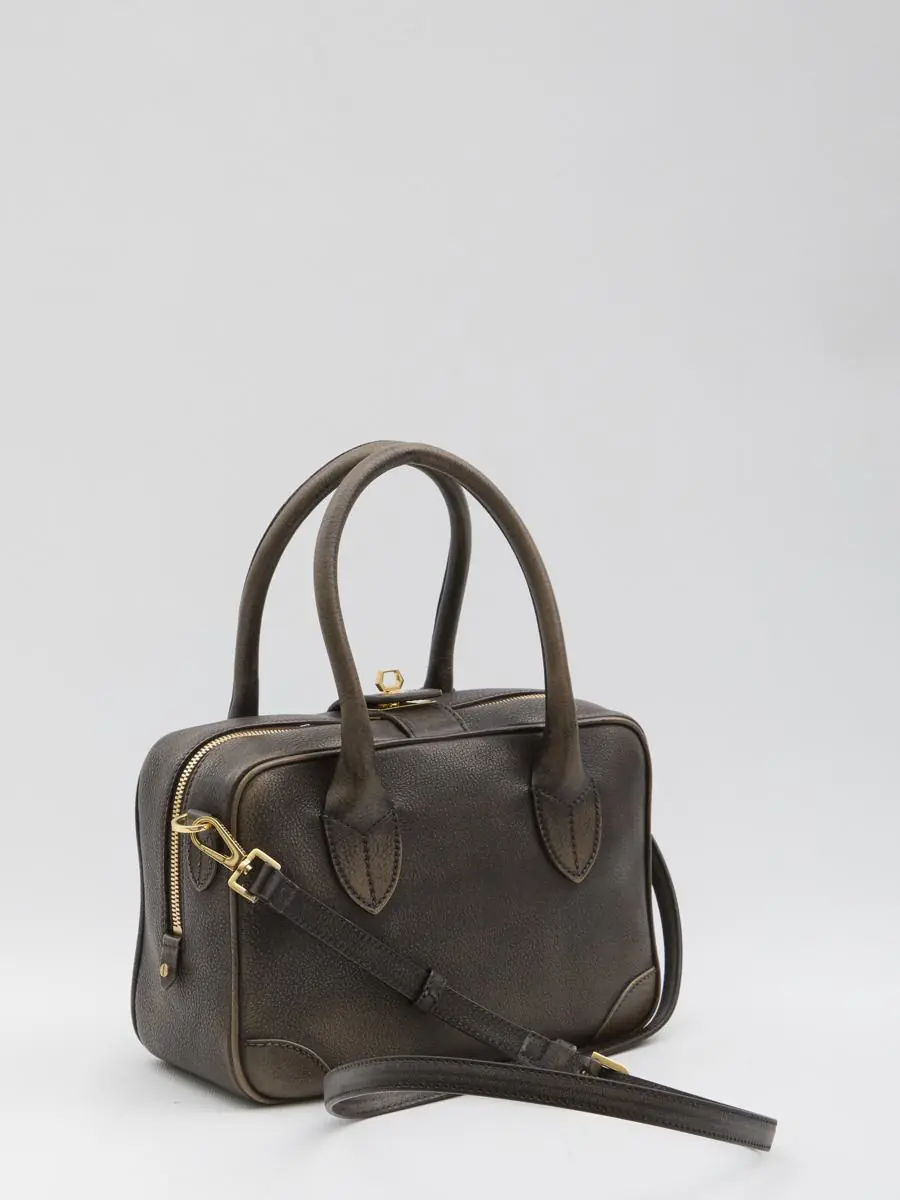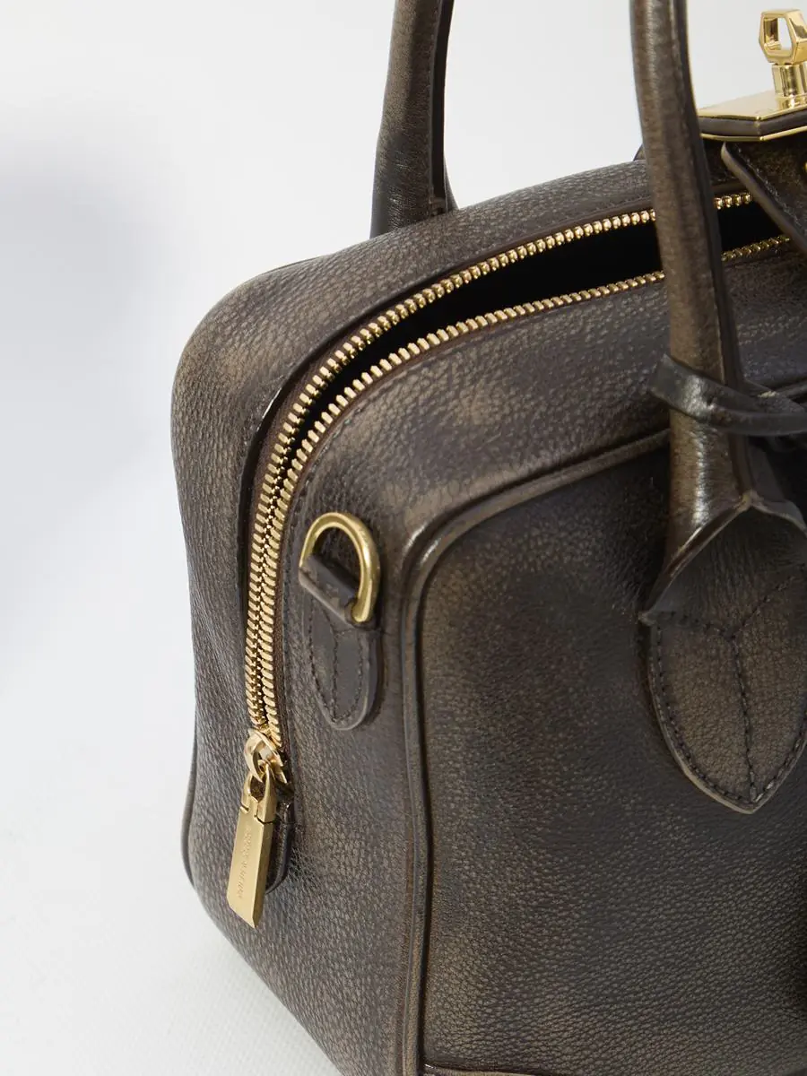Brown leather bag. Features fixed double handles, a removable key holder, an adjustable and removable shoulder strap, twist-lock closure with gold-toned hardware, double-zip closure, one main compartment with a zip pocket and three flat pockets, and gold-toned metal feet and details. Vintage finish. Dust bag included.